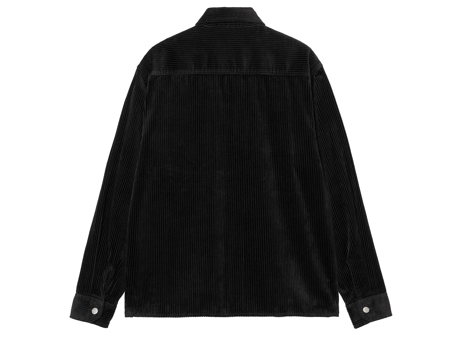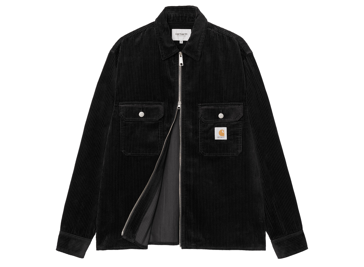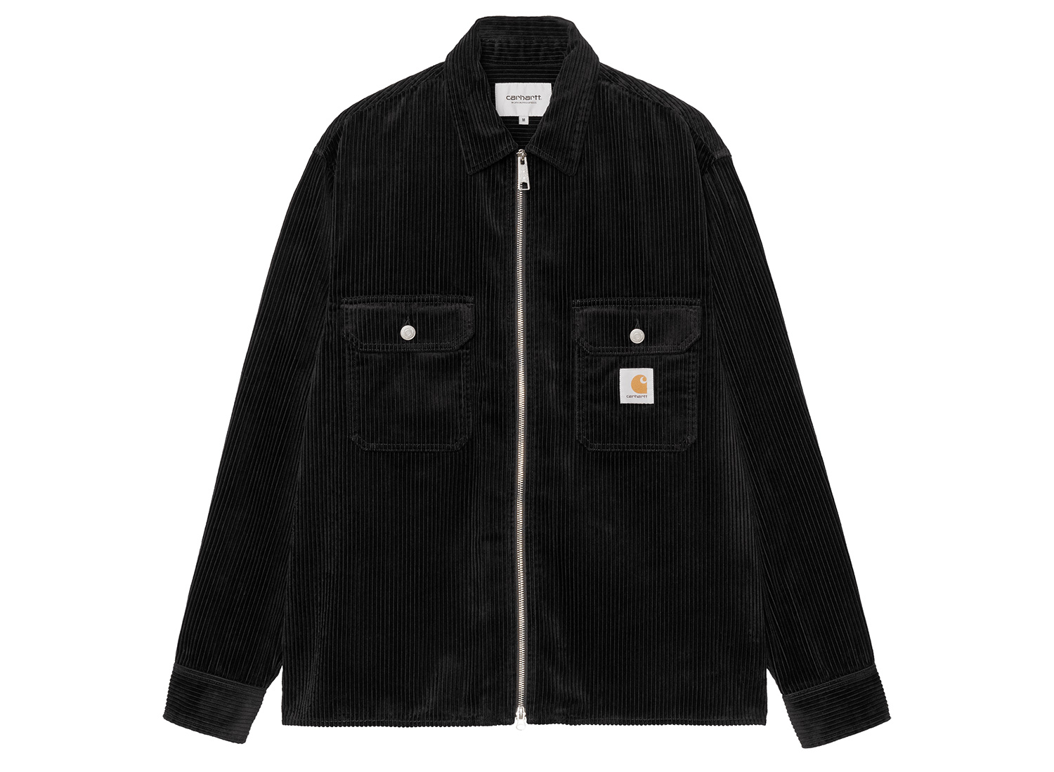 CARHARTT WIP Reynold Shirt Jac Black Rinsed I036049_89_02_03. Unlined overshirt in 100% semi-weight cotton corduroy. Two-way zip. Two chest pockets with buttoned flaps. Branded buttons. Square Label.