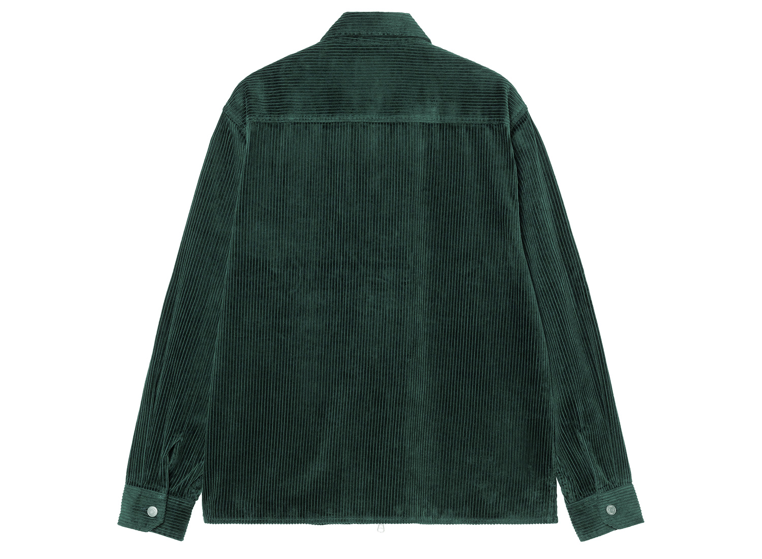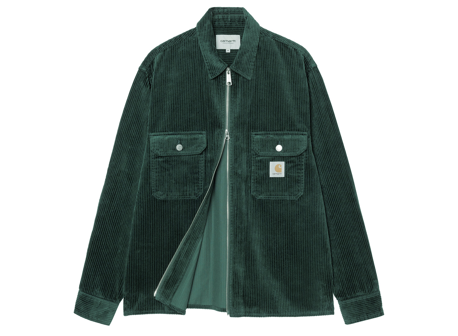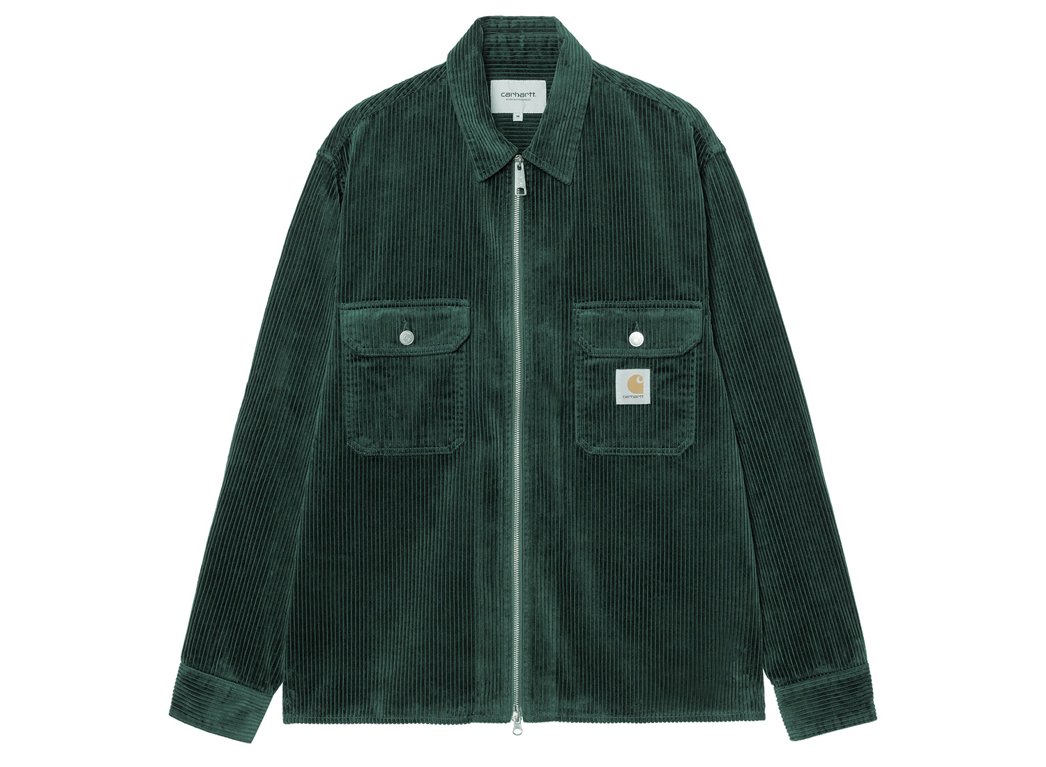 CARHARTT WIP Reynold Shirt Jac Dark Fir Rinsed I036049_05A_02_03. Unlined overshirt in 100% semi-weight cotton corduroy. Two-way zip. Two chest pockets with buttoned flaps. Branded buttons. Square Label.