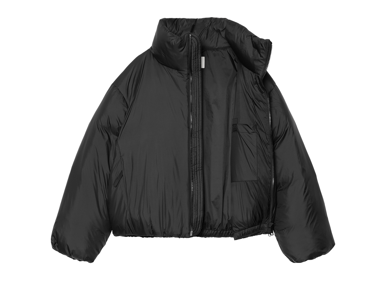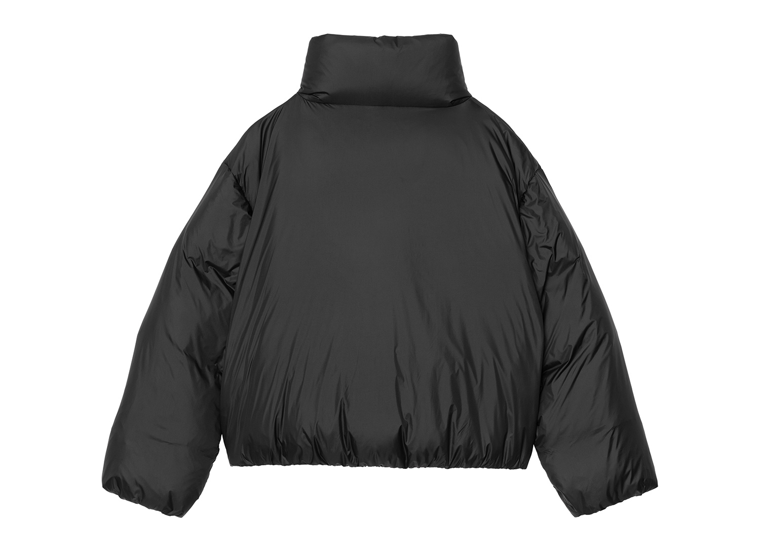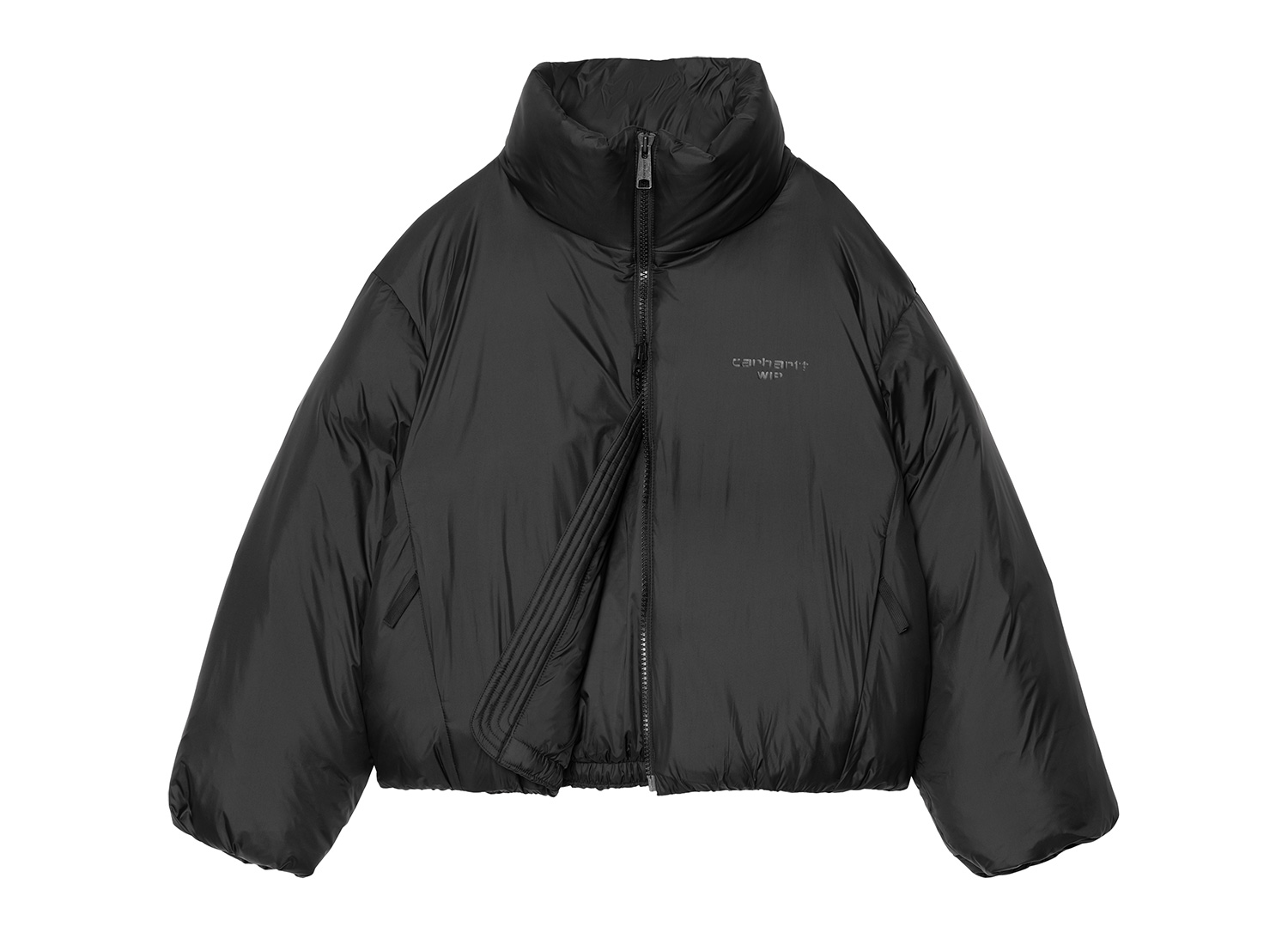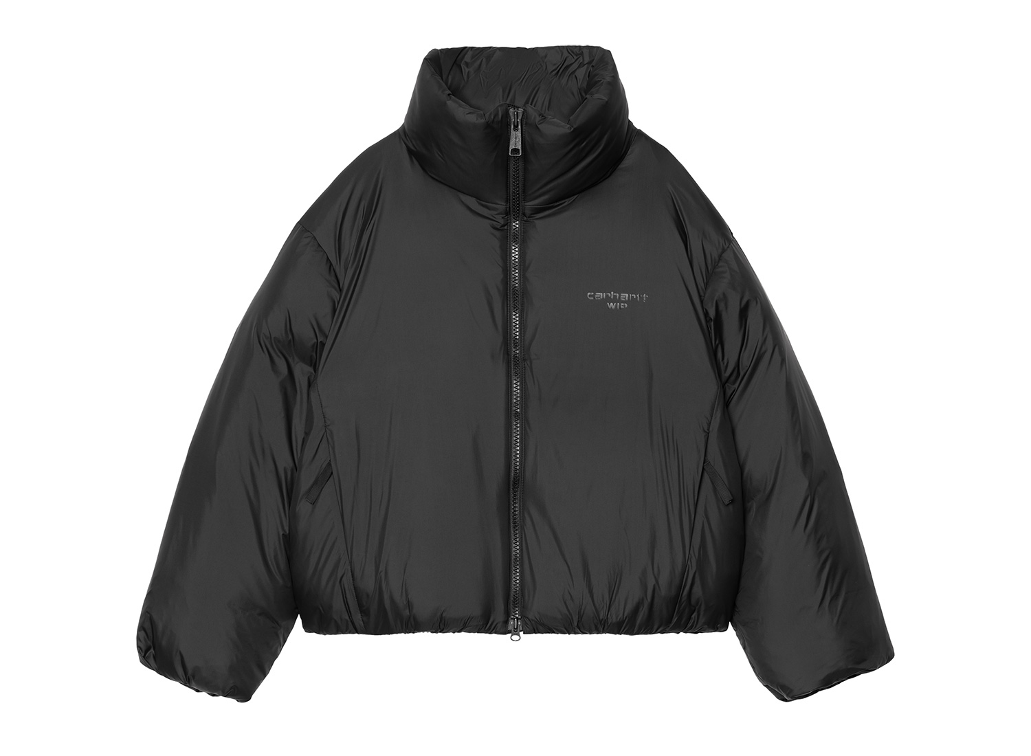 CARHARTT WIP Women Demi Jacket Black I035377_89_XX_03. Women's jacket in lightweight recycled nylon taffeta. Synthetic down padding. Polyester lining. Stand-up collar. Elasticated cuffs and adjustable hem. Two-way zipper. Two side zippered pockets. Script logo printed on the chest.
