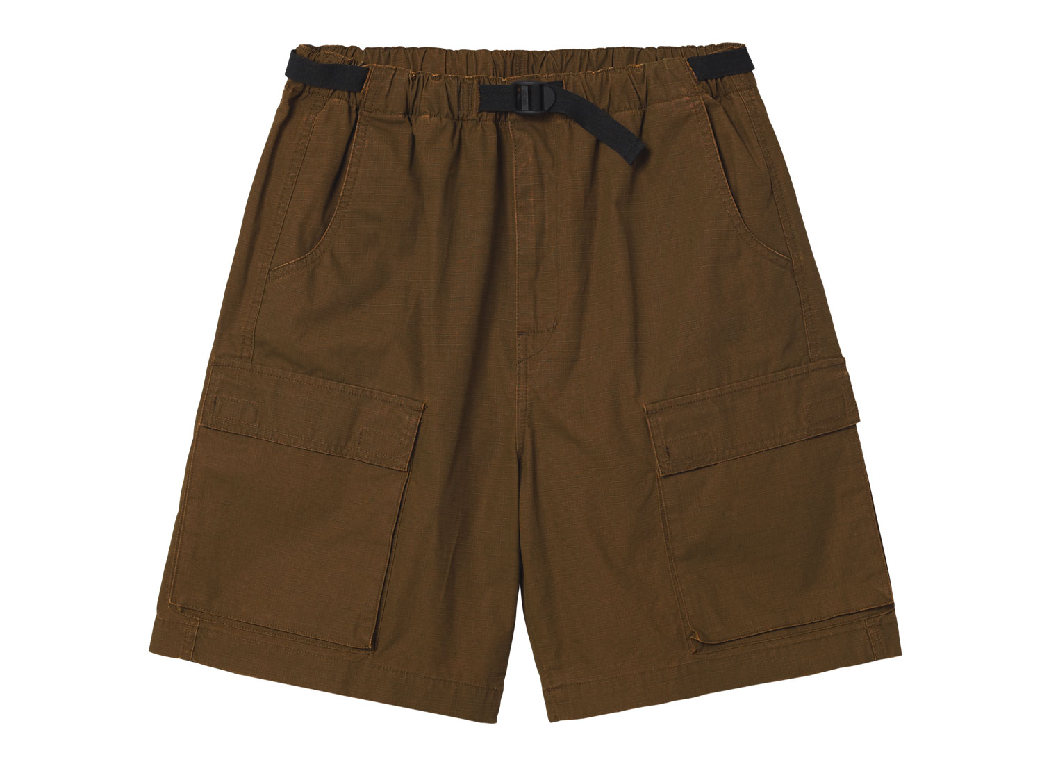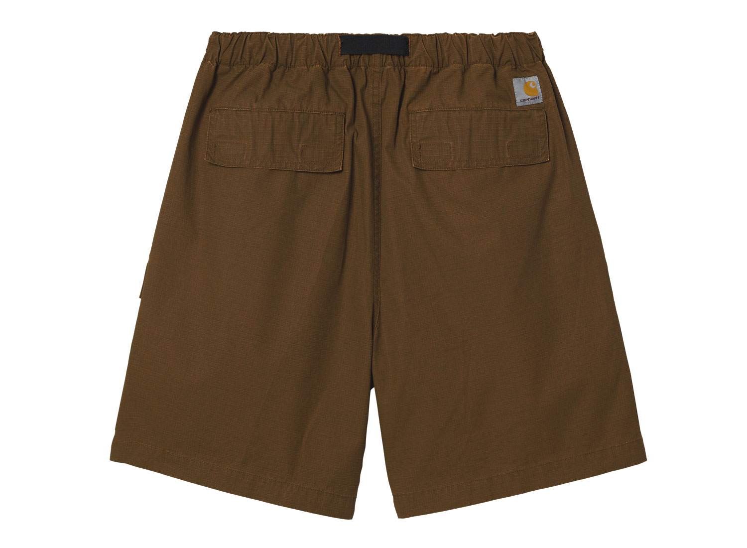 CARHARTT WIP Wynton Short Hamilton Brown / Hokkaido I030482. Relaxed fit cargo shorts crafted in ripstop cotton. Adjustable belt integrated into the elasticated waistband. Back and side pockets with flap and velcro closures. Reinforced stitched seams on areas subject to chafing. Square label.