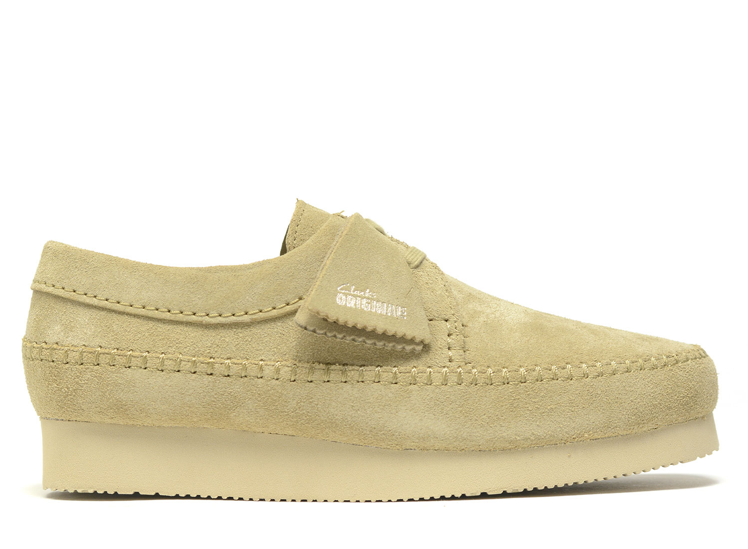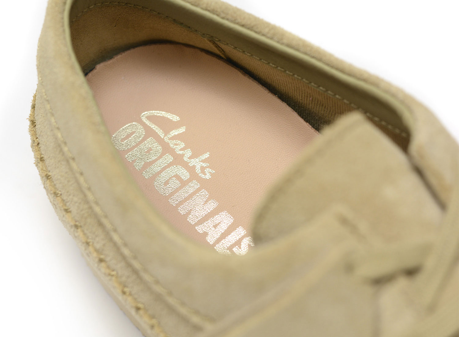 Hot-embossed Clarks Originals metal logo on leather insole.