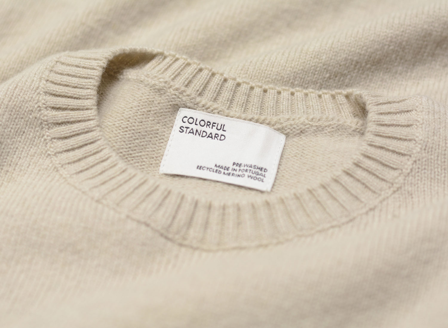 COLORFUL STANDARD Merino Wool Crew Ivory White. 100% Italian Extra Fine Merino Wool. Woolmark certified yarn. Pre-washed. Made in Portugal.