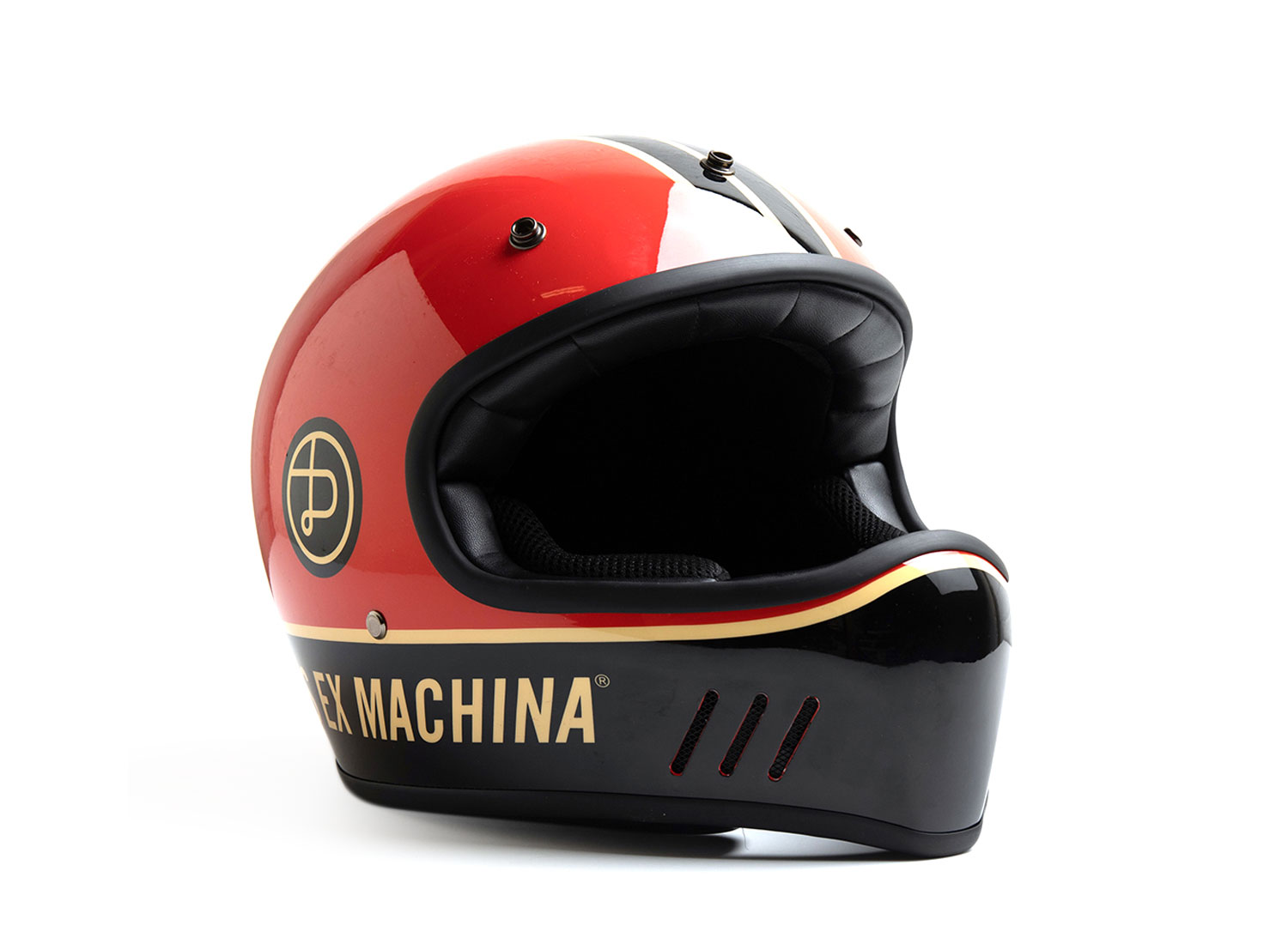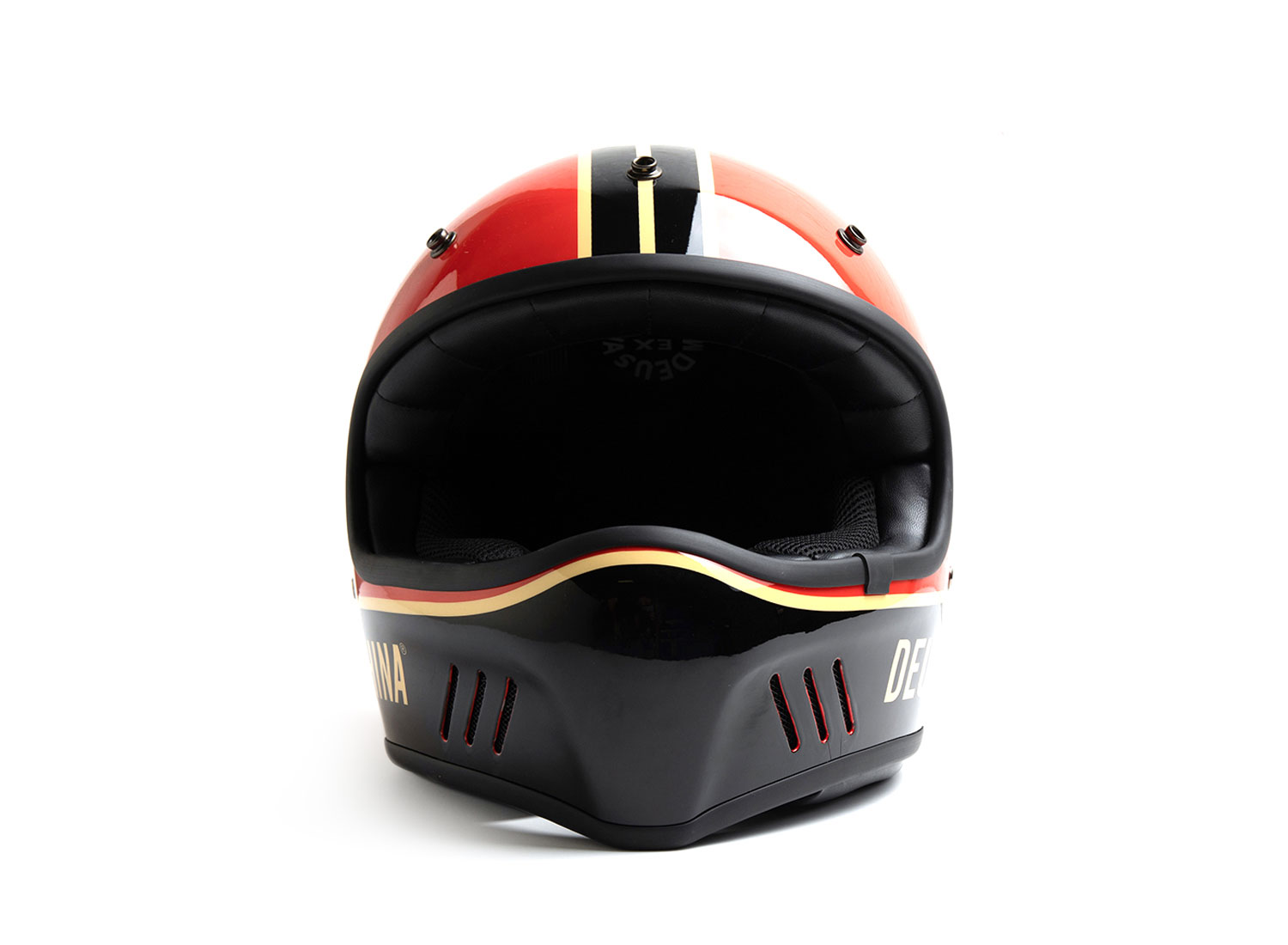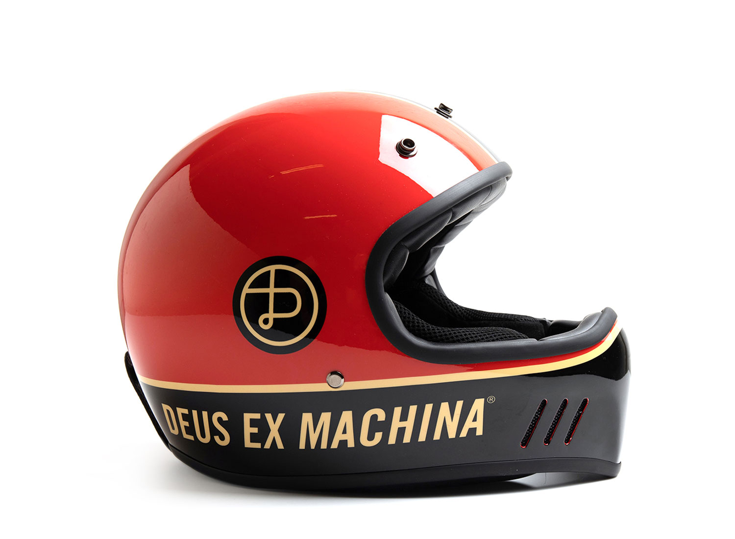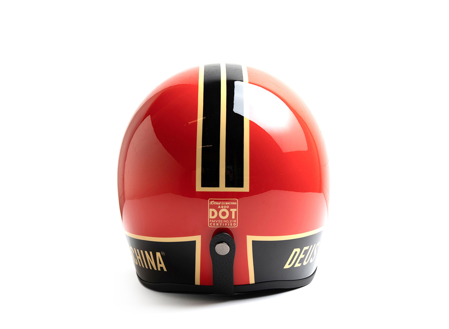 DEUS EX MACHINA Loop D Helmet Red. DEUS EX MACHINA motorcycle helmet in high-quality fiberglass, with a removable and washable interior in antimicrobial imitation leather. Equipped with three snaps to attach visors or protective visors. Vents at the chin for optimal comfort. Hand-painted designs. Compliance: ECE 05, DOT. Closure: Double-D buckle. Weight: 1400-1500 ± 50gr. Comes with a matte black visor and a protective cover.