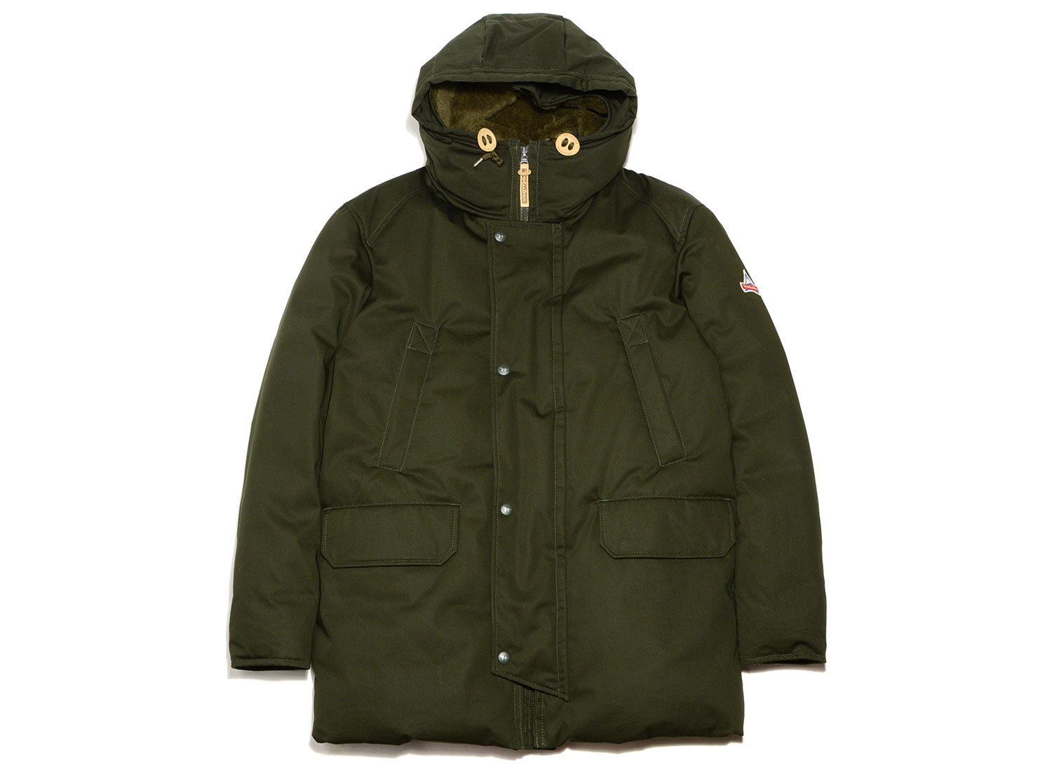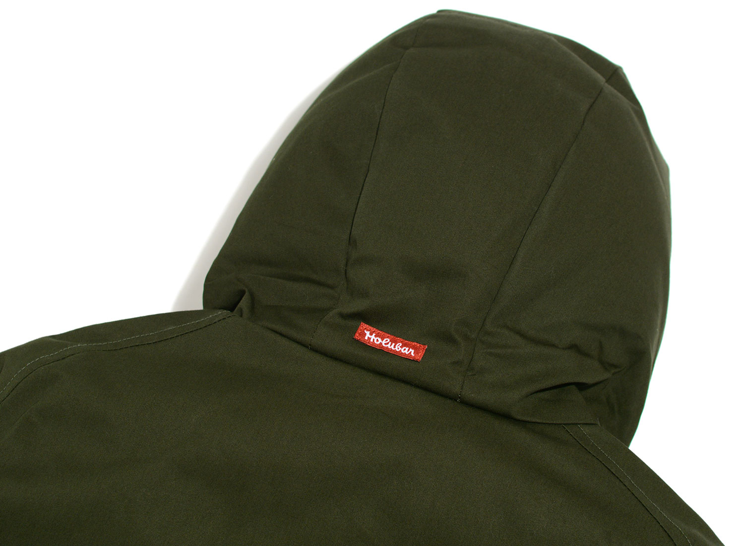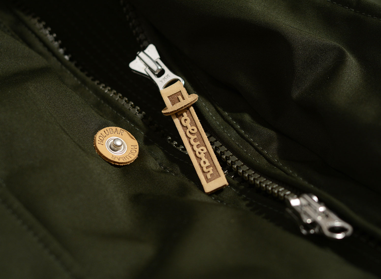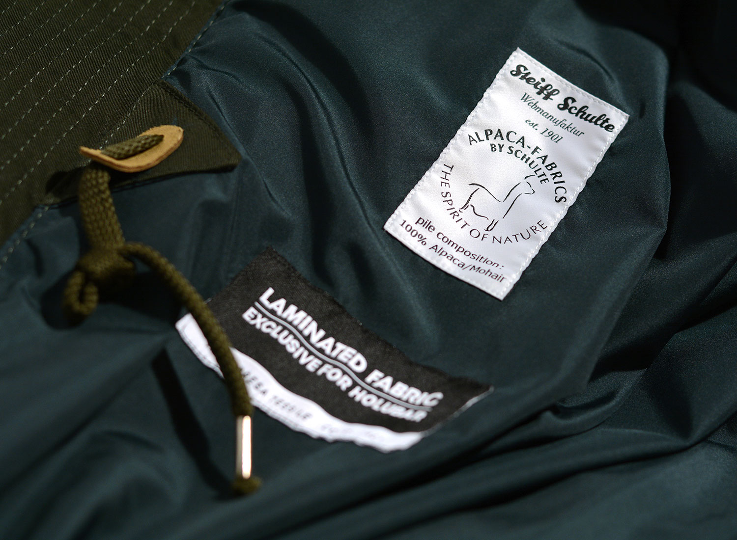 HOLUBAR Boulder Snaps LI77 Jacket Deep Green. Straight fit "Arctic Parka" made from LAminated repellent italian fabric. 90% Cotton / 10% Polyuretan. 100% nylon quilted lining. Down and feather filling. Zip closure with buttoned flap. Alpaca / Mohair reovable collar lining. Drawcords on waist and hood with leather stoppers. Ribbed cuffs. Two pockets on chest lined with alpaca, two on bottom and one inside.