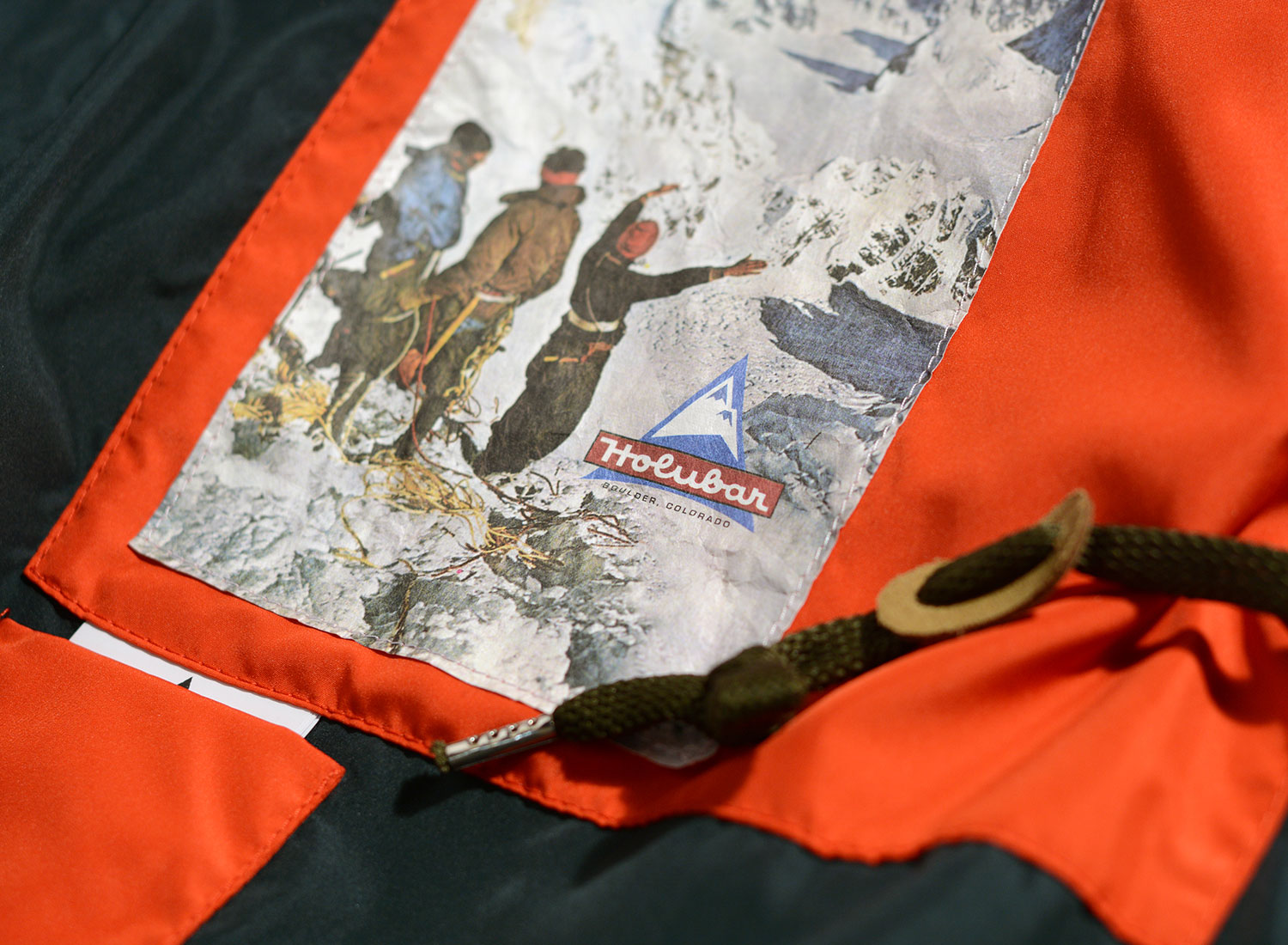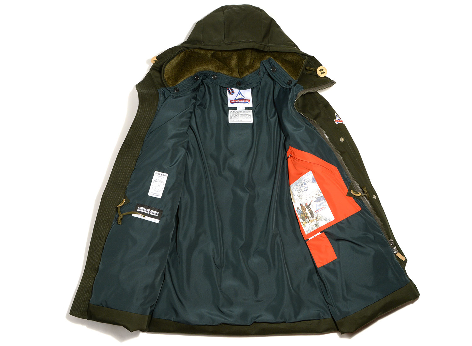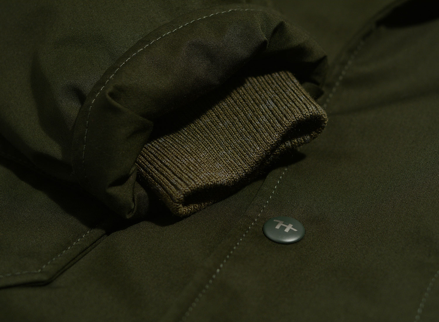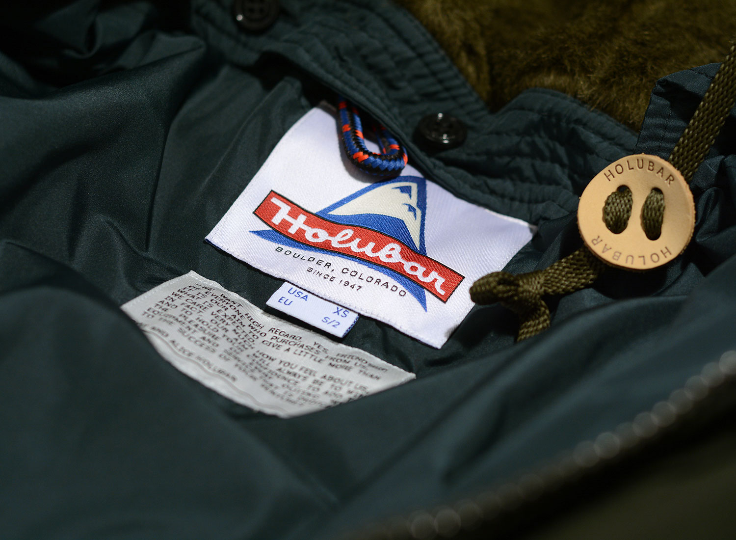 HOLUBAR Boulder Snaps LI77 Jacket Deep Green. Straight fit "Arctic Parka" made from LAminated repellent italian fabric. 90% Cotton / 10% Polyuretan. 100% nylon quilted lining. Down and feather filling. Zip closure with buttoned flap. Alpaca / Mohair reovable collar lining. Drawcords on waist and hood with leather stoppers. Ribbed cuffs. Two pockets on chest lined with alpaca, two on bottom and one inside.