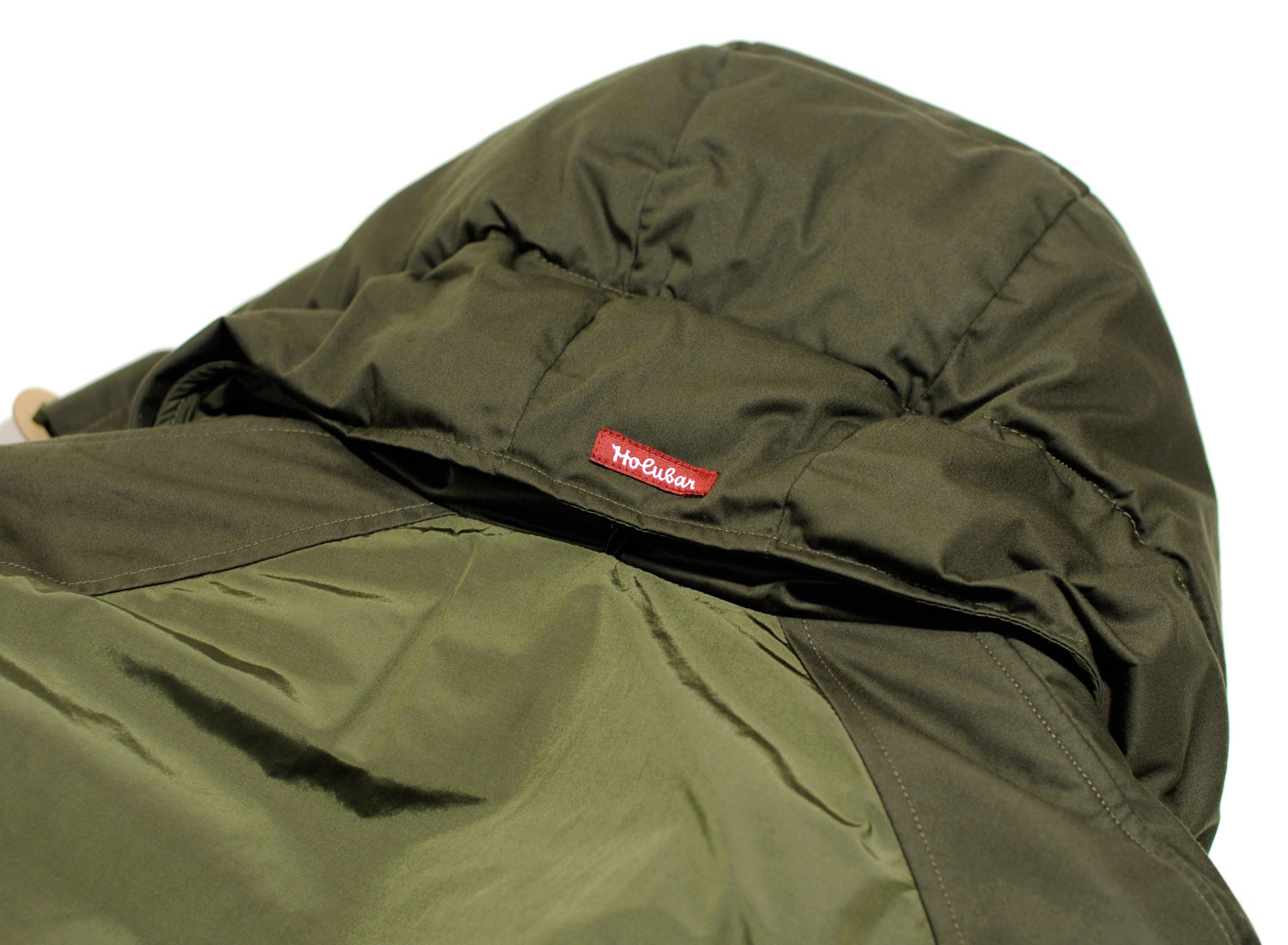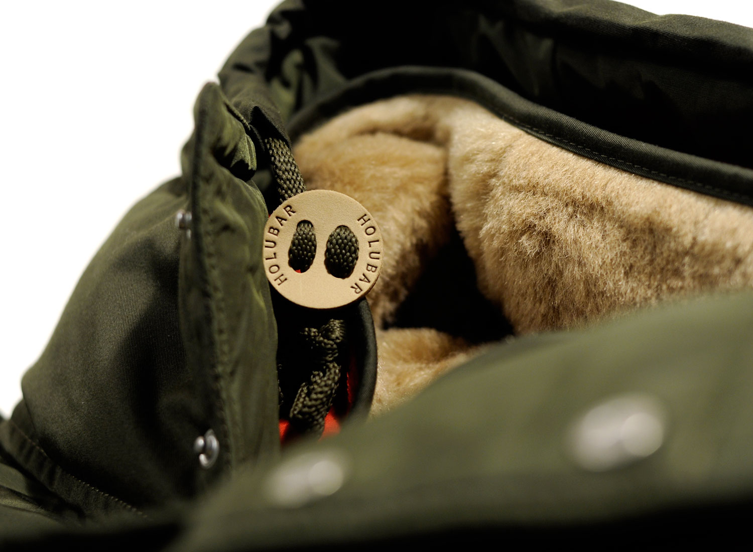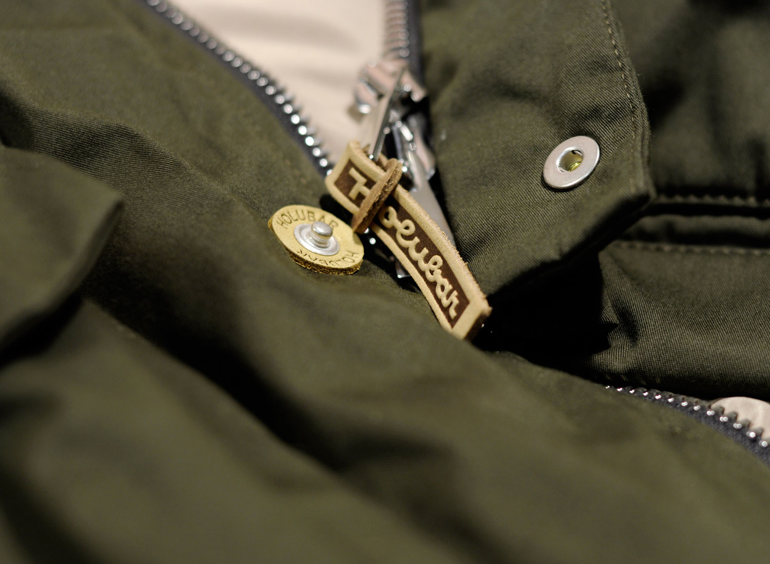 HOLUBAR Metro Mountain Parka NL27 Military Olive. Straight fit Mountain Parka made from "LIMONTA" repellent italian fabric. Cotton / Polyamide. 100% nylon quilted lining. Down and feather filling. Zip closure with snap buttoned flap. Leather finish on snap buttons. Alpaca / Mohair reovable collar lining. Removable hood. Drawcords on bottom and hood with leather stoppers. Ribbed cuffs. Four pockets on font, one on the back and one inside.