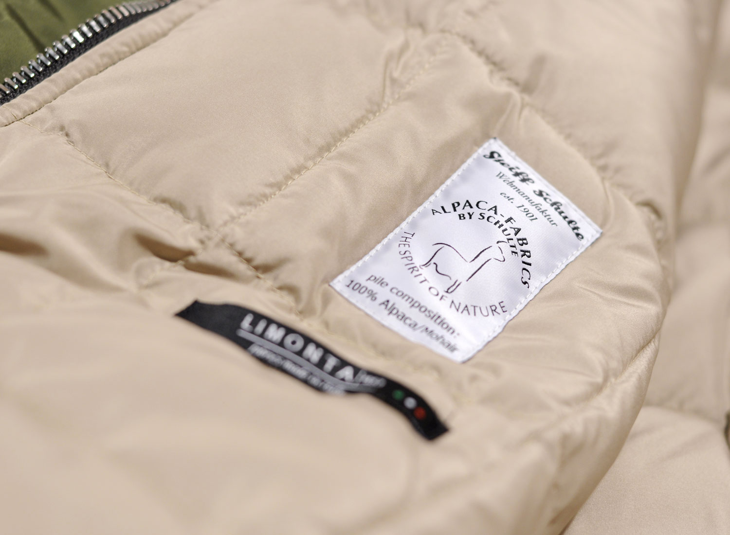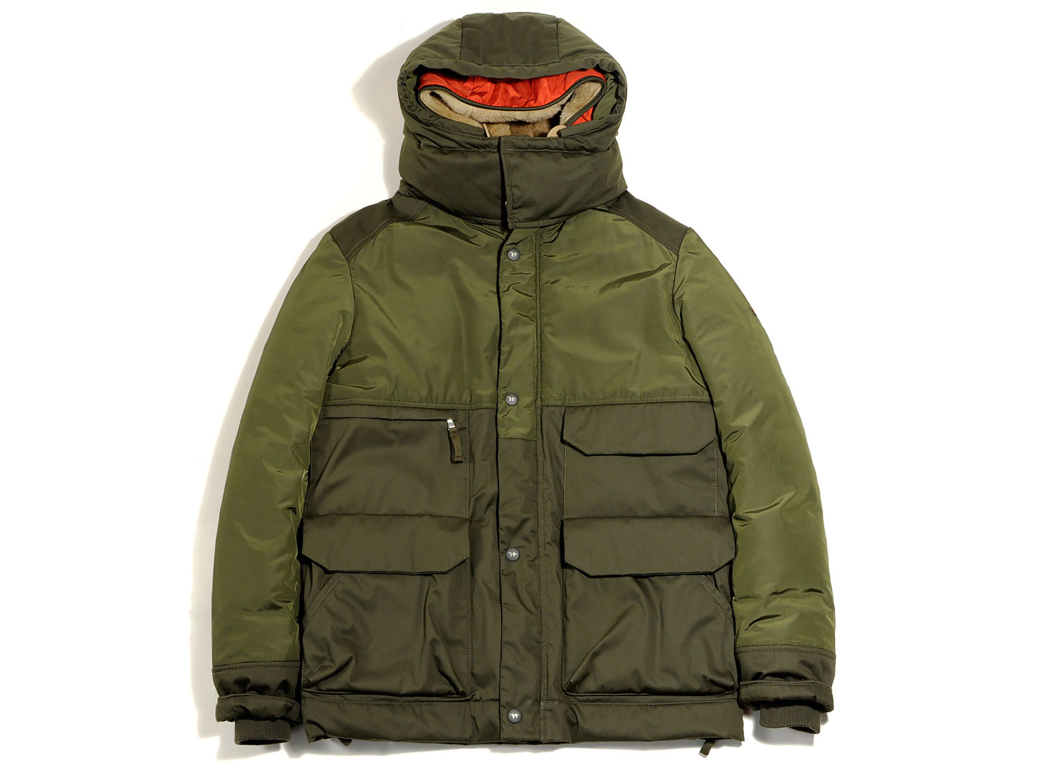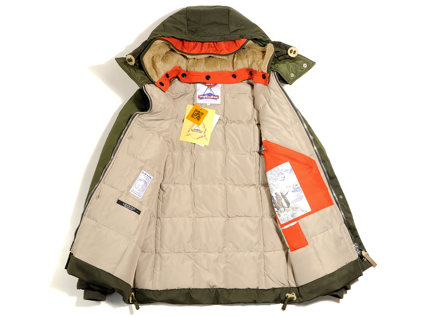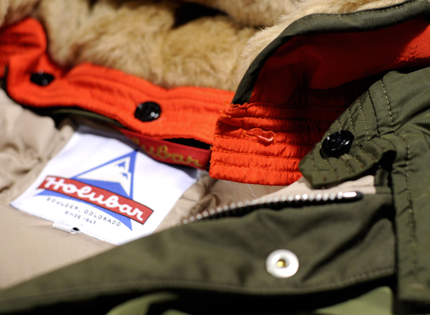 HOLUBAR Metro Mountain Parka NL27 Military Olive. Straight fit Mountain Parka made from "LIMONTA" repellent italian fabric. Cotton / Polyamide. 100% nylon quilted lining. Down and feather filling. Zip closure with snap buttoned flap. Leather finish on snap buttons. Alpaca / Mohair reovable collar lining. Removable hood. Drawcords on bottom and hood with leather stoppers. Ribbed cuffs. Four pockets on font, one on the back and one inside.