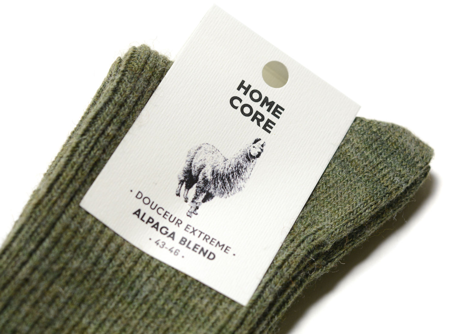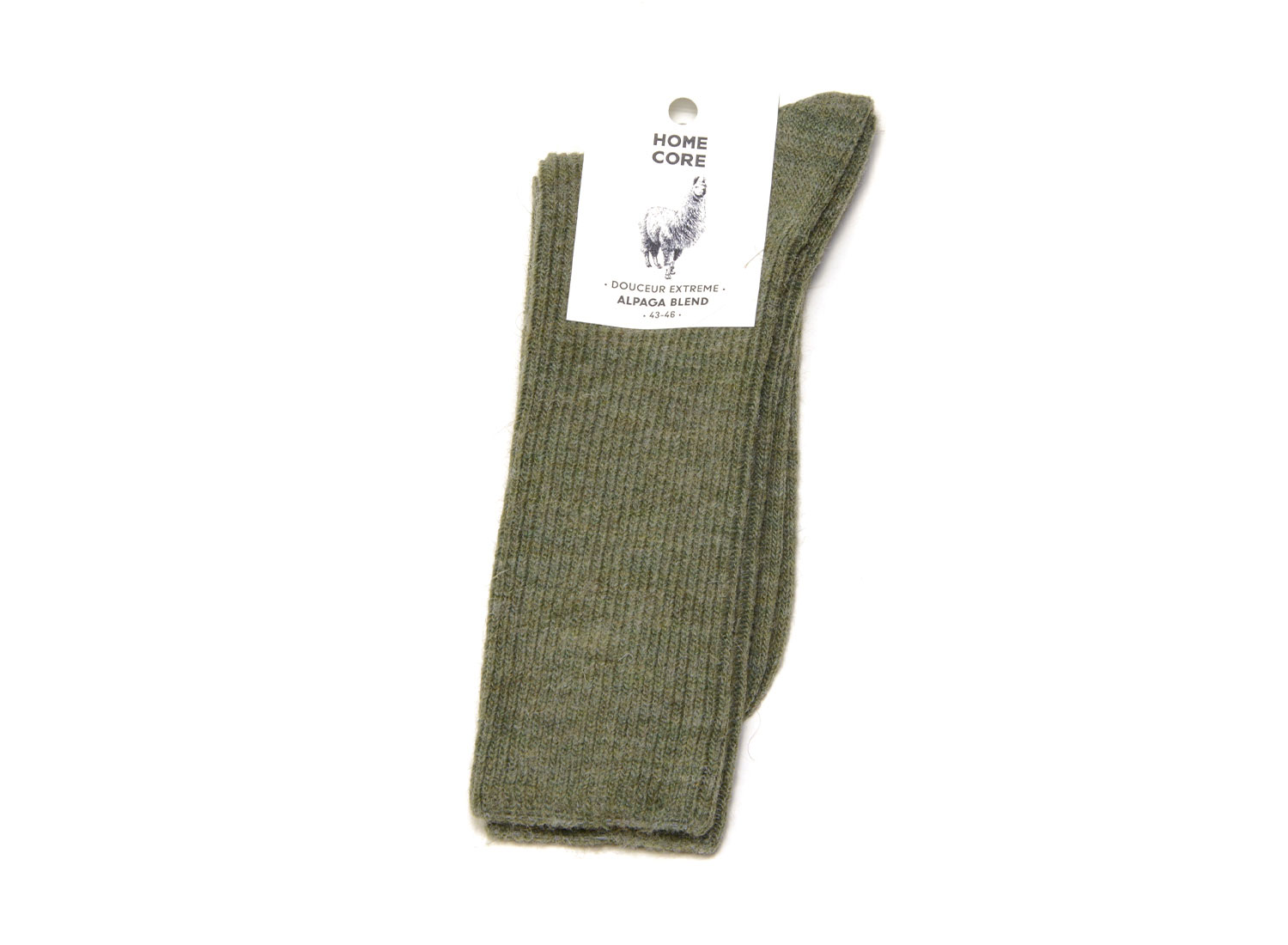 HOMECORE Alpaca Blend Socks Olive Green. Warm knitted socks. 66% Polyacrilic / 22% wool / 10% alpaca / 2% Elastane.Size chart : S = 39/42 - M = 43/46