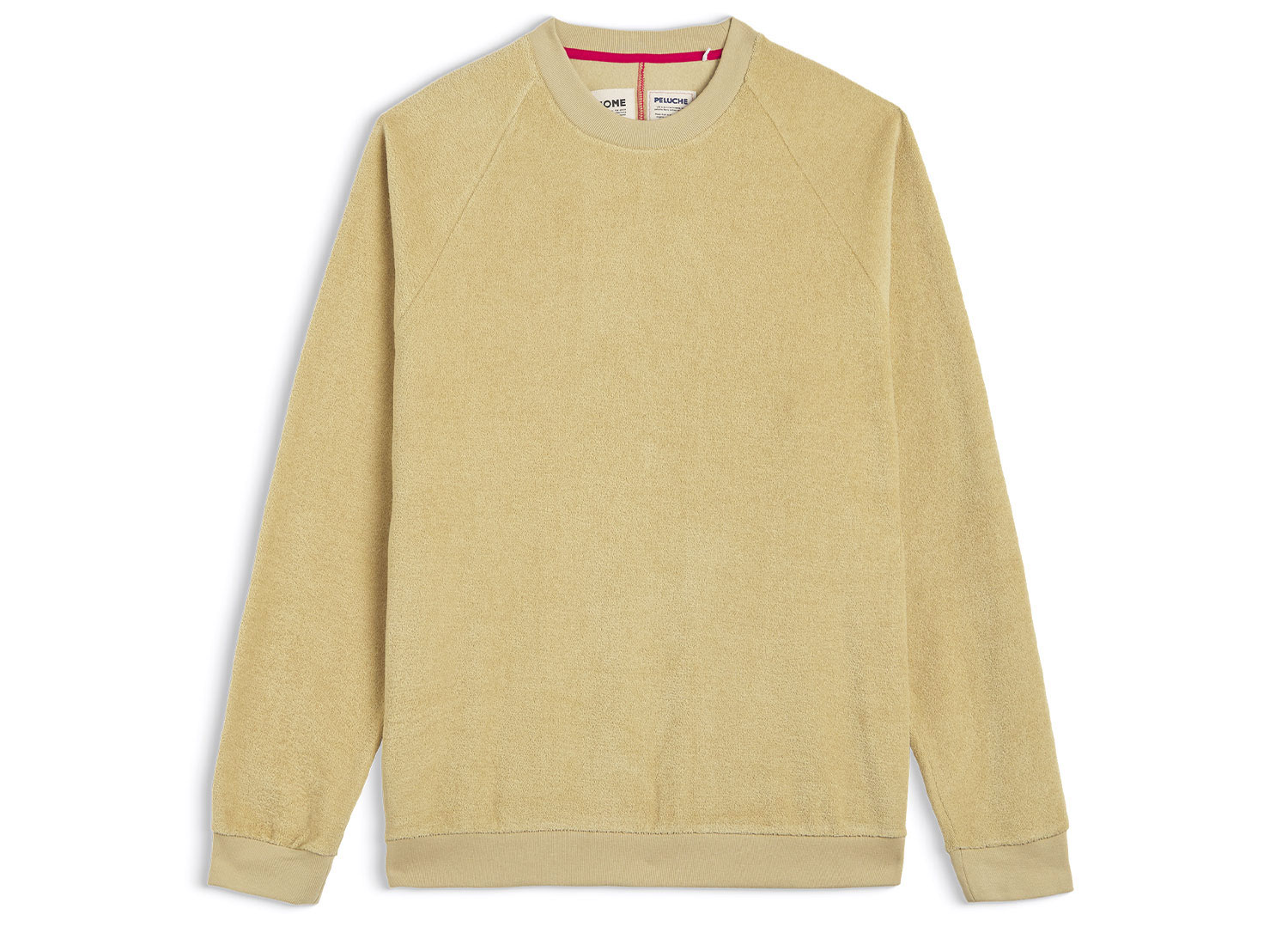 HOMECORE Aquae Sponge Sweatshirt Beige. Regular fit sweatshirt made from soft terry fleece fabric. 52% recycled polyester / 48% organic cotton. Raglan sleeves. Ribbed collar, cuffs and hem. Red stitching on back.
