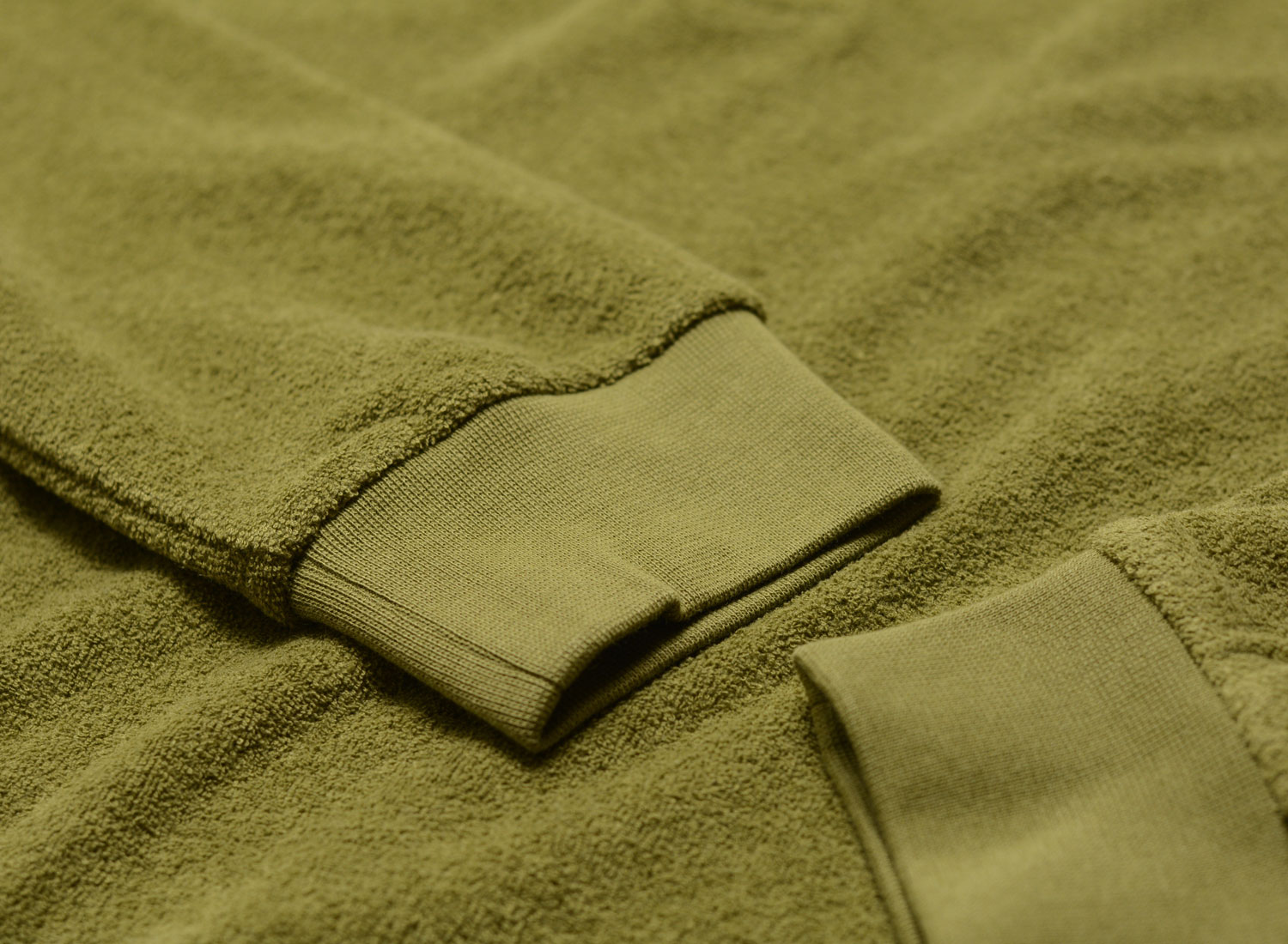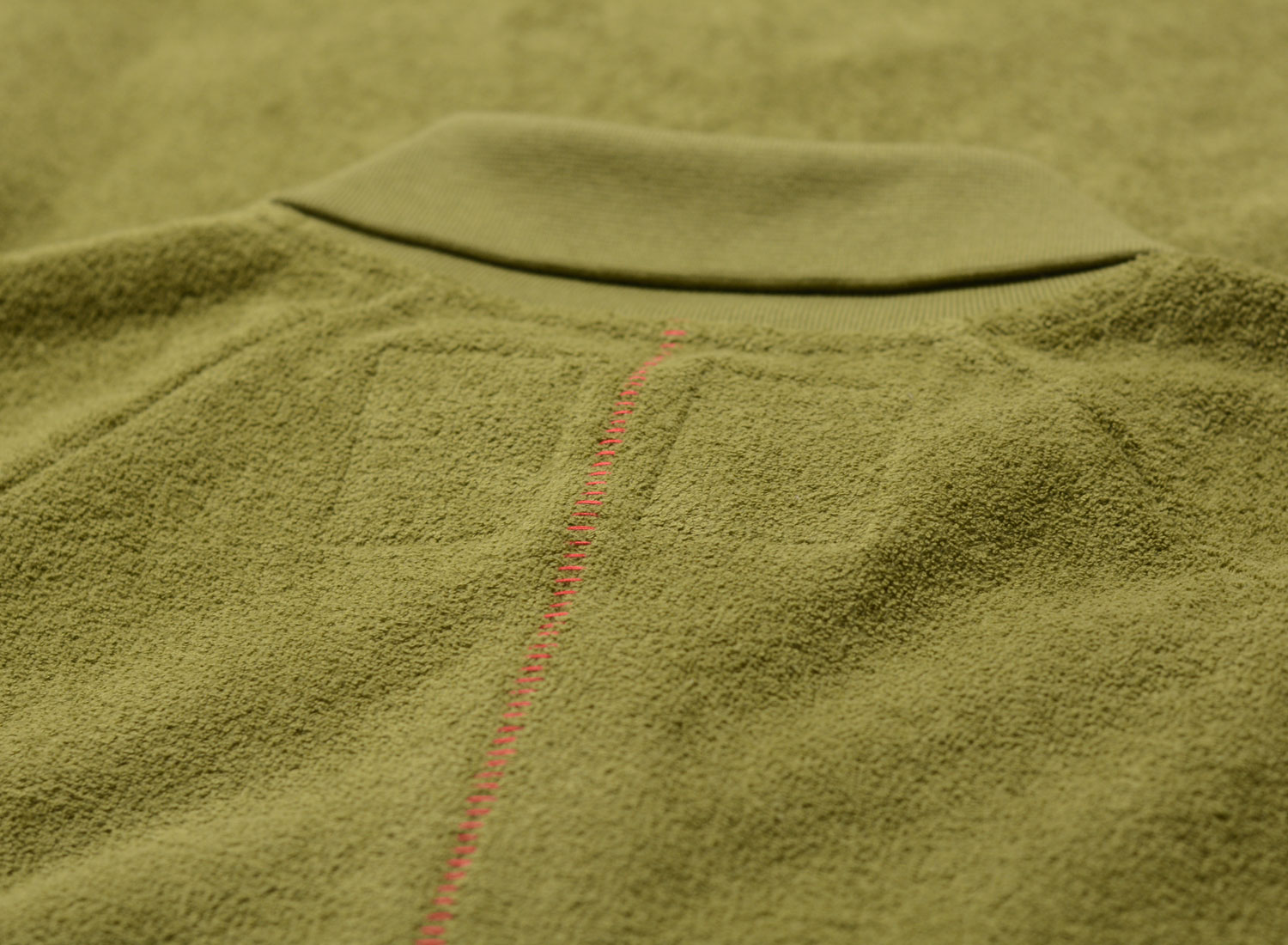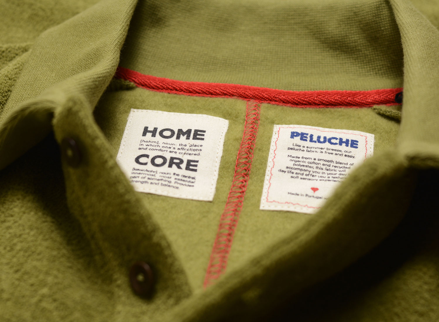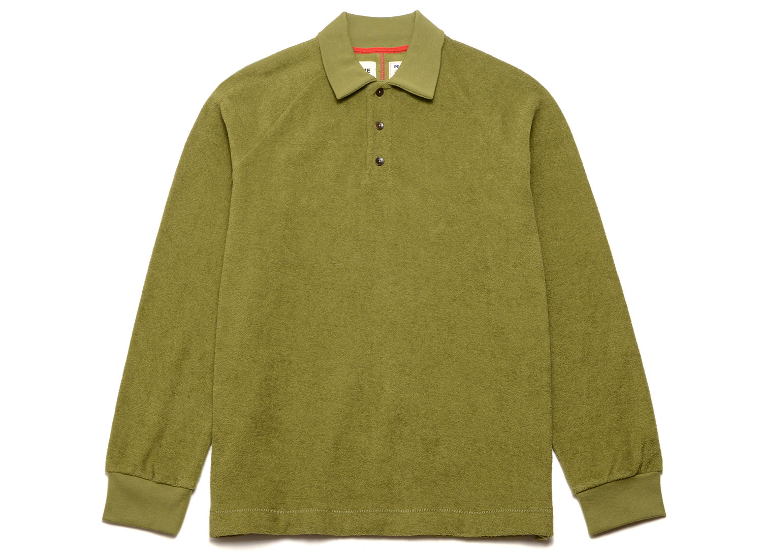 .HOMECORE Ignis Polo Lizard Green. Long-sleeve regular fit polo shirt in soft terry fleece. 52% recycled polyester / 48% organic cotton. Raglan sleeves. Ribbed cuffs. Red topstitching on back.