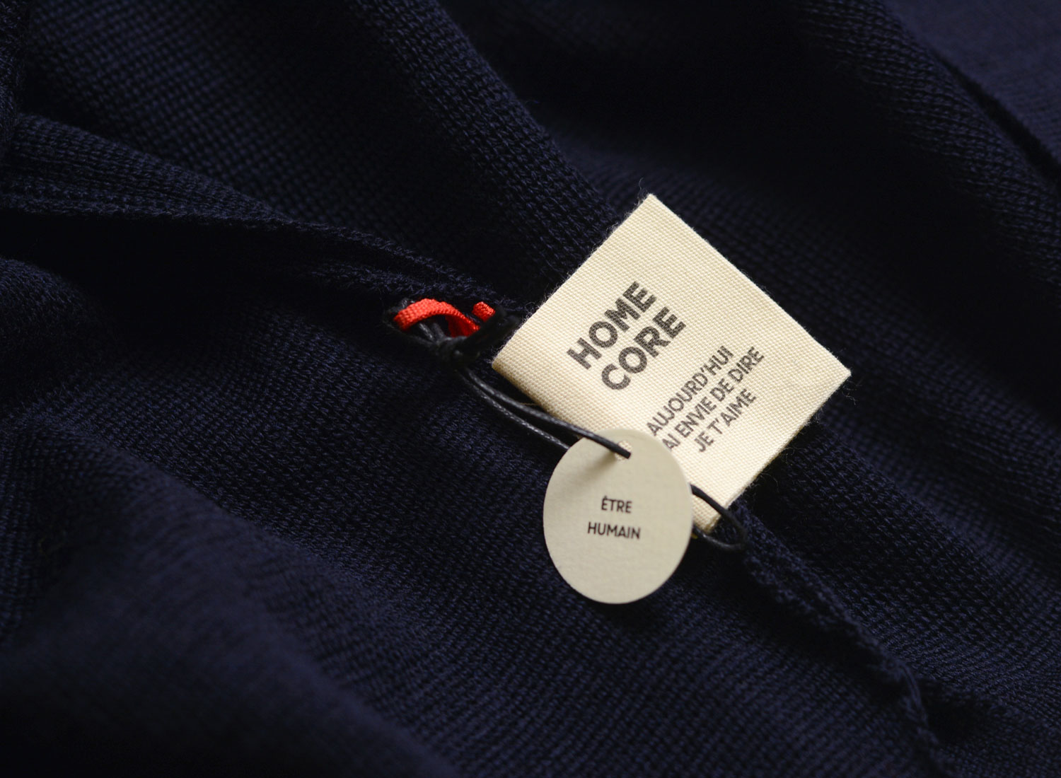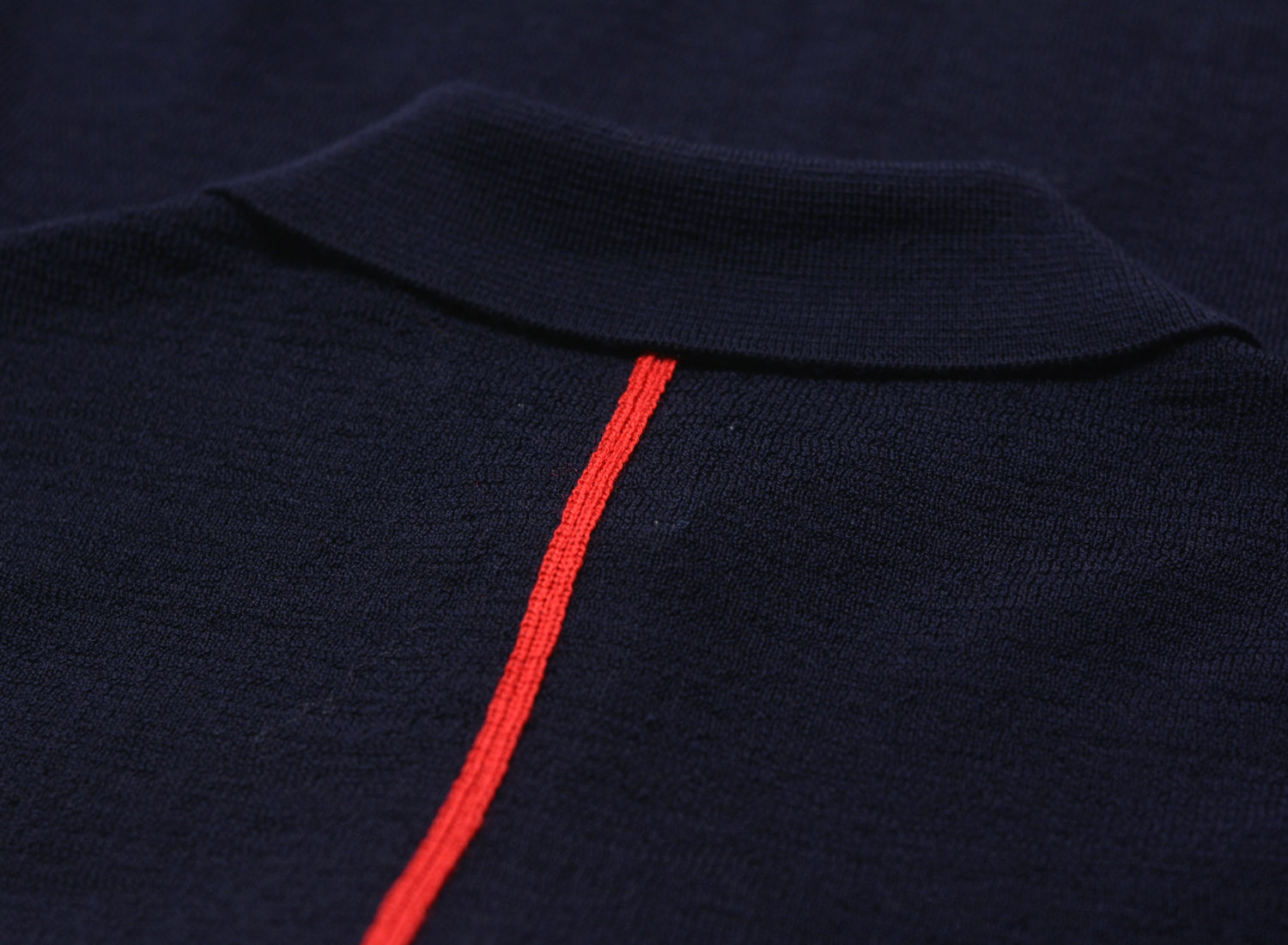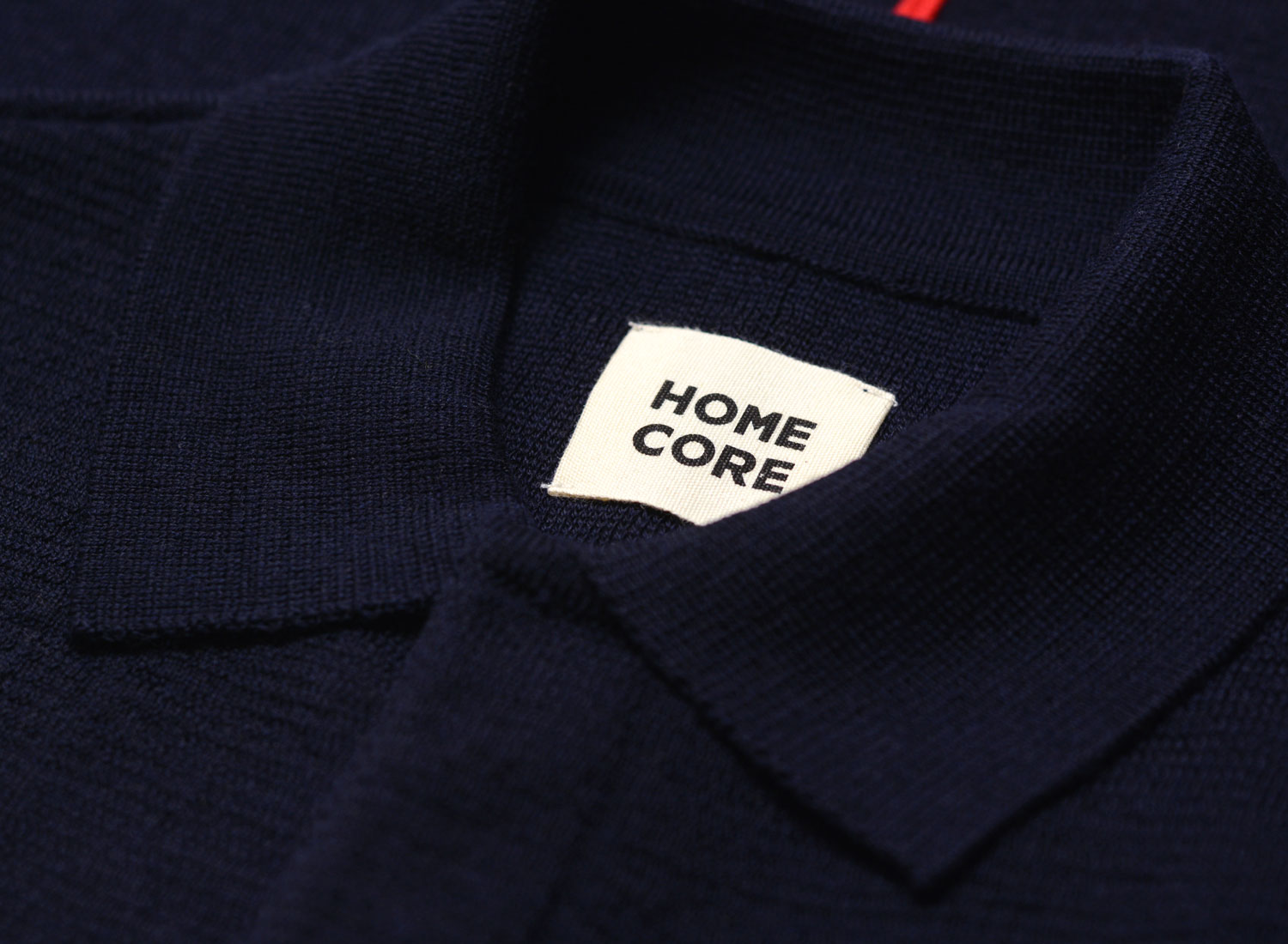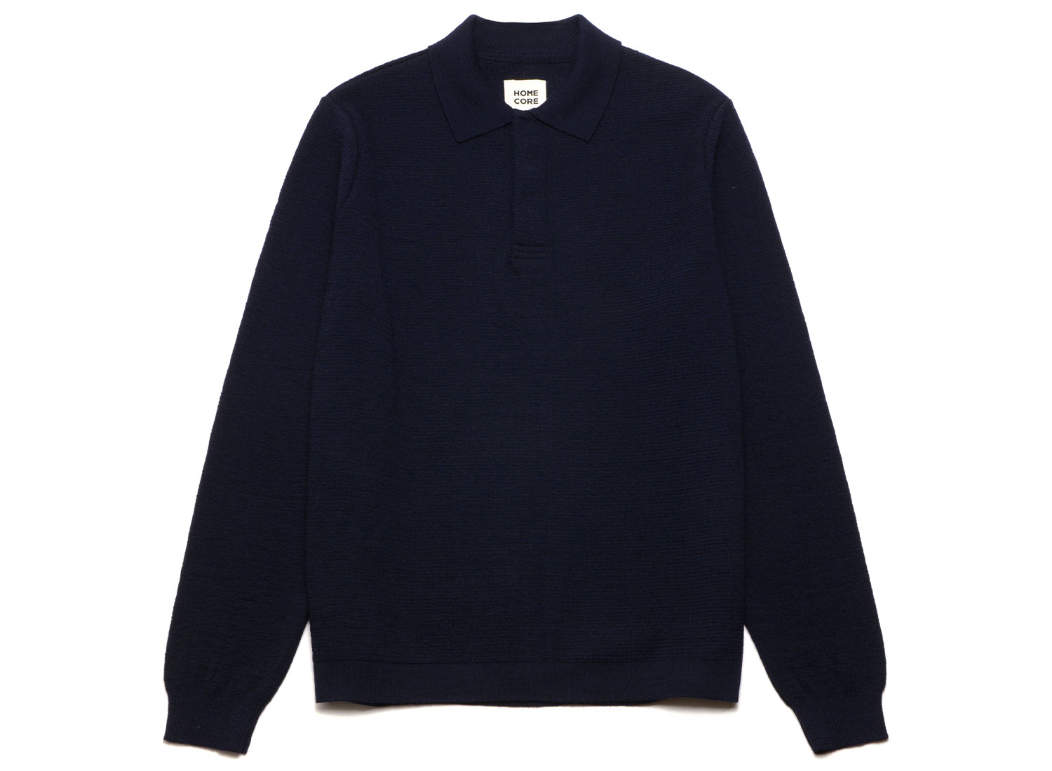 HOMECORE Nemesis Merino Wool Polo Navy. Regular fit long sleeve polo shirt made from 100% merino wool knit. Raglan sleeves. Ribbed cuffs and bottom. Hidden button placket. Red stitching on the back. Vents on sides.