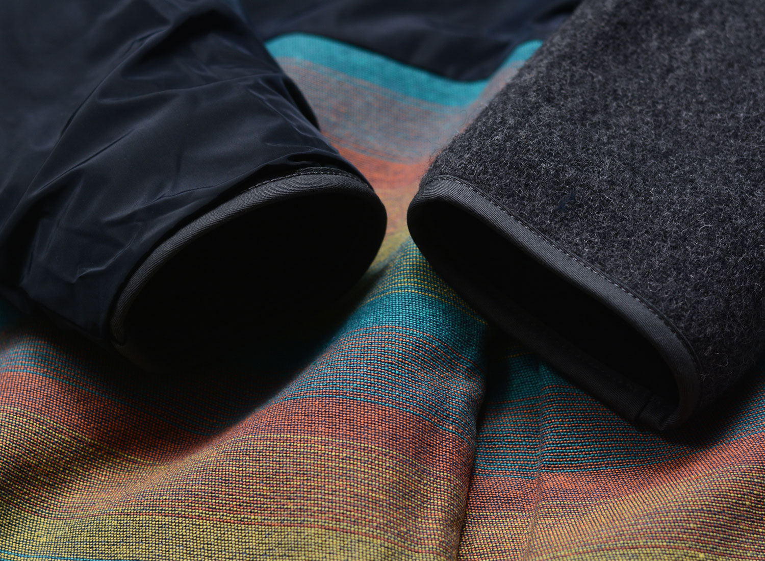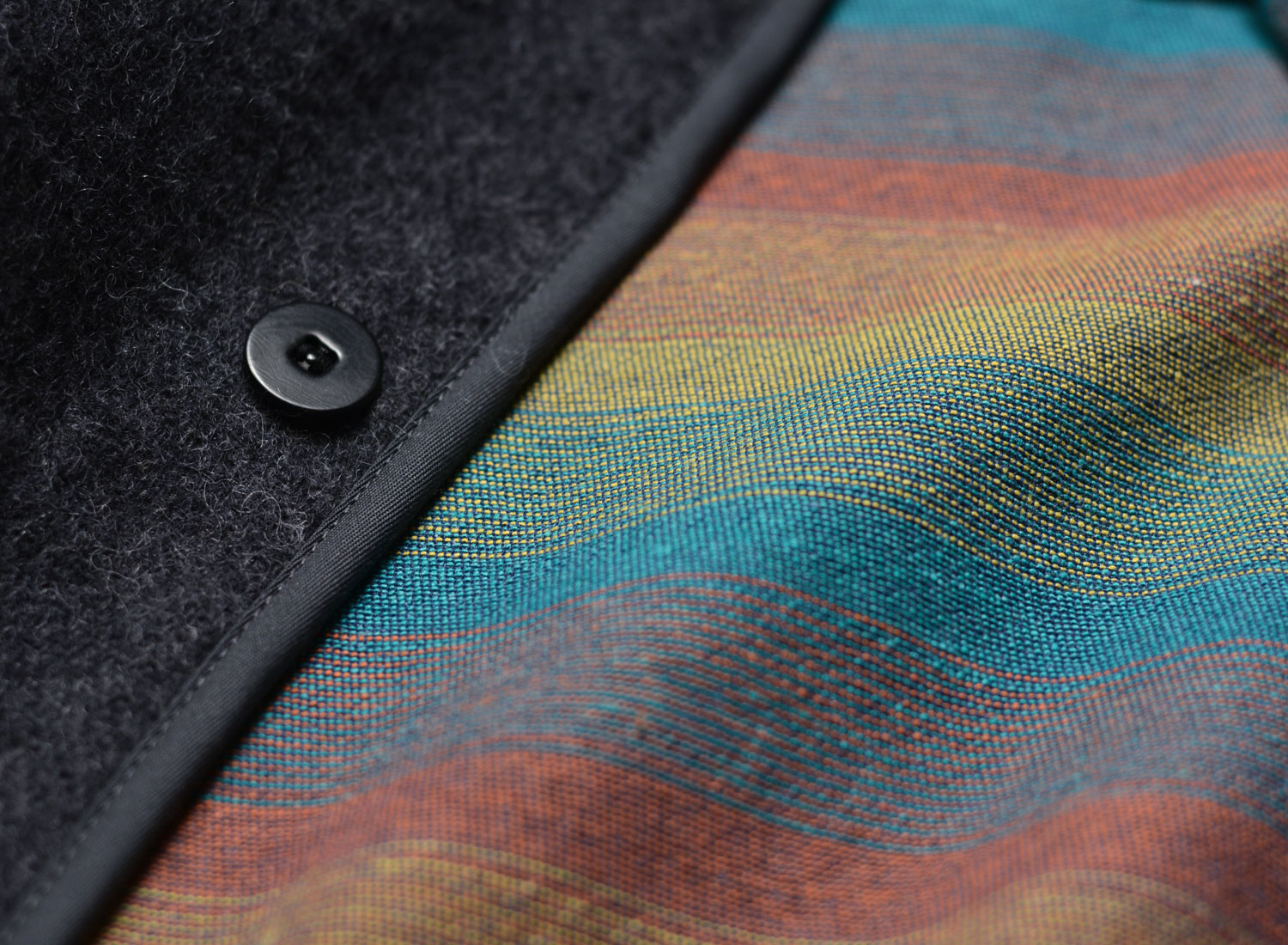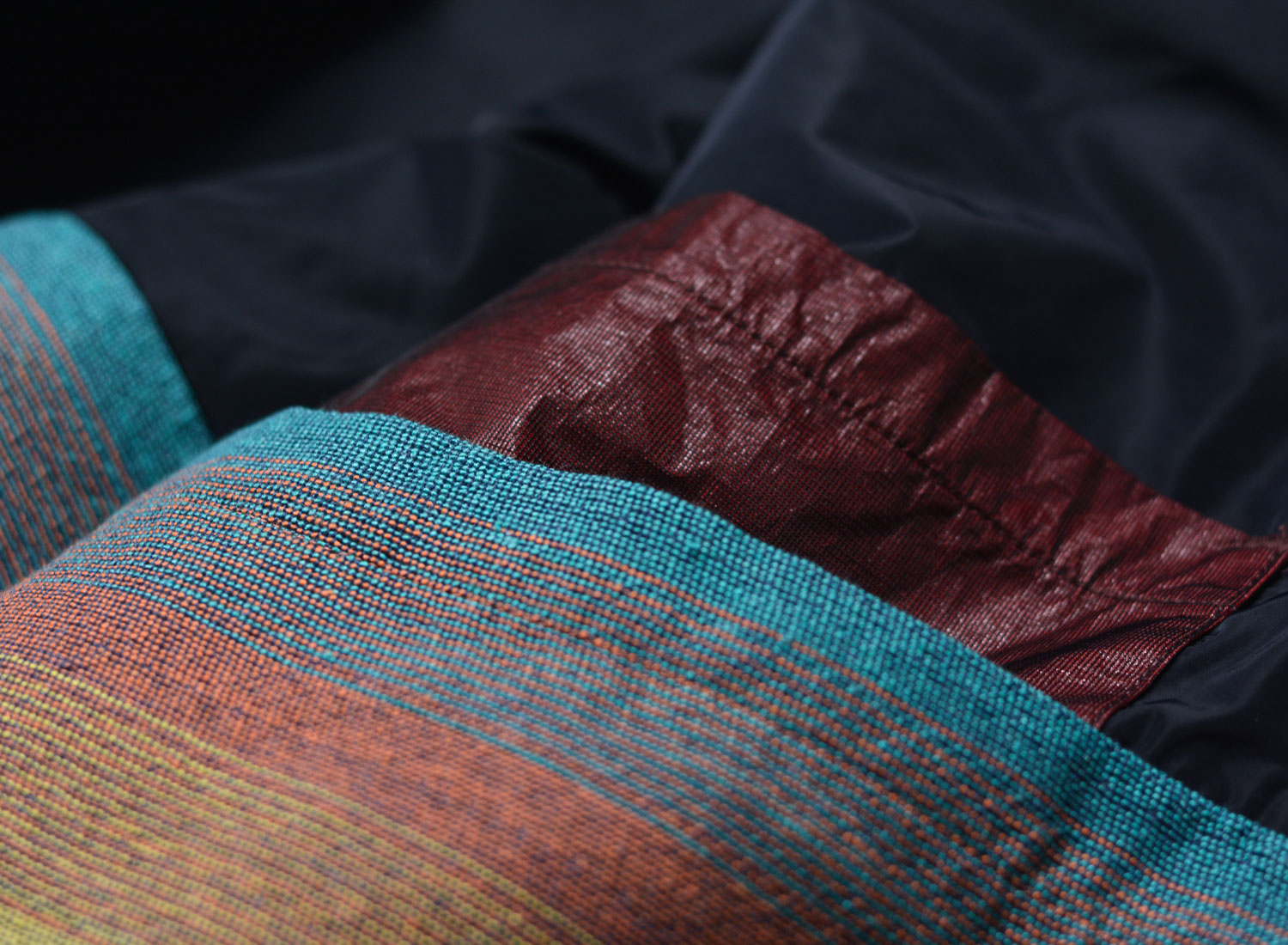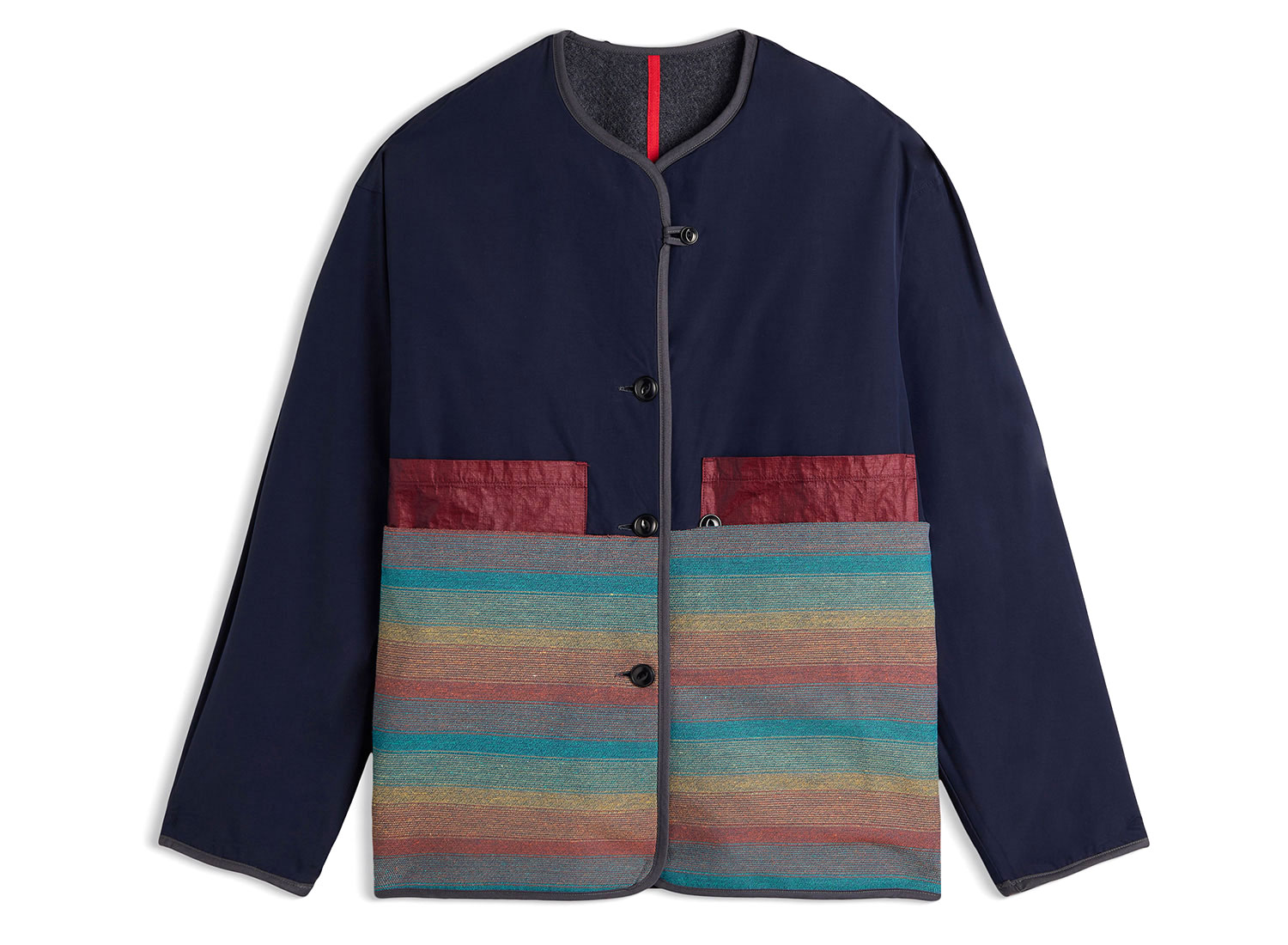 The other side in navy nylon, with crinkled burgundy pockets and a bold multicolour striped panel.