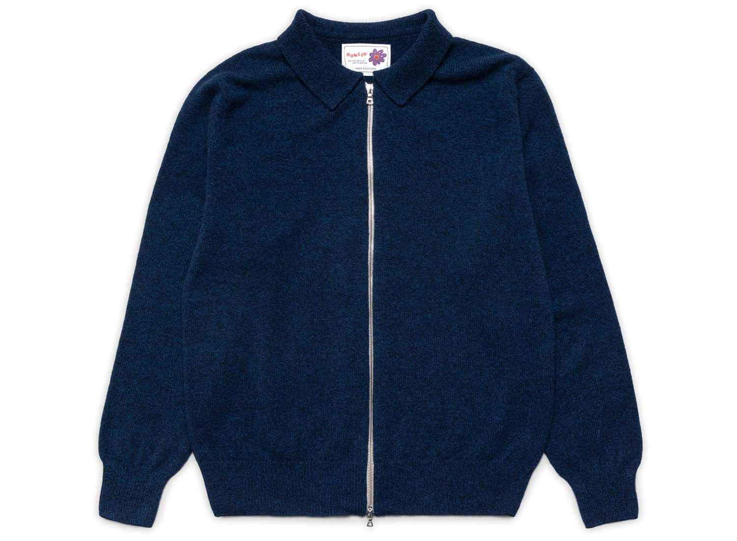 Double-zip cardigan with stand collar, expertly knitted in Scotland using a marled wool blend.
