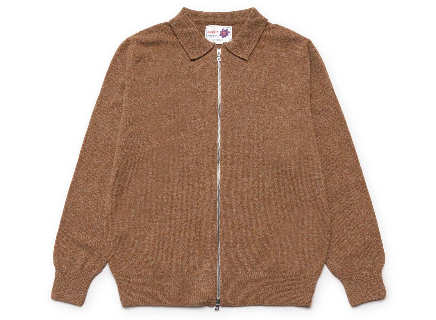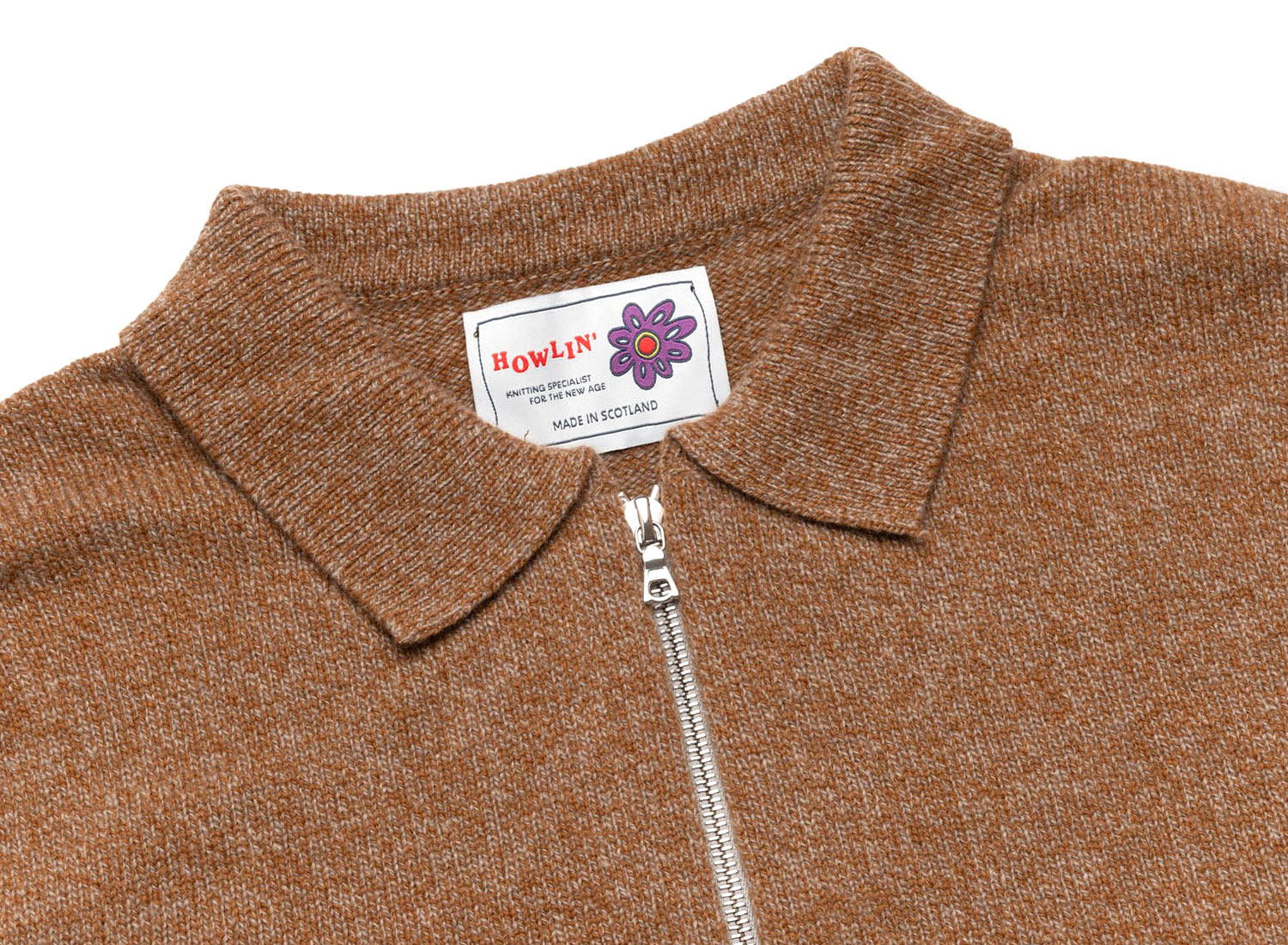 HOWLIN BY MORRISON High Pressure Cardigan Nut Mix. Double-zip cardigan with stand collar, expertly knitted in Scotland using a marled wool blend. 100% superfine lambswool. Washed for an ultra-soft feel often mistaken for cashmere. Seamless “whole garment” construction ensures a natural drape. Full-length Riri two-way zips. Fine ribbing at cuffs and hem. Hand-linked neckline detail for refined finish. Relaxed fit. Made in Scotland.