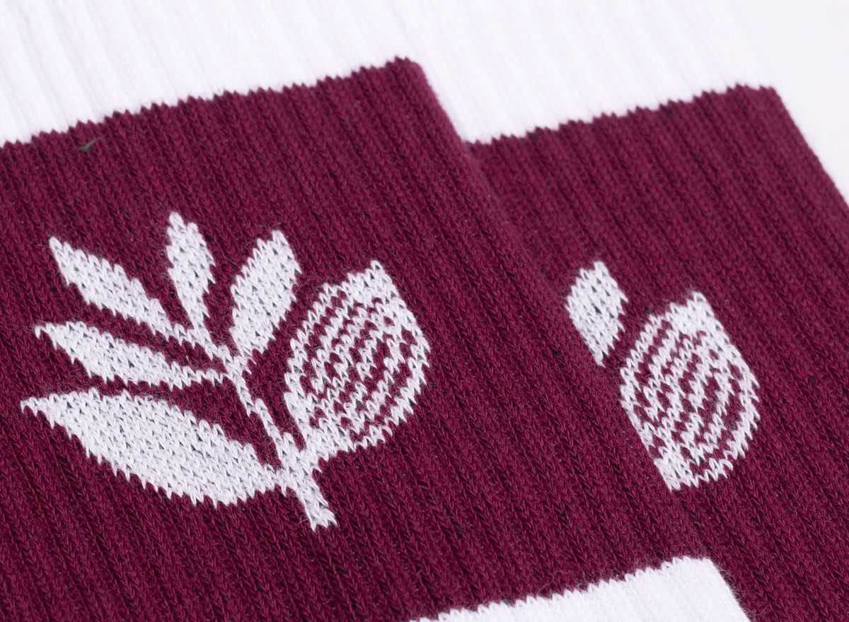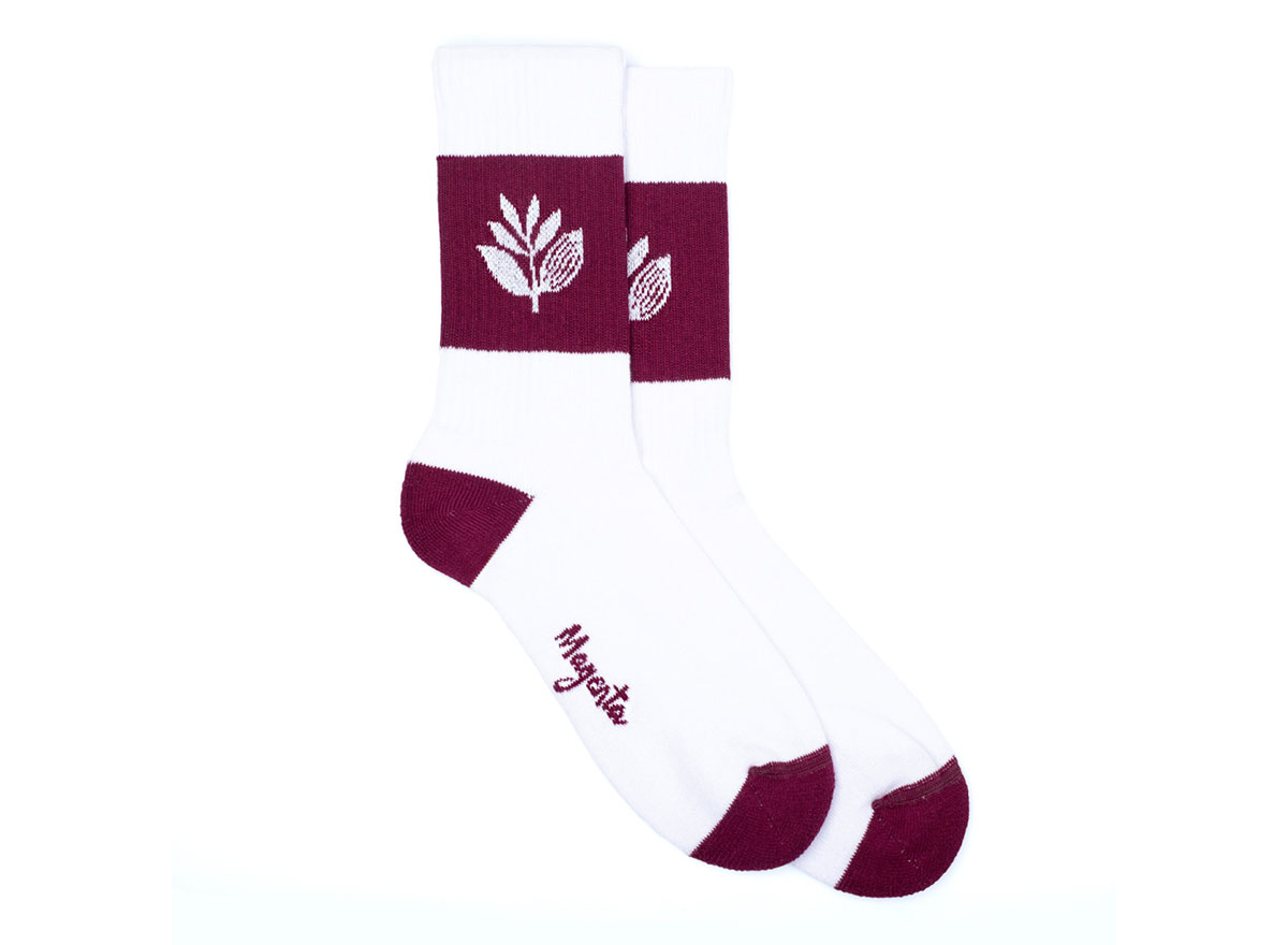 MAGENTA Stripe Socks White. Logo woven on the side. One size fits all.