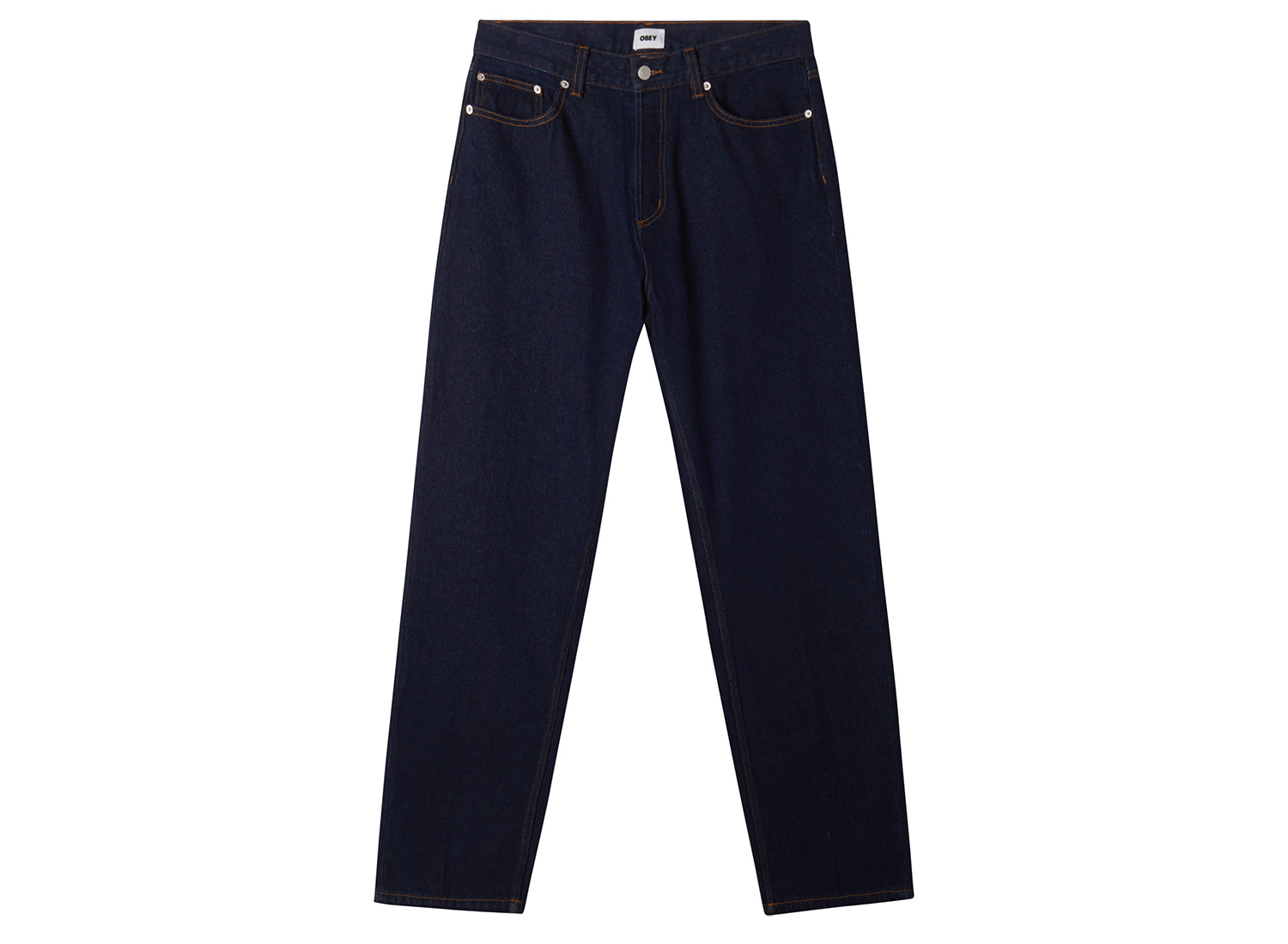 OBEY CLOTHING Rin Hardwork Denim Rinse 142010077. Regular fit pants made from 100% cotton denim. Button closure. Side pockets. Patch pockets on the back with sewn-on patch.