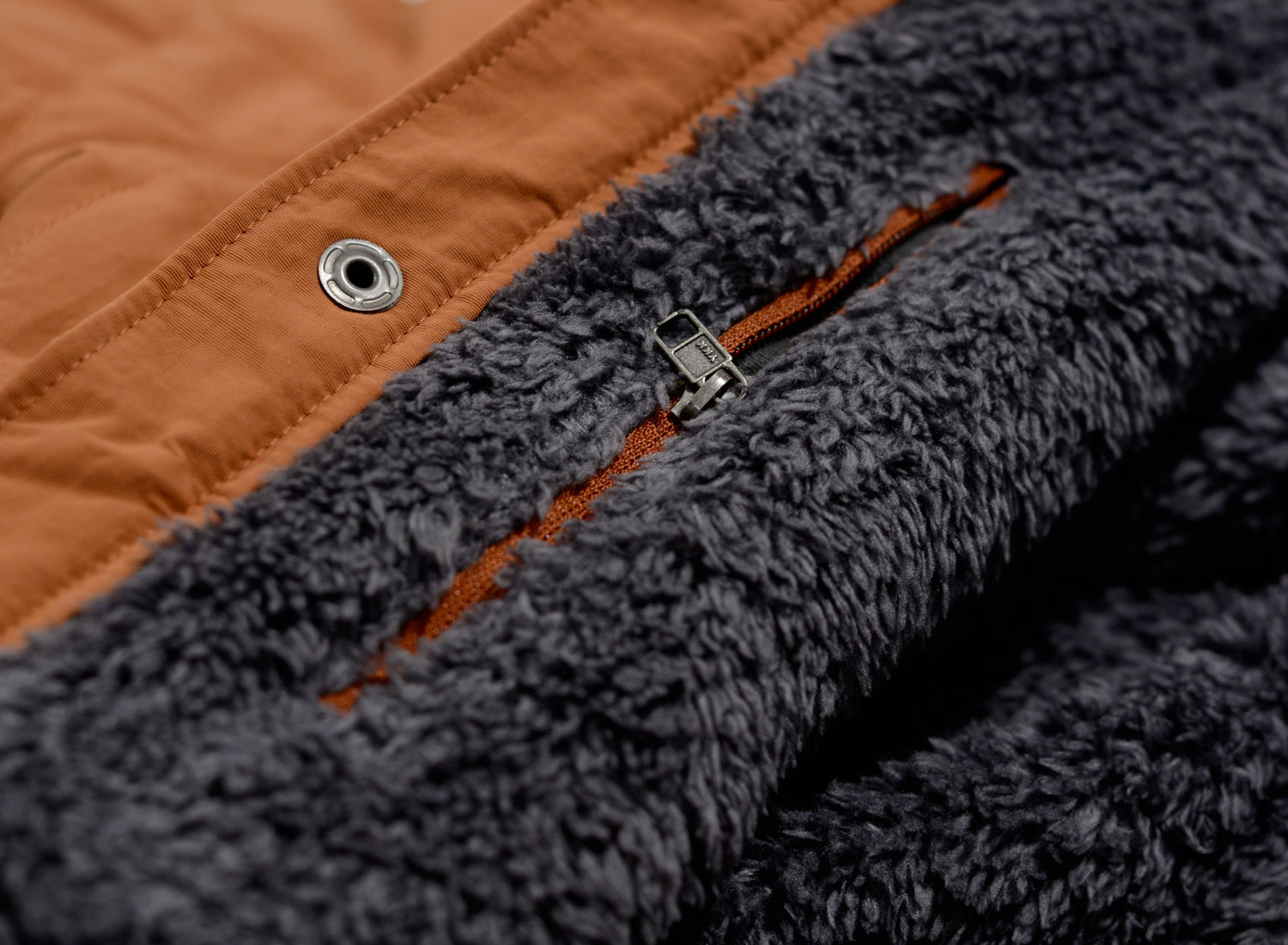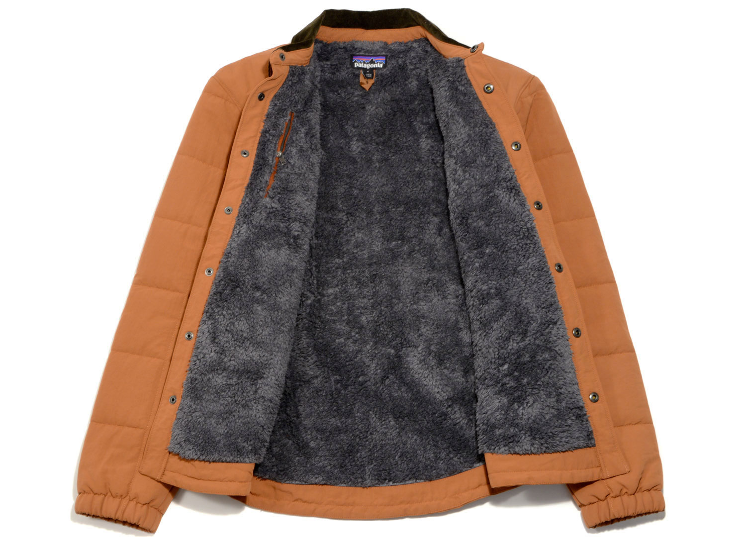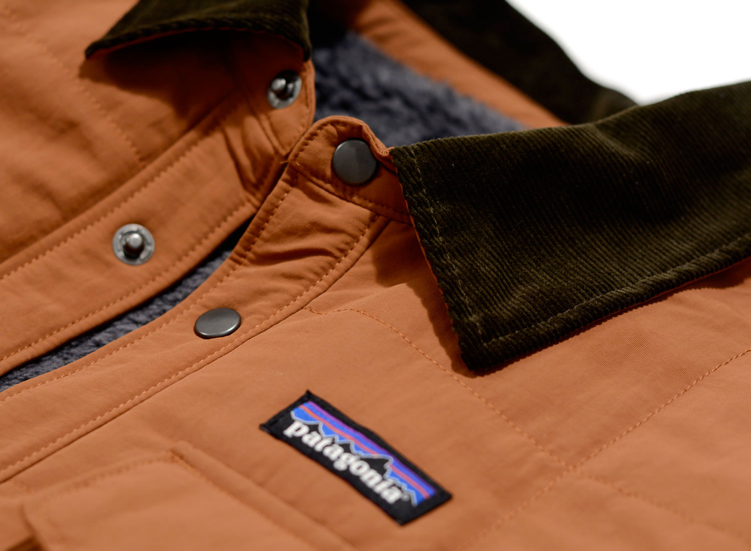 PATAGONIA Isthmus Quilted Shirt Jacket Sisu Brown. Made of 100% recycled nylon; lined with high-pile 100% polyester fleece (30% recycled); insulated with 60-g (100-g in sleeves) THERMOLITE® polyester (92% recycled). Snap front with camp-style corduroy collar. Left-chest patch pocket with flap and snap closure. Two front pockets secure with snaps. Internal zippered chest pocket with headphone compatibility. Comfortable elasticized cuffs keep out drafts. Hip length, shirttail hem; Fair Tra