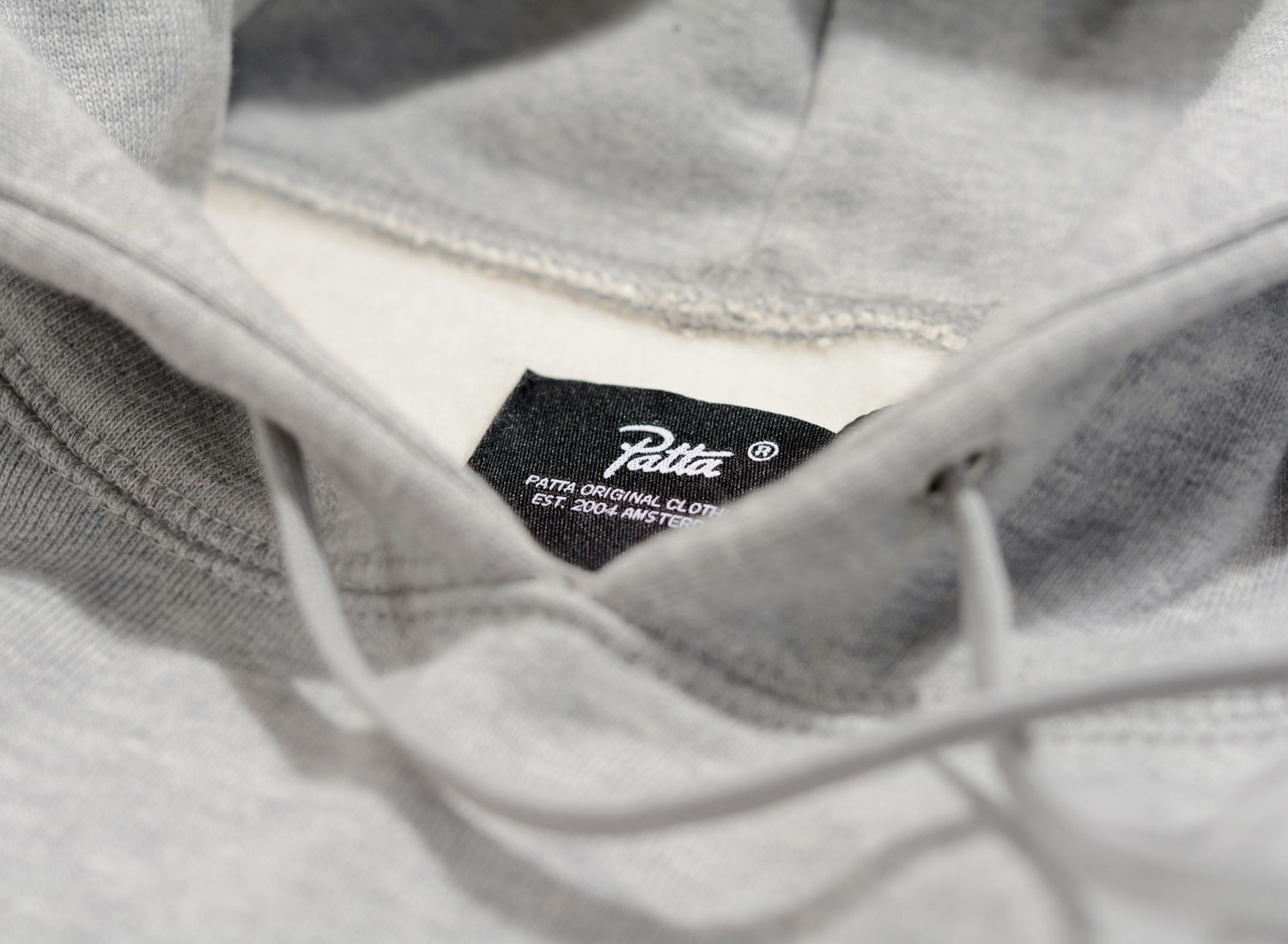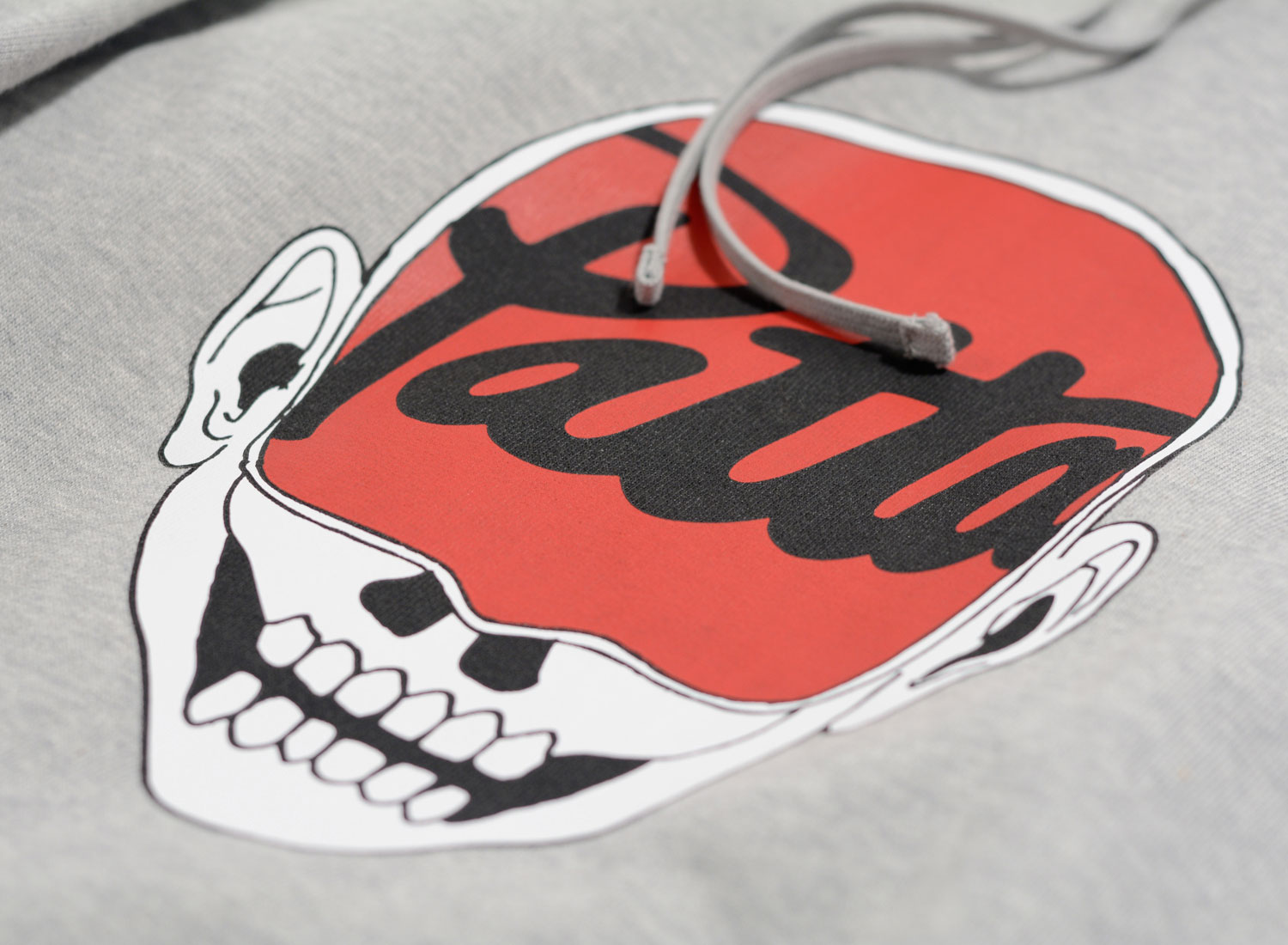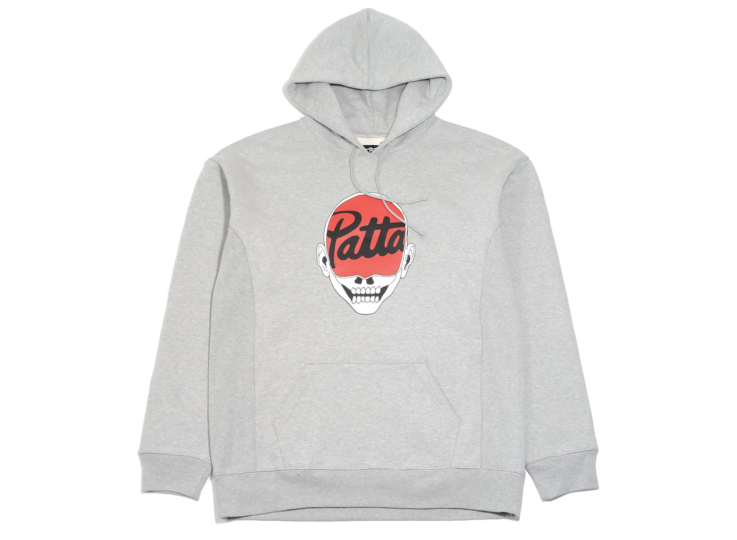 PATTA Skull Hooded Sweater Melange Grey. Hooded sweatshirt made from 450gr cotton fleece fabric. Regular fit. Front print. Ribbed cuffs and hem.