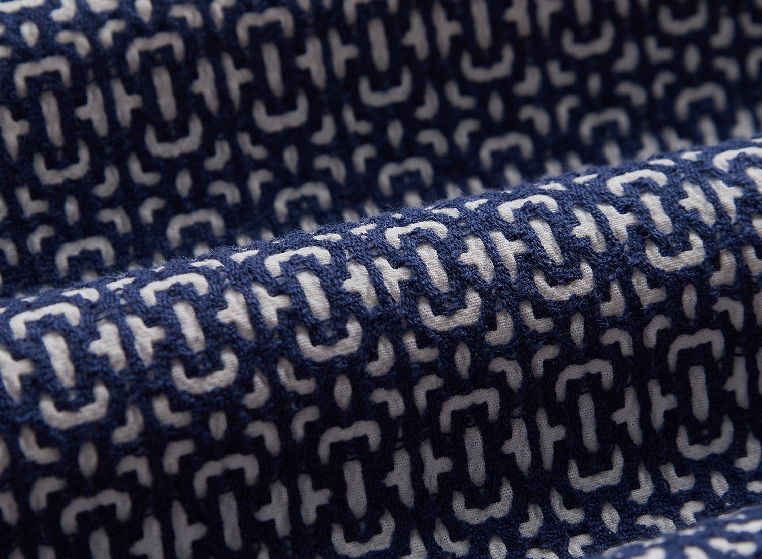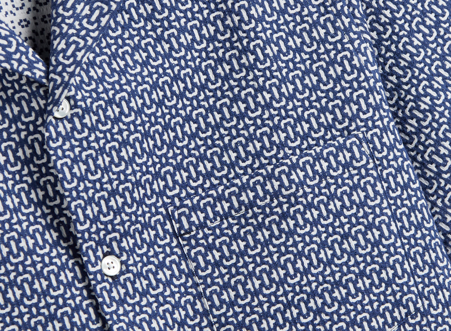 Short sleeve shirt with abstract tile jacquard weave pattern.