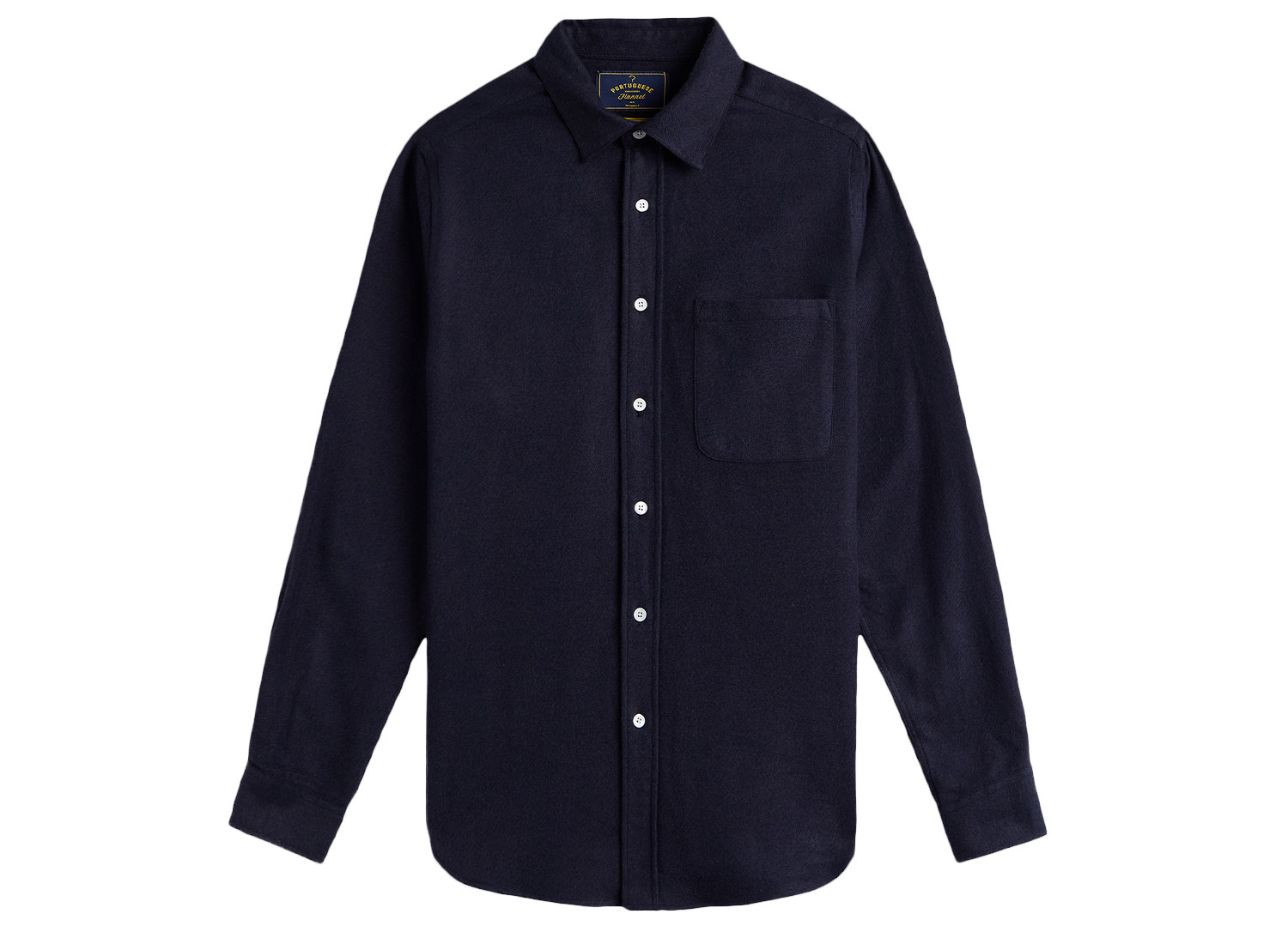 PORTUGUESE FLANNEL Teca 2.0 Shirt Navy. Regular fit shirt made from soft cotton Flannel fabric. Chest pocket. Buttoned cuffs. Rounded Hem.