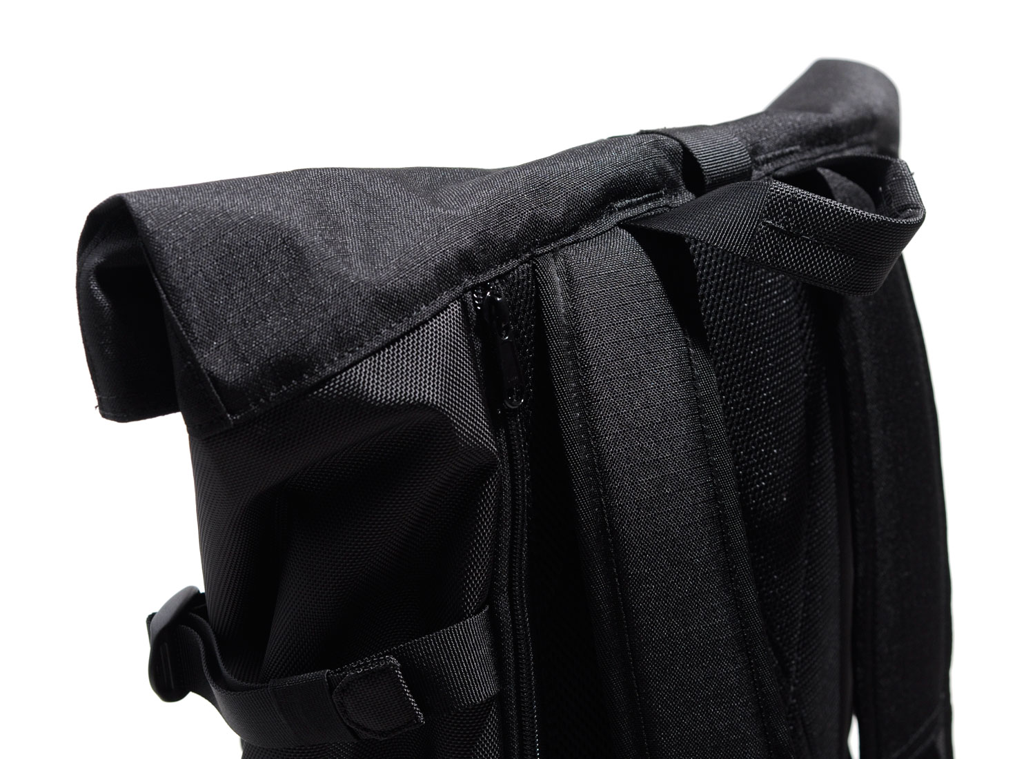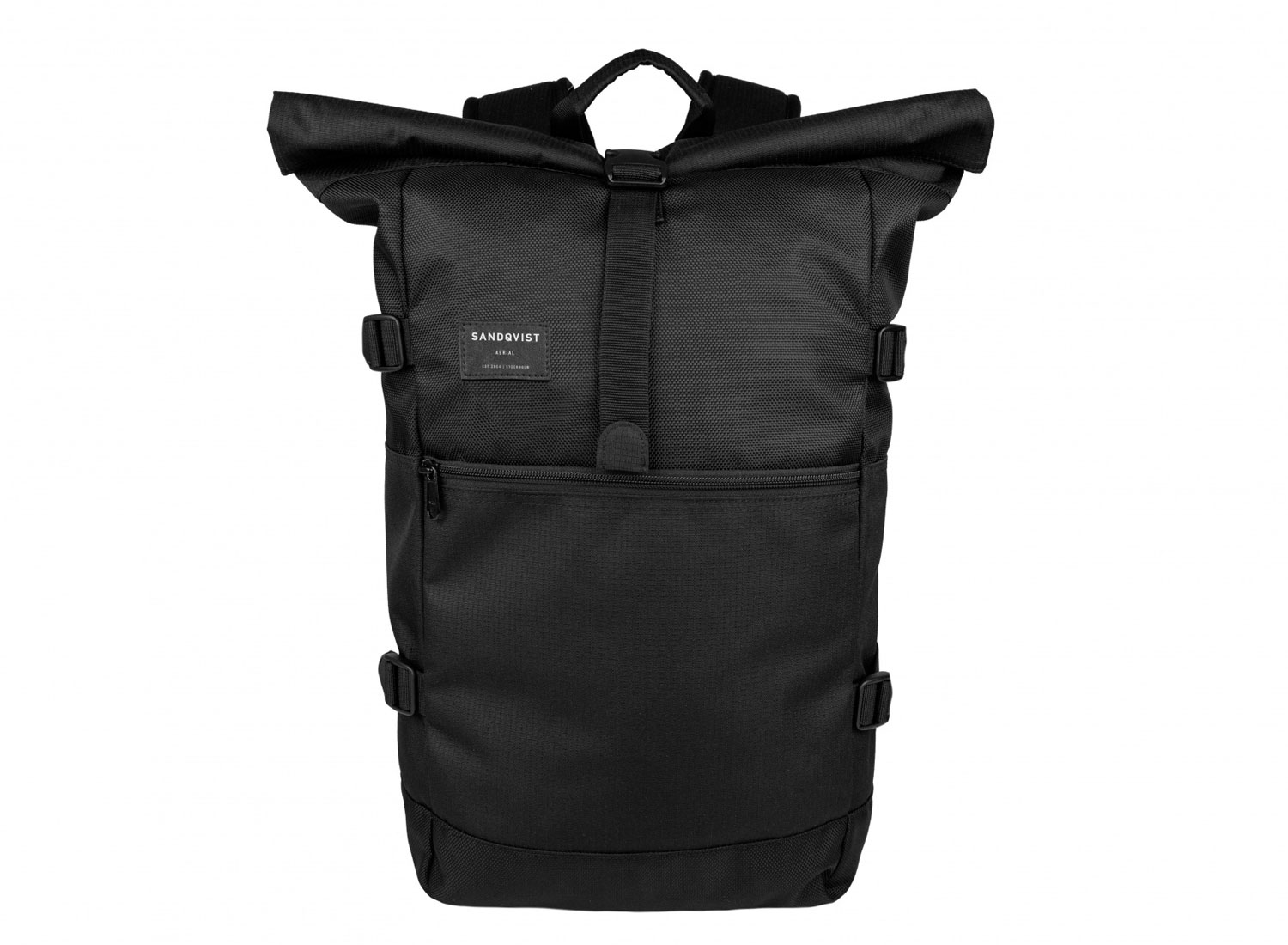 SANDQVIST Fabian Black. Functional roll top backpack sealed with a zipper on top and secured with a buckle, carrying up to 28 L. The heavy Cordura EcoMade ripstop and 1680 denier ballistic polyester makes the bag highly durable. Inside features a 15” laptop sleeve, reachable from side zipper placed on outside. Several slip and zipper pockets combined with a removable lanyard help keep your things organised. Outside stove pockets are placed on each side of the bag and one outer zipper pocket i
