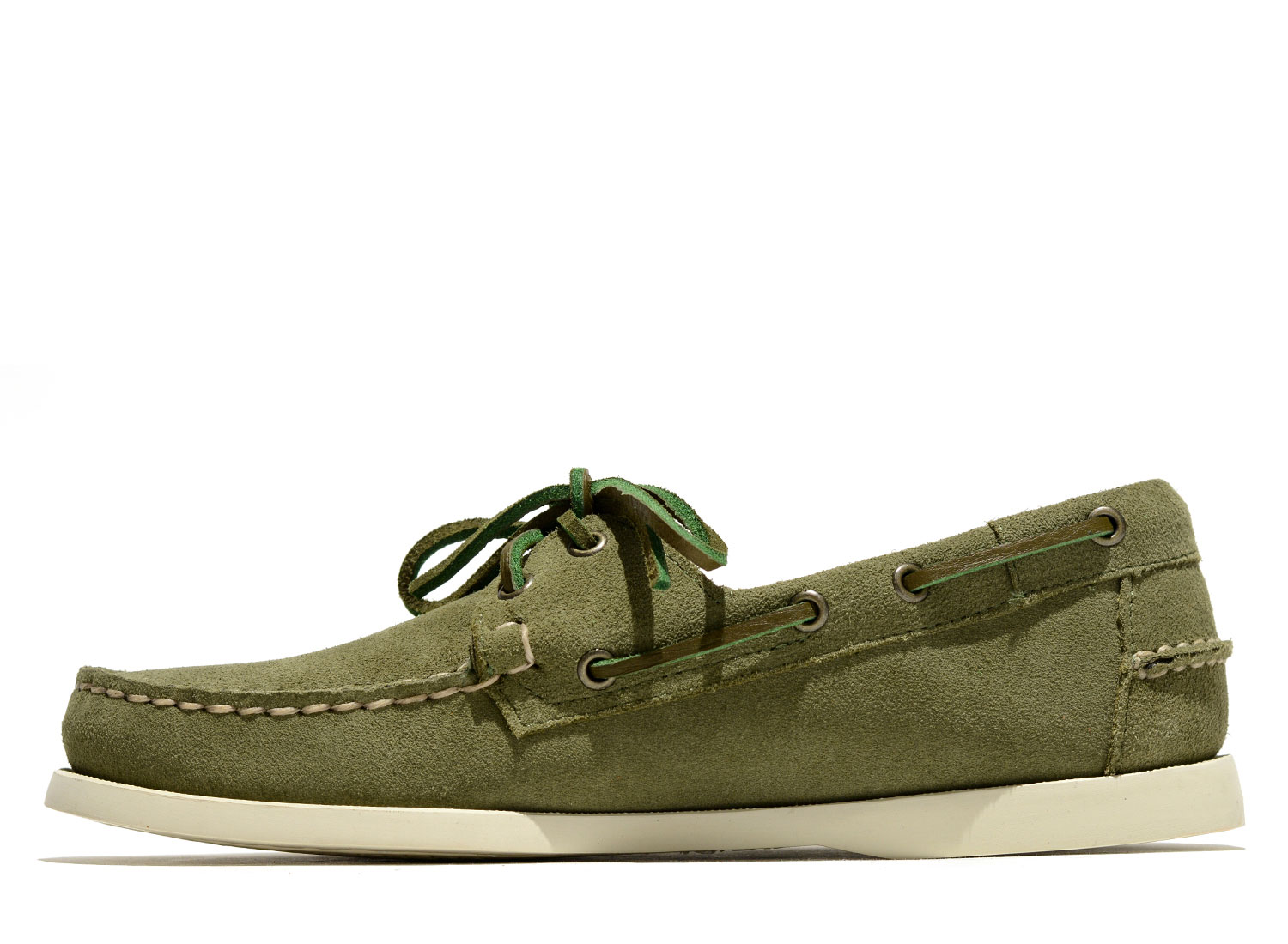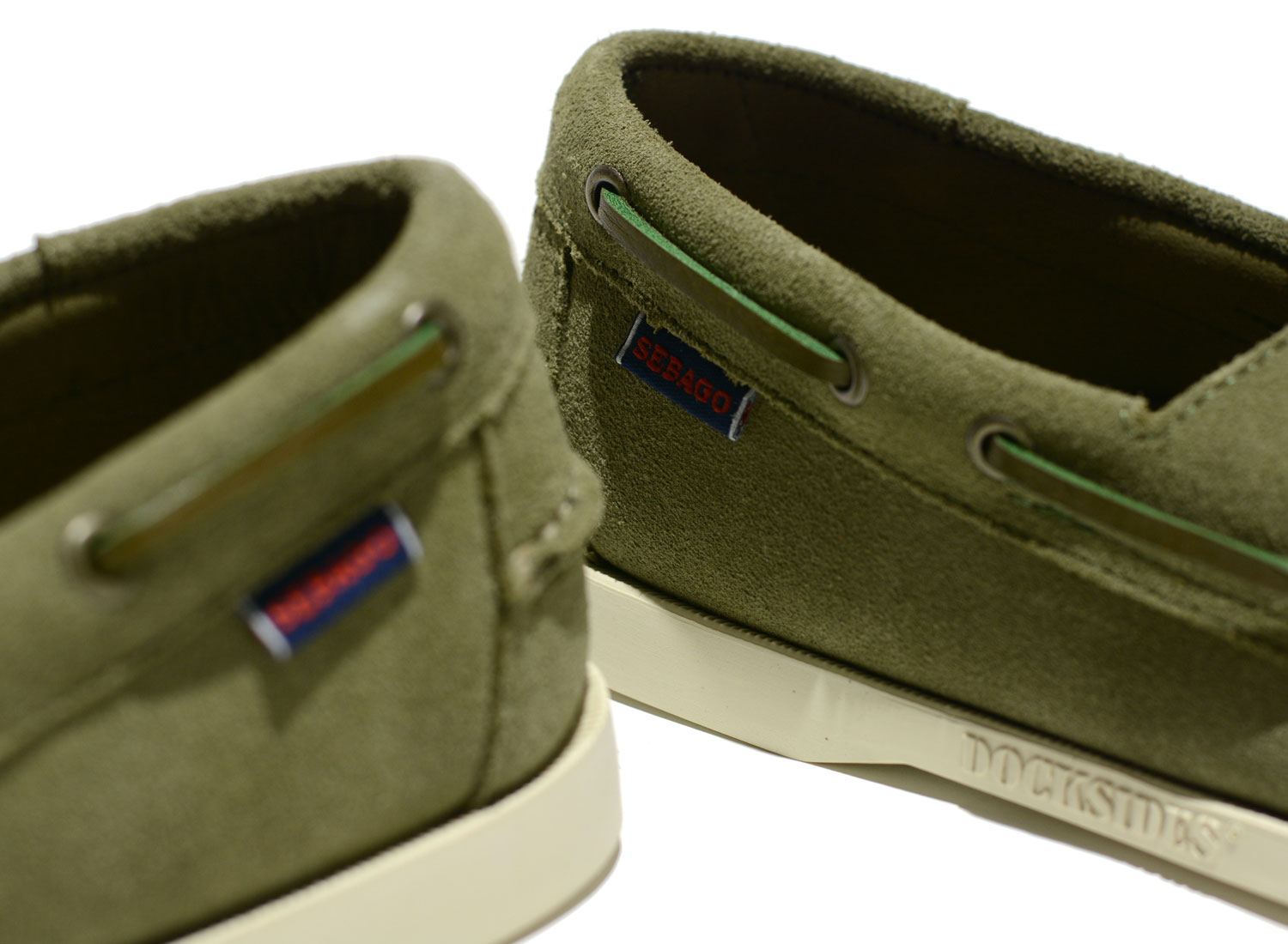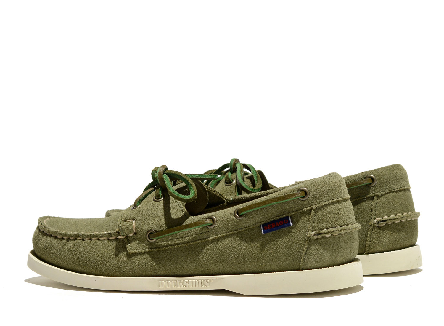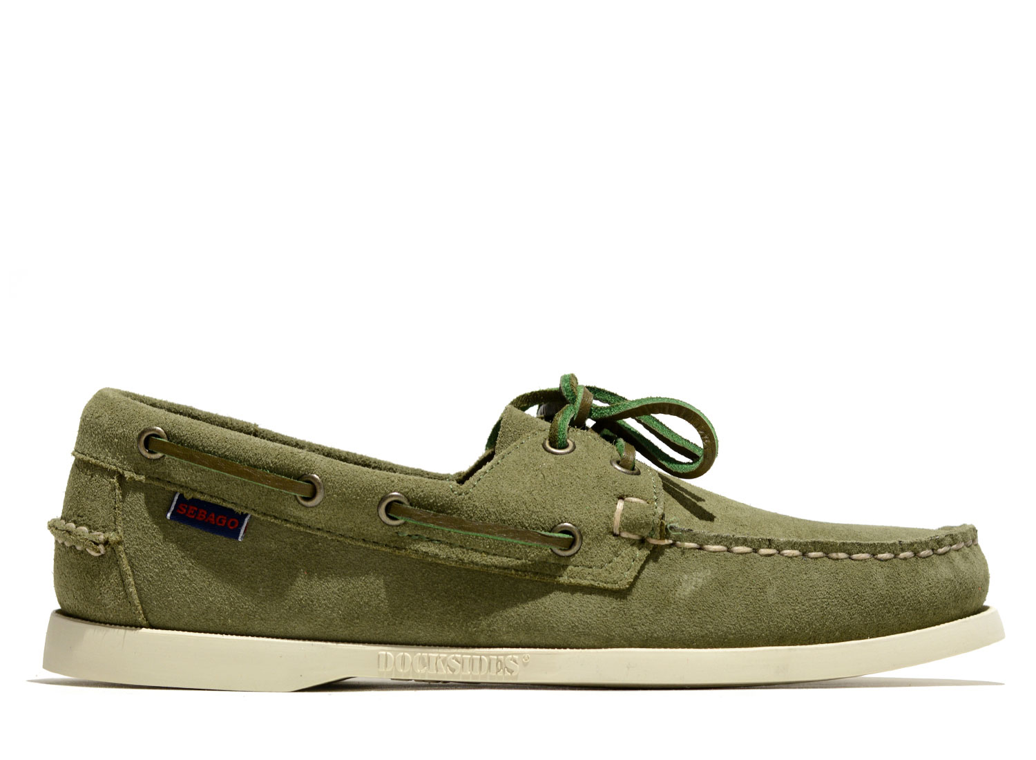 SEBAGO Docksides Portland Flesh Out Green Military. Docksides Portland Suede Beige Camel. The originals boat shoes from SEBAGO. Unlined upper made from suede. Leather insole. Raw laces all around the shoes. Rubber outsole.