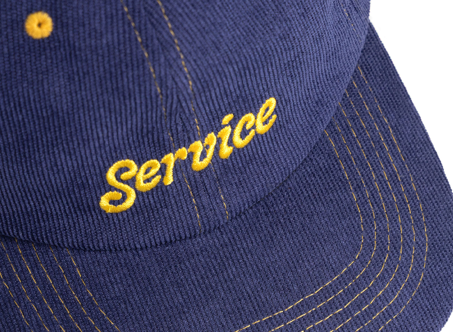 Service Works Service Script Cord Cap Navy. Adjustable 6-panel cap in corduroy. Embroidered logo on the front. Adjustable strap at the back.