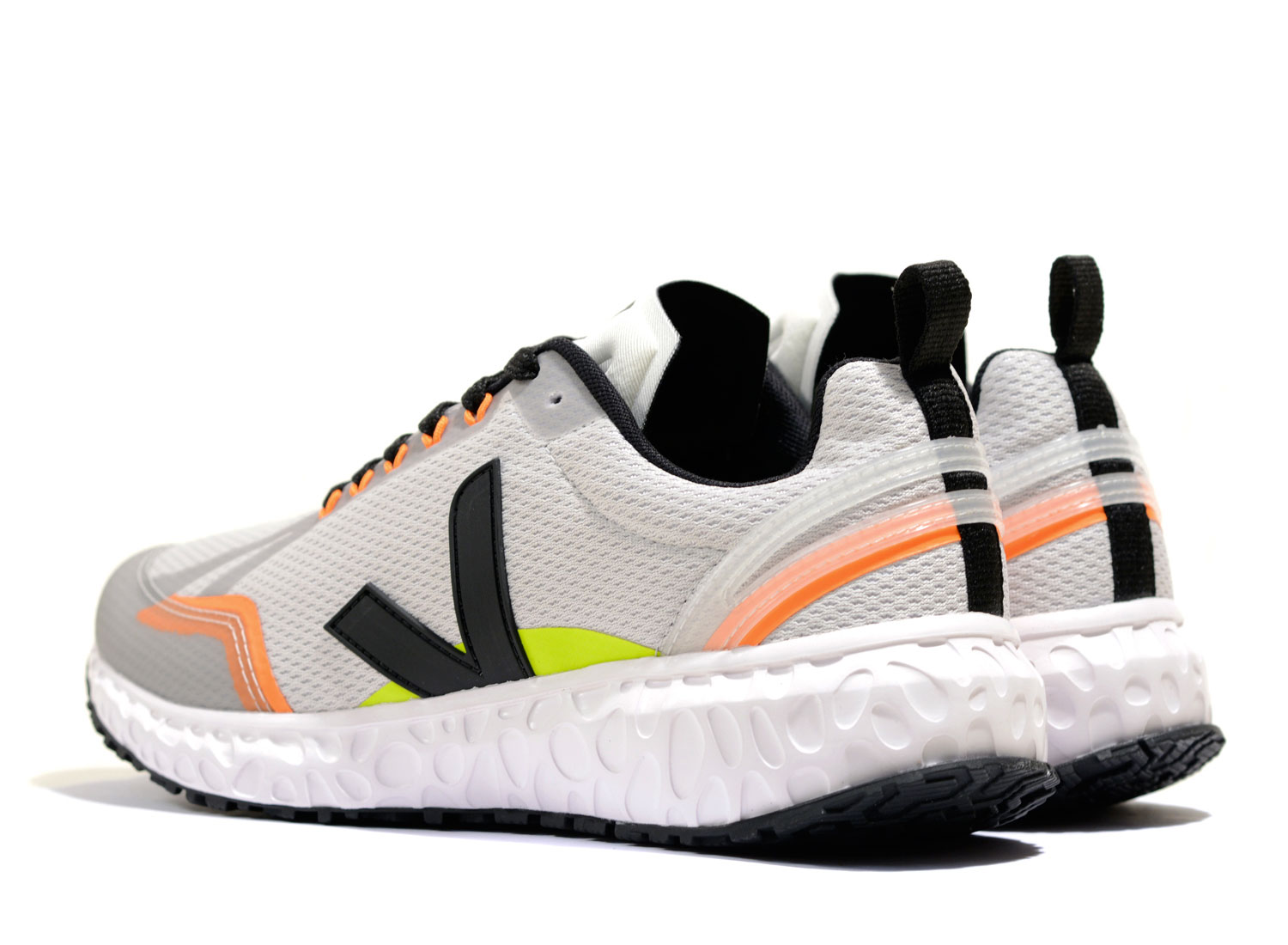 VEJA Condor Mesh Light Grey / Black. Veja introduce the 1st post-petroleum running shoe. Upper in Alveomesh (100% recycled plastic bottles) Panels made in T.P.U. Heel support insert made out of Pebax RNew (100% ricinus oil) Logo V made of Pebax RNew Lining in jersey (33% organic cotton & 67% recycled polyester) Insole made out of wild rubber (12%), recycled plastic bottles (12%), jute (12%), recycled E.V.A (8%), E.V.A. (56%) Midsole made out of sugar cane (22%), rice waste (15%), banana oil (8%), E.V.A. (55%) L-Foam cushioned technology (50% natural latex from Brazil & 50% synthetic latex) Outsole made of wild rubber from the Amazonian forest (30%) and rice waste (31%) Made in Brazil, in the region of Fortaleza.