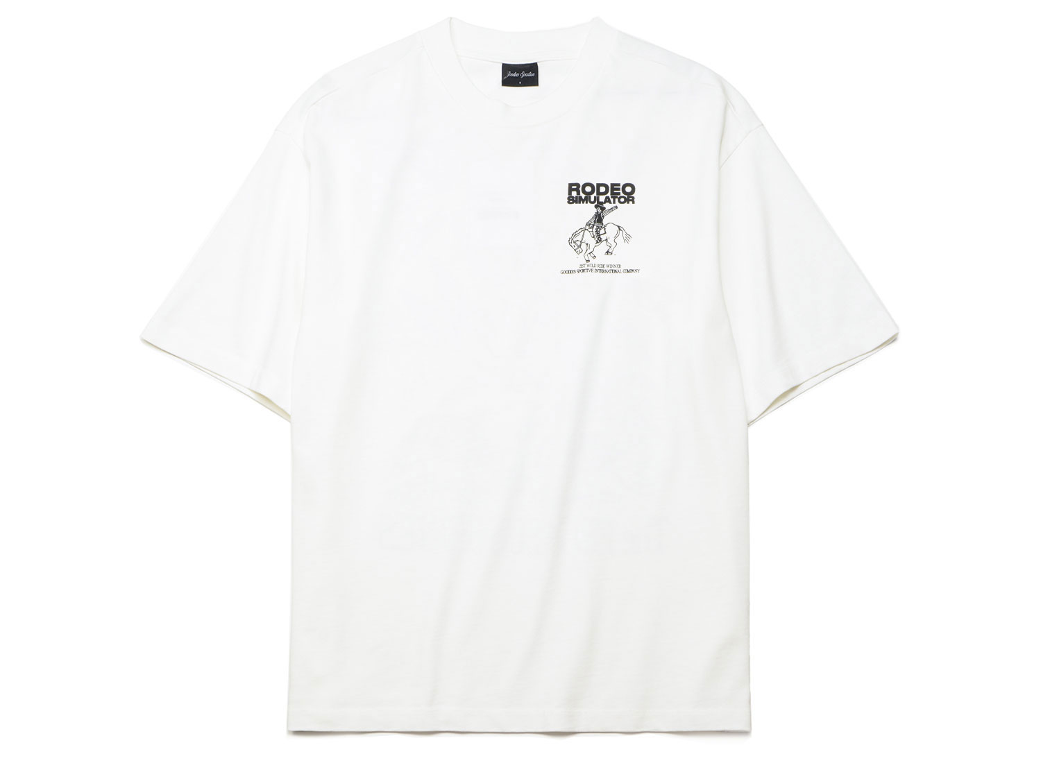 GOODIES SPORTIVE Rodeo Simulator White Tee. T-shirt col rond confectionné en jersey 100% coton. Coupe oversize. Bord-côte au col. Impression sur l'avant et l’arrière. Prévoir une taille en moins si vous souhaitez un fit regular.