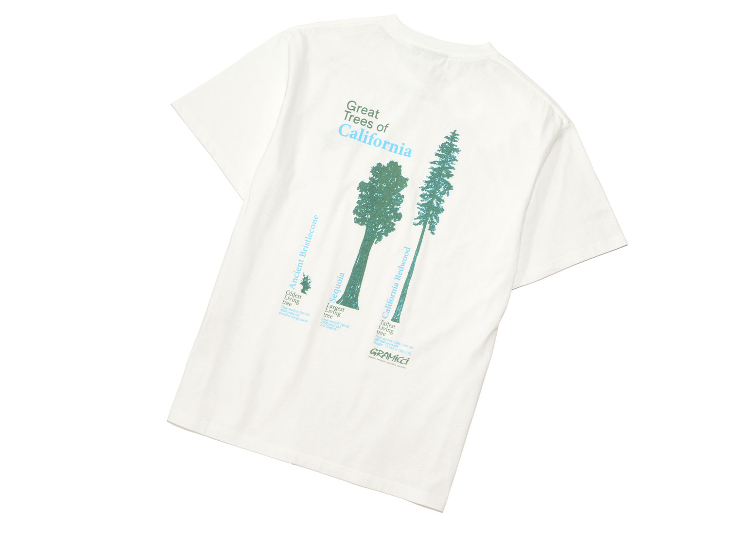 GRAMICCI Cali Trees Tee White. Jersey de coton 100 % biologique. Logo Gramicci sur le torse et impression au dos.