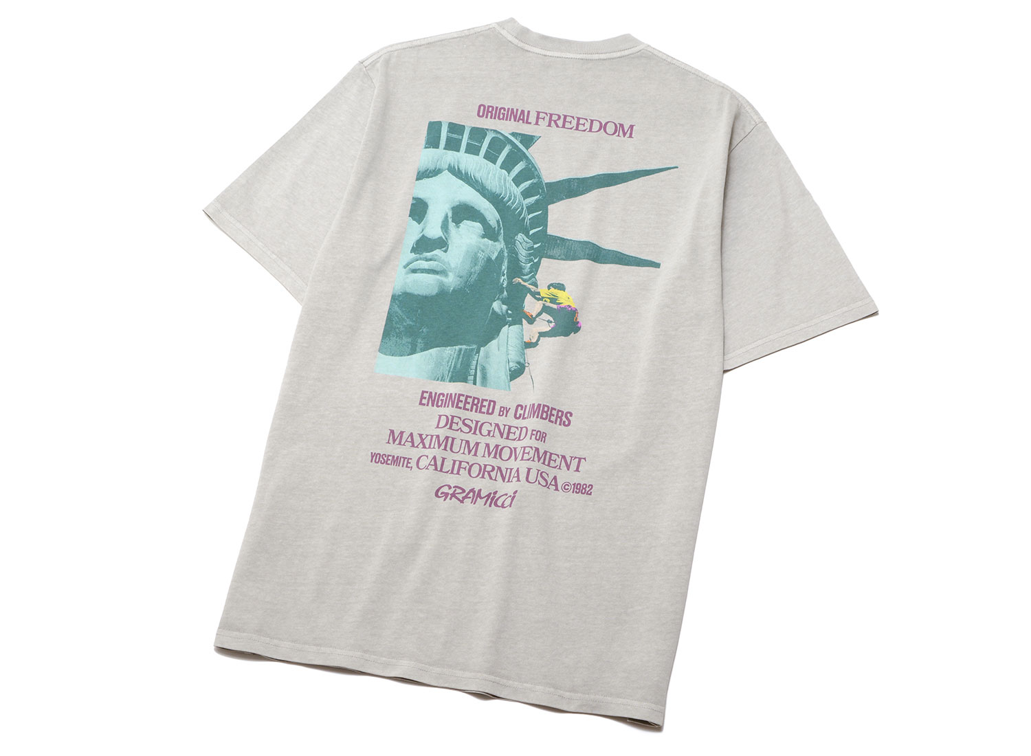 GRAMICCI Liberty Tee Pigment Slate. Jersey de coton 100 % biologique. Coupe ample. Impression sur le torse et au dos.