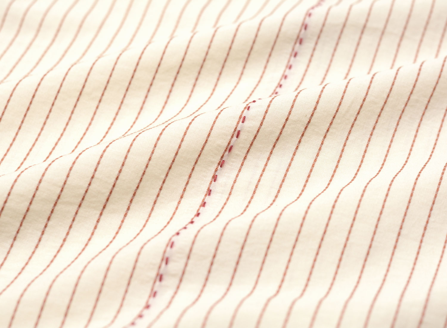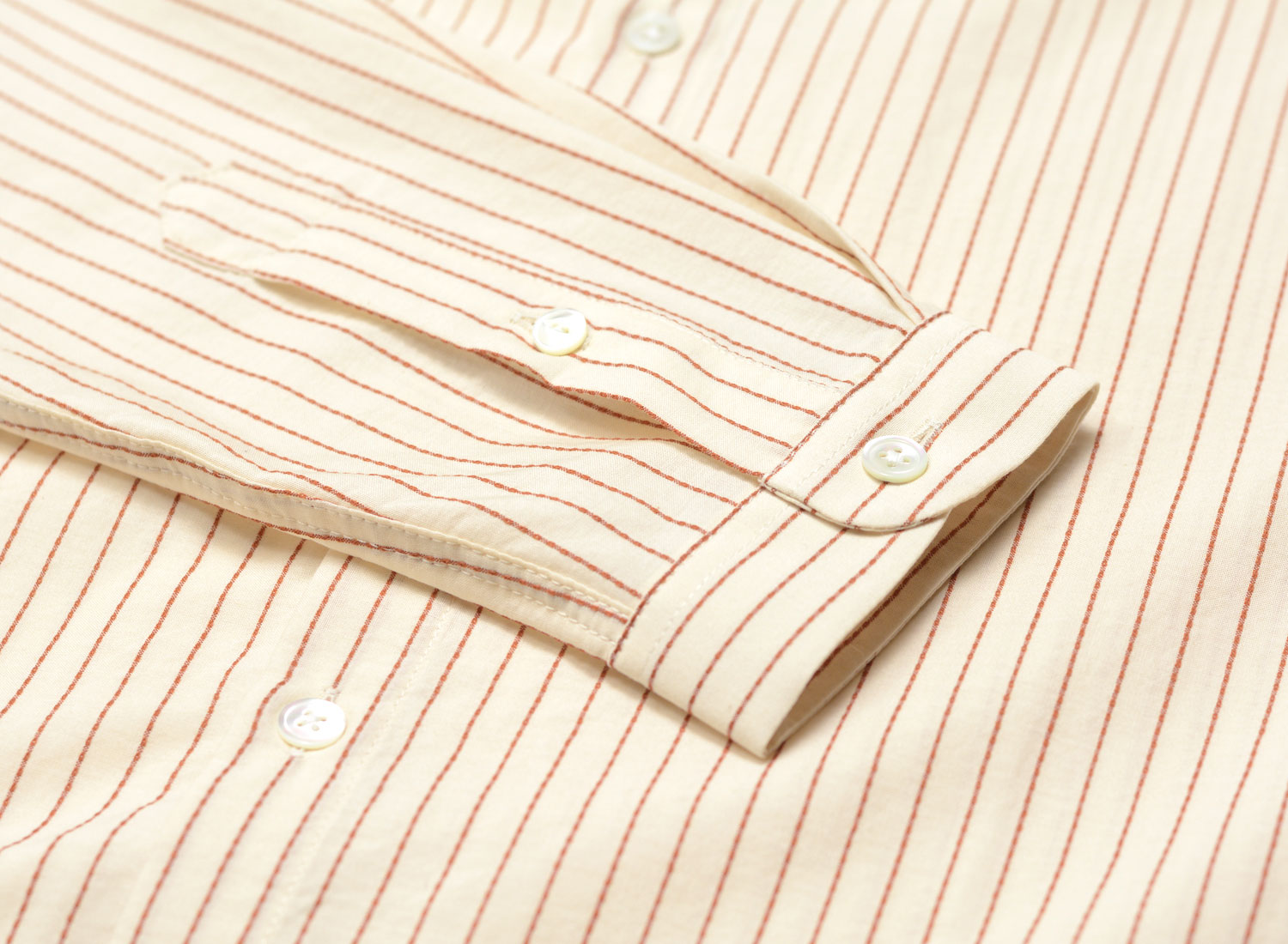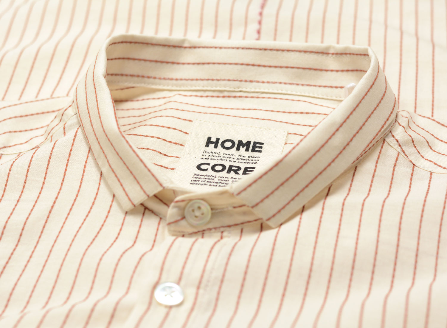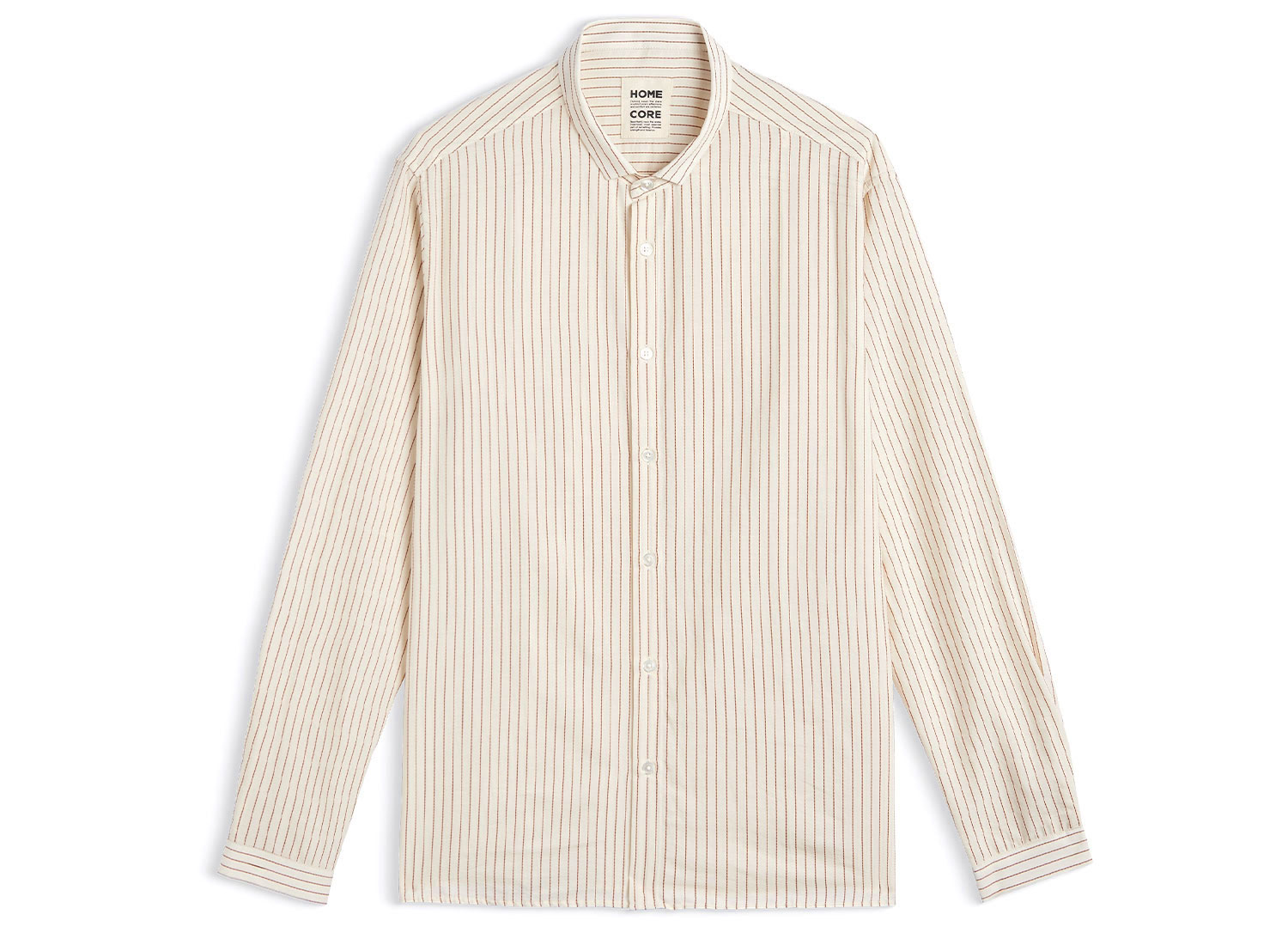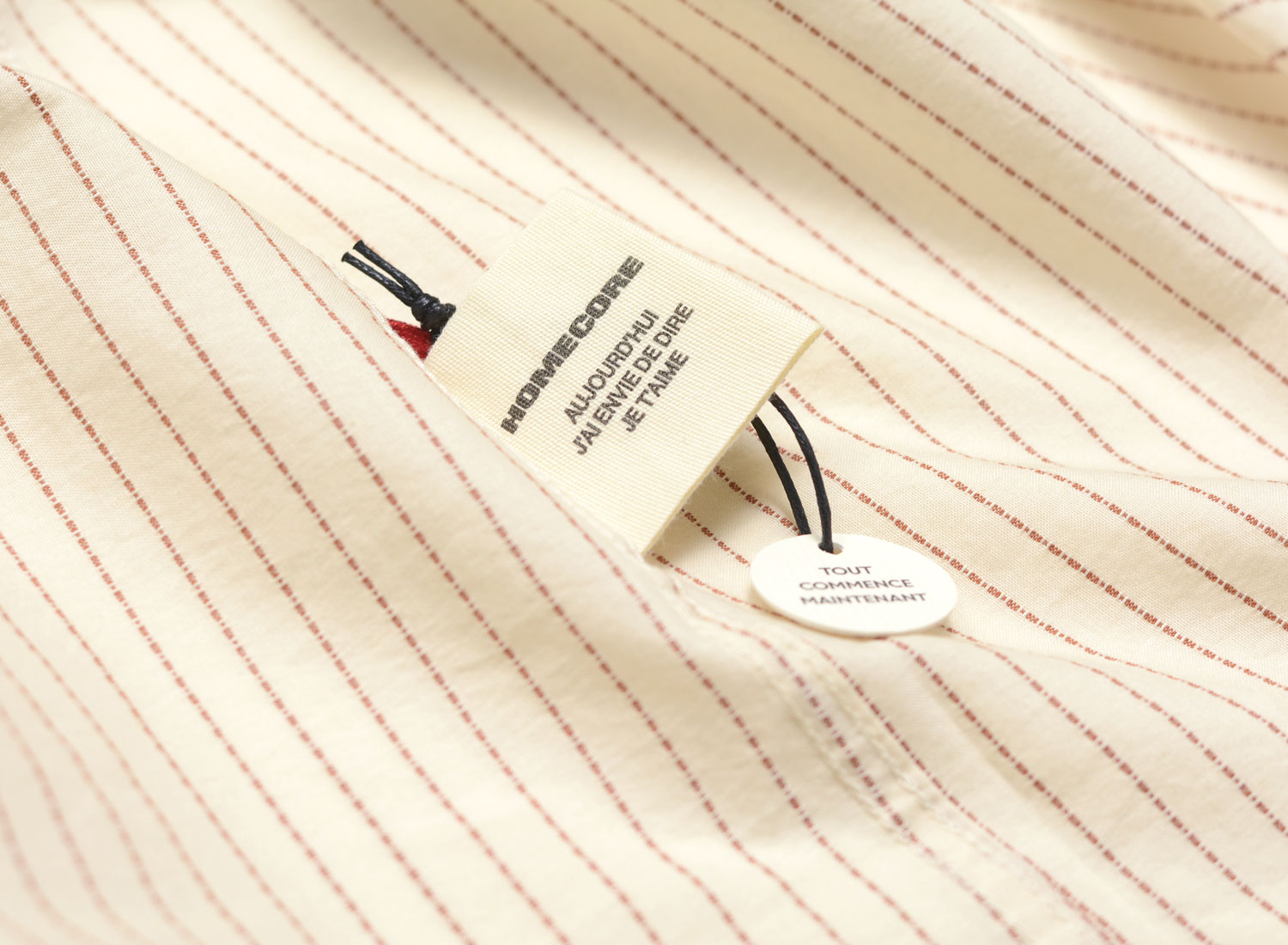 HOMECORE Pala Impreza Shirt White / Red. Chemise rayée coupe droite confectionnée dans un tissu jacquard très léger. 100% coton. Poignets boutonnés. Petit col. Découpe arrondie sur le bas. Surpiqure rouge dans le dos.