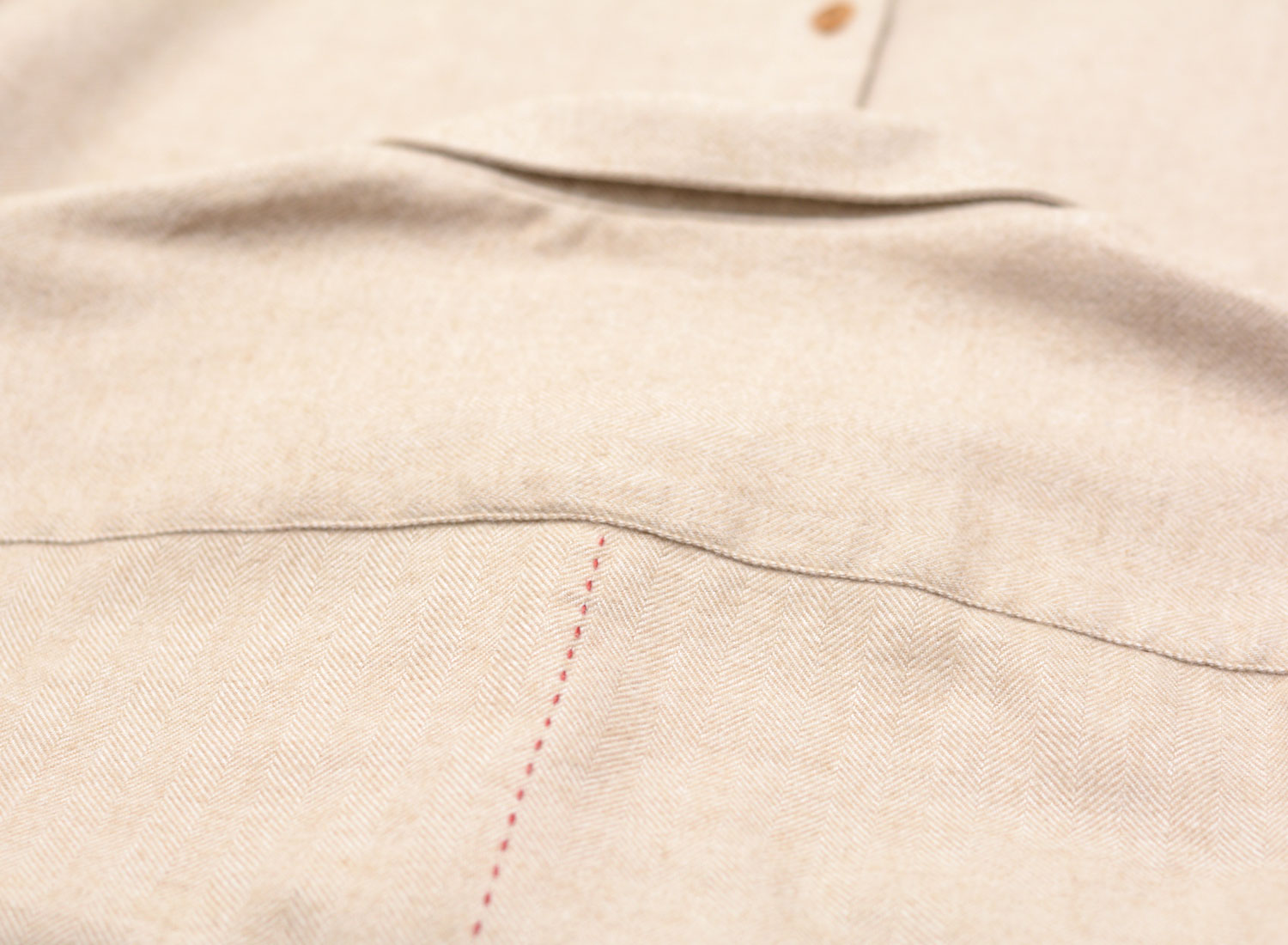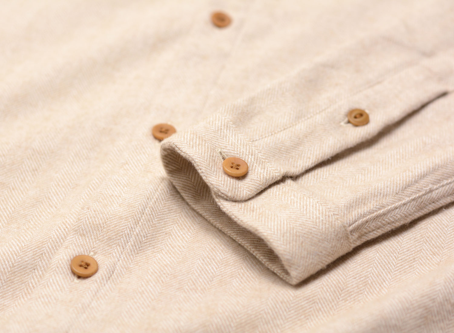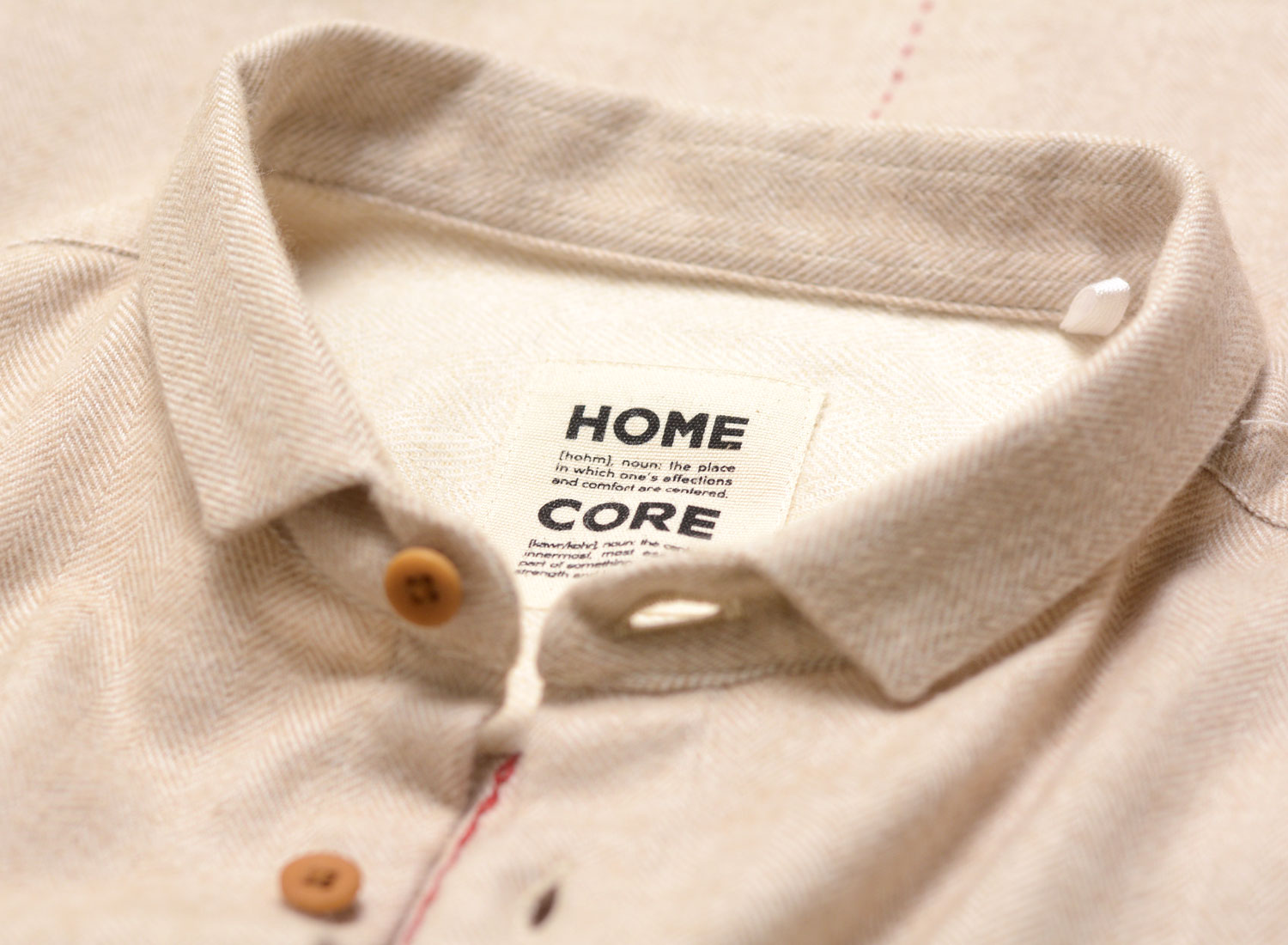HOMECORE Pala Llama Shirt Beige. Chemise coupe droite confectionnée dans une flanelle de coton très douce. 95% coton et 5% llama. Motif chevron. Poignets boutonnés. Col cassé. Découpe arrondie sur le bas. Surpiqure rouge dans le dos.