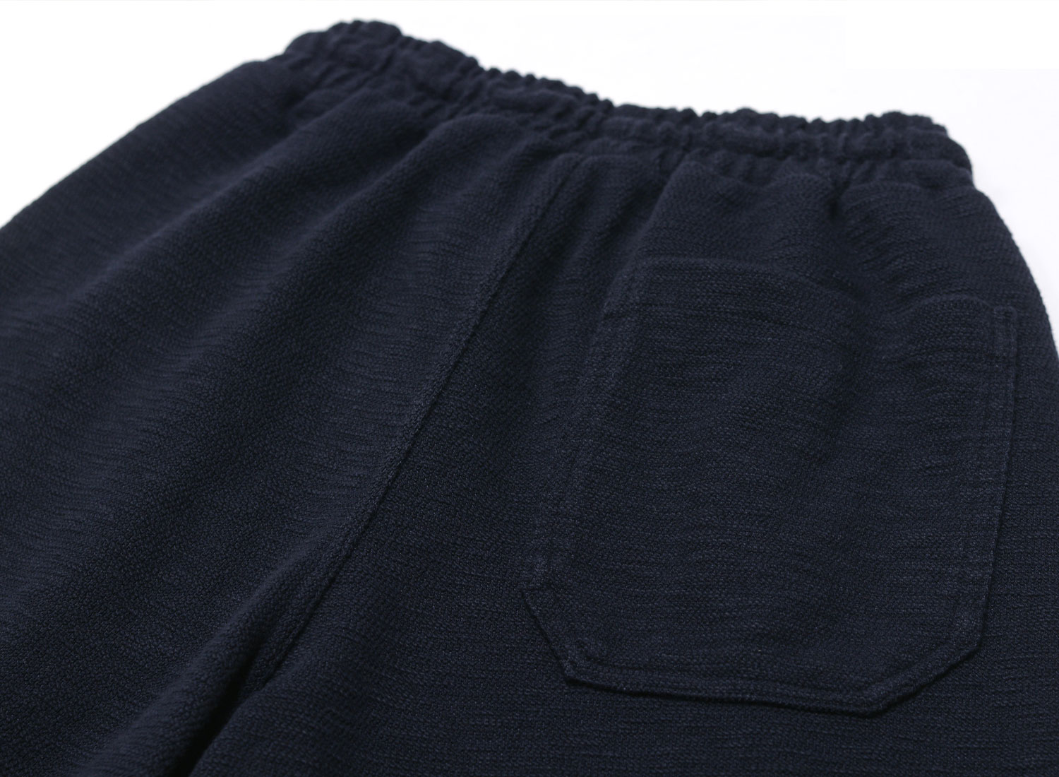 Confectionné dans un tissu italien souple et texturé, il adopte une coupe droite et une taille élastiquée avec cordons apparents, pour un look détendu mais soigné.