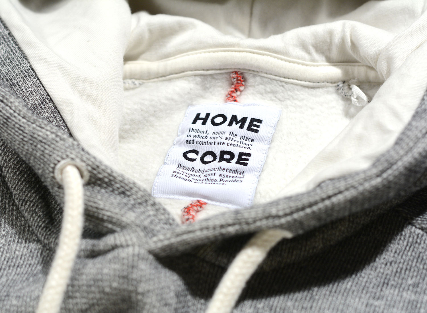HOMECORE Terry Hoodie Ash Grey. Sweatshirt à capuche confectionné en molleton de coton très doux. Coupe droite. Bords-côtes aux poignets et sur le bas. Cordon de serrage sur la capuche. Surpiqure rouge dans le dos.