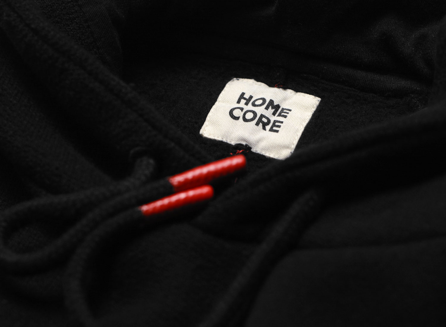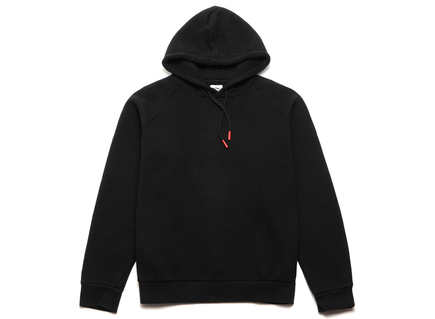 HOMECORE Terry Hoodie Black. Sweatshirt à capuche confectionné en molleton de coton très doux. Coupe droite. Bords-côtes aux poignets et sur le bas. Cordon de serrage sur la capuche. Surpiqure rouge dans le dos.