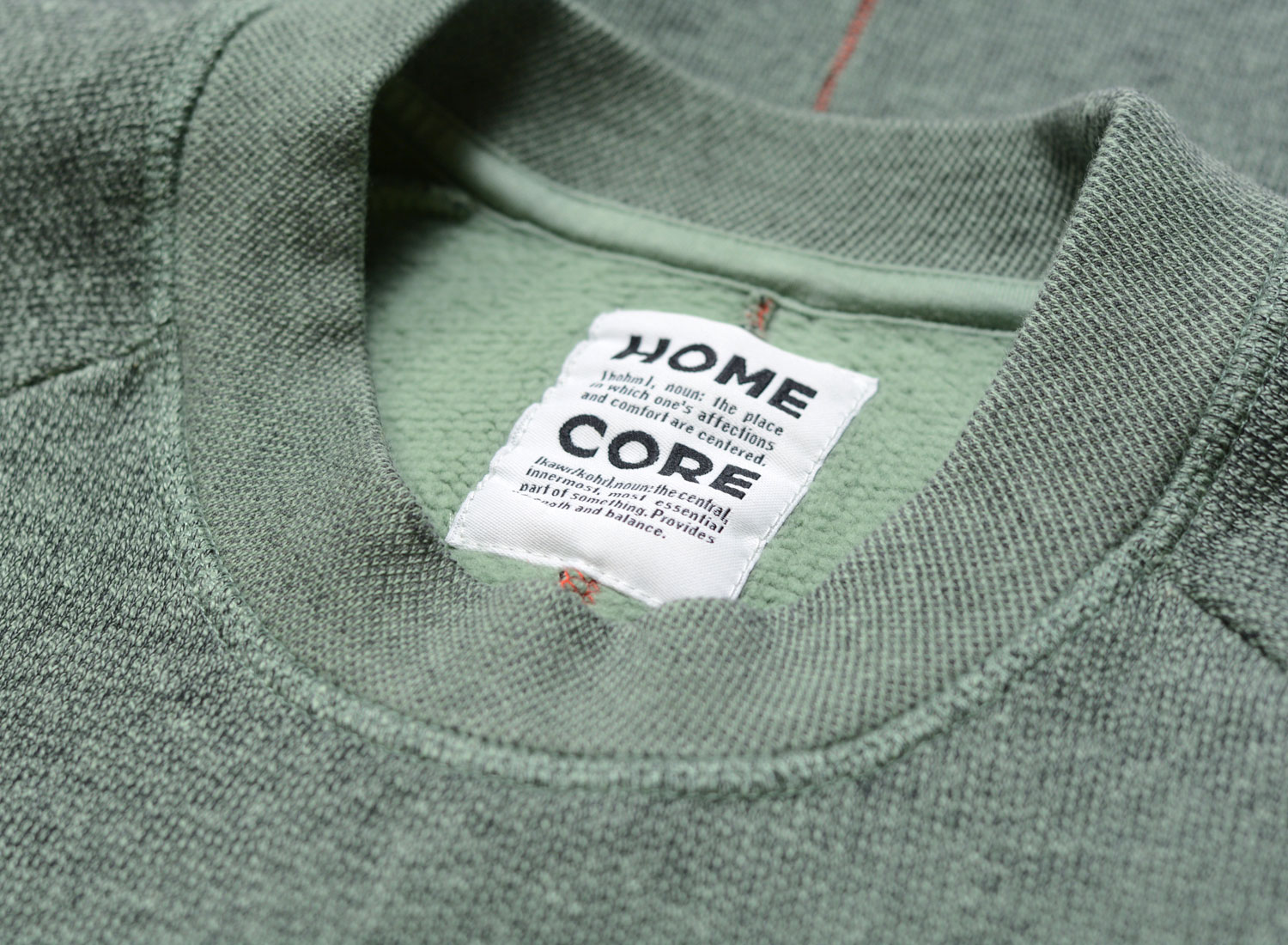 HOMECORE Terry Sweat Green Smoke. Sweatshirt col rond confectionné en molleton de coton très doux. Coupe droite. Bords-côtes au col, aux poignets et sur le bas. Surpiqure rouge dans le dos.