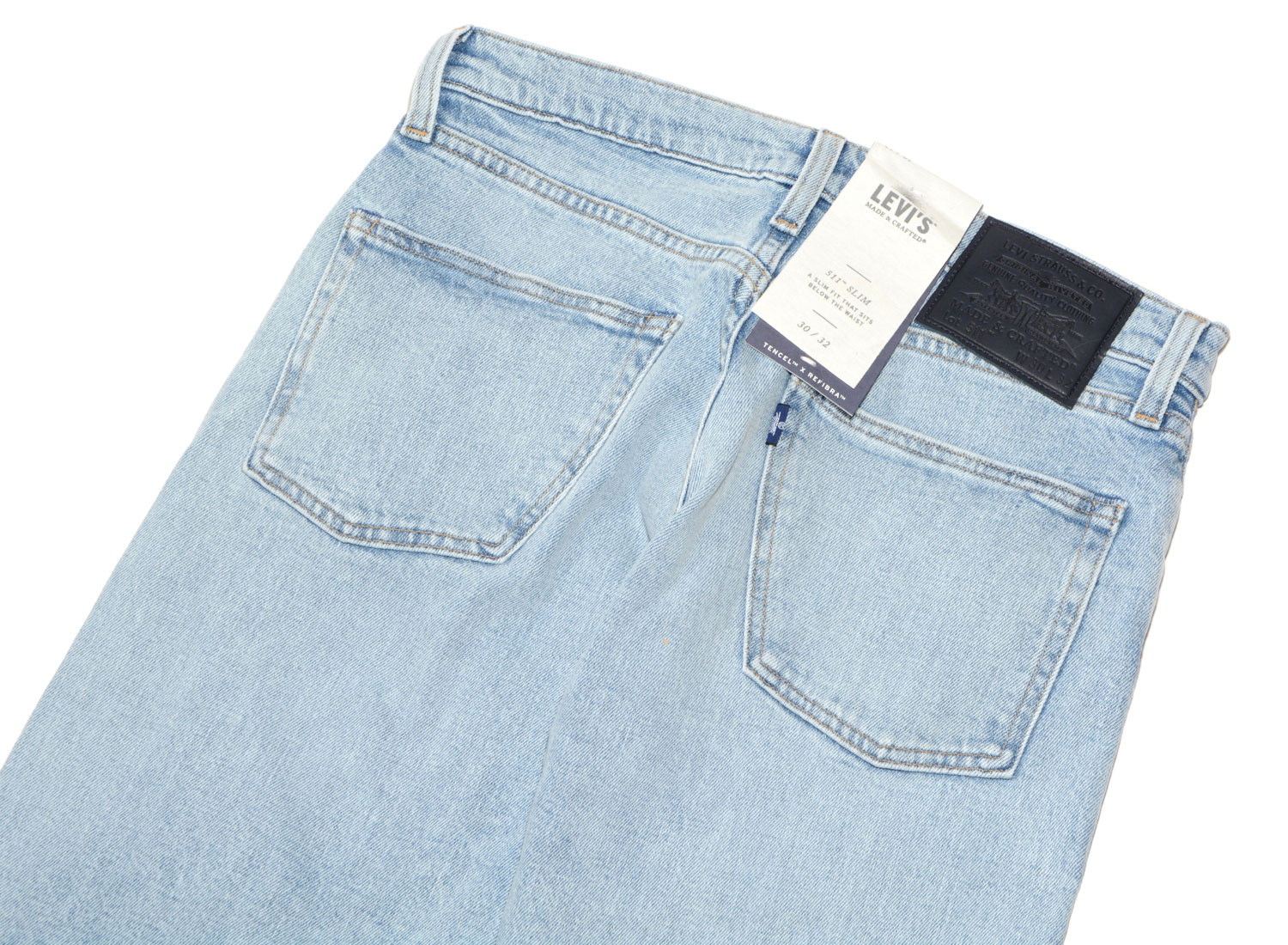 LEVI'S® MADE & CRAFTED® 511™ Jeans Slim Horizon Light Indigo. Denim coupe droite / slim confectionné en toile selvedge très douce et confortable. 68% coton / 31% Lyocell / 1% Elasthane. Braguette zippée. Poches rivetées. Patch cuir.