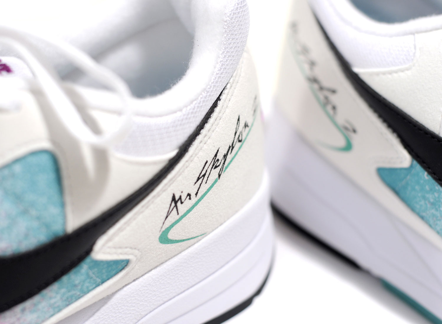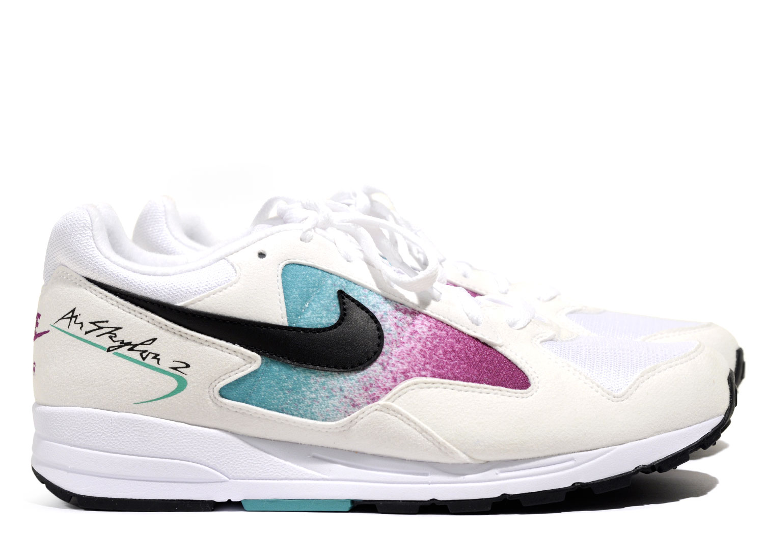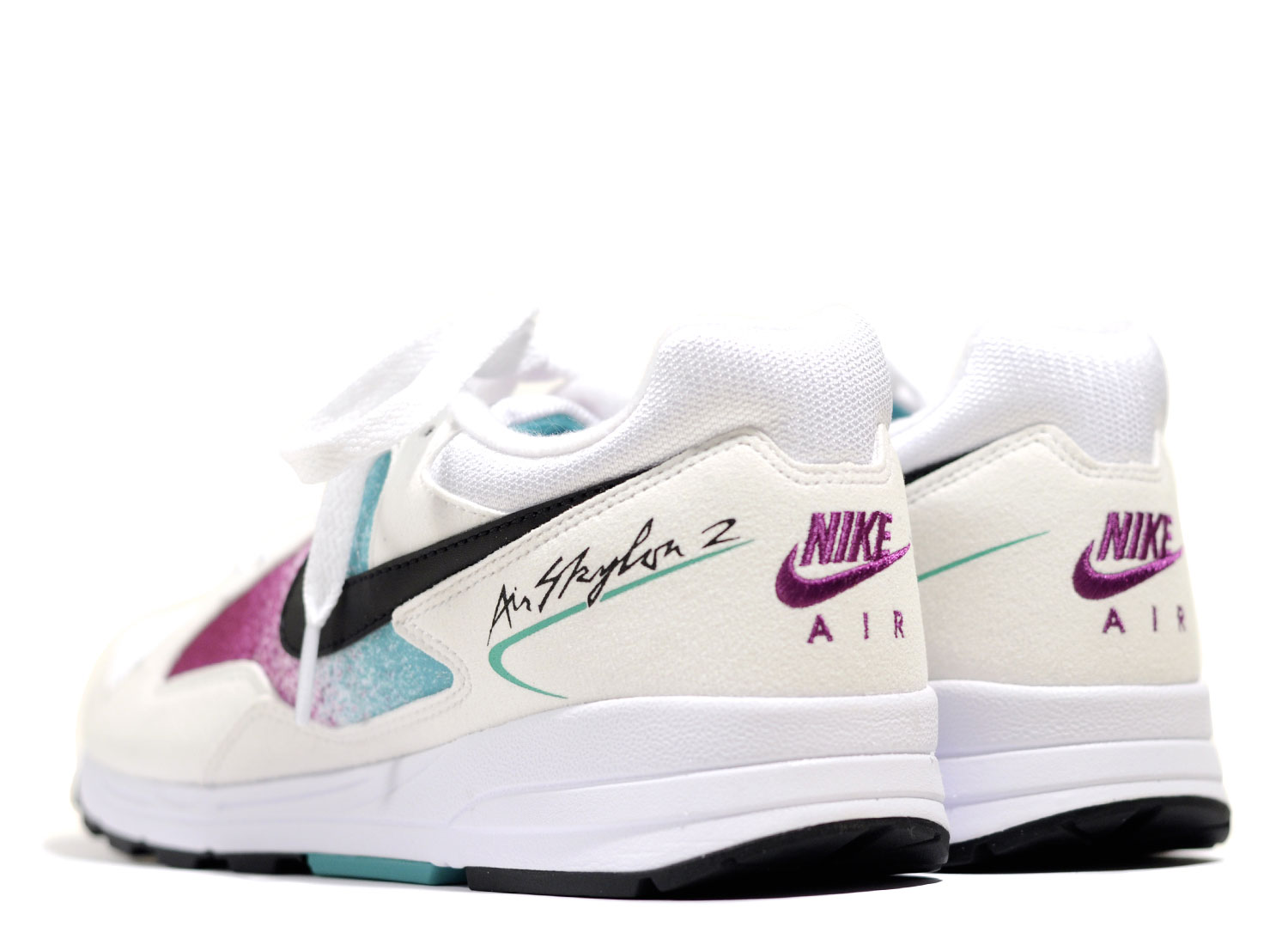 NIKE Air Skylon II White / Black / Clear Emerald AO4540-100. Très belle réédition de la AIR SKYLON 2 dans son coloris original. Mélange de nylon, mesh et suede. Broderie au talon. Quantités limitées.