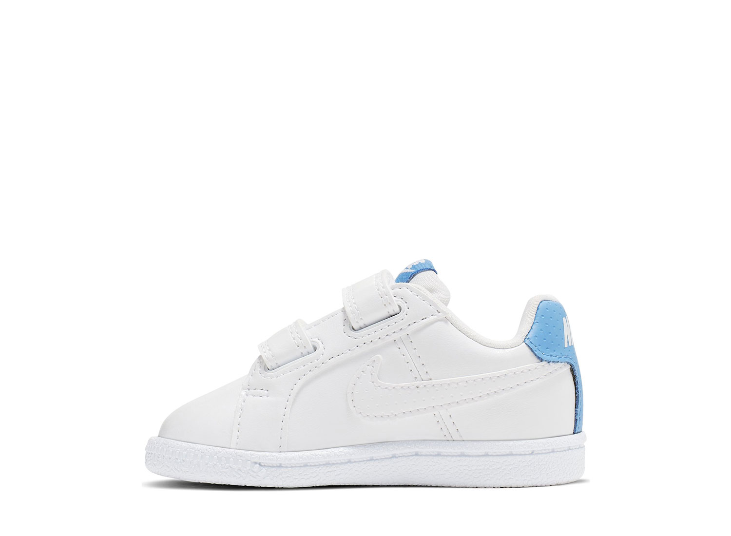 NIKE Court Royale White / University Blue 833537-106. Jolies Court Royal pour Baby. Empeigne cuir. Fermeture à scratchs.