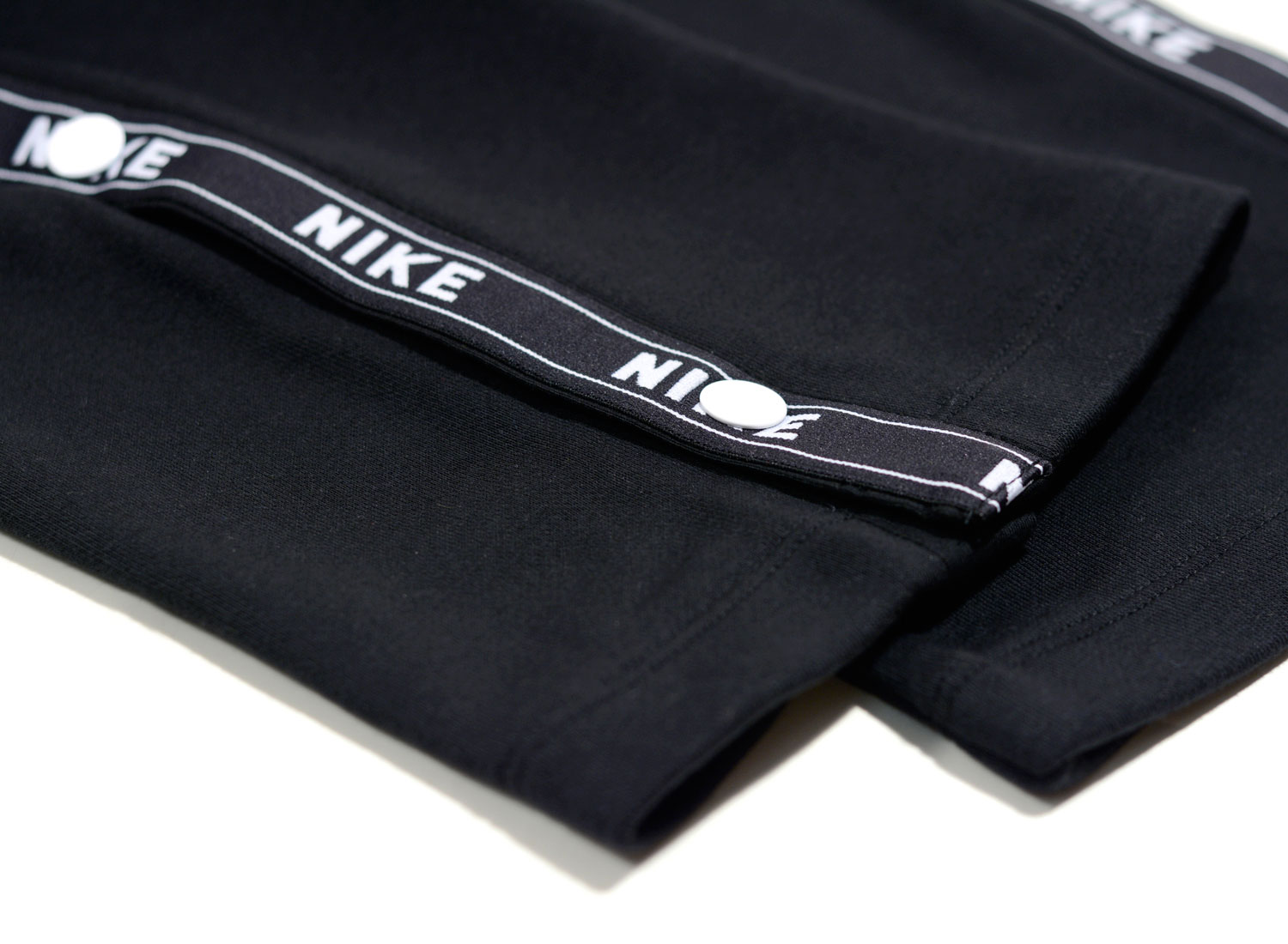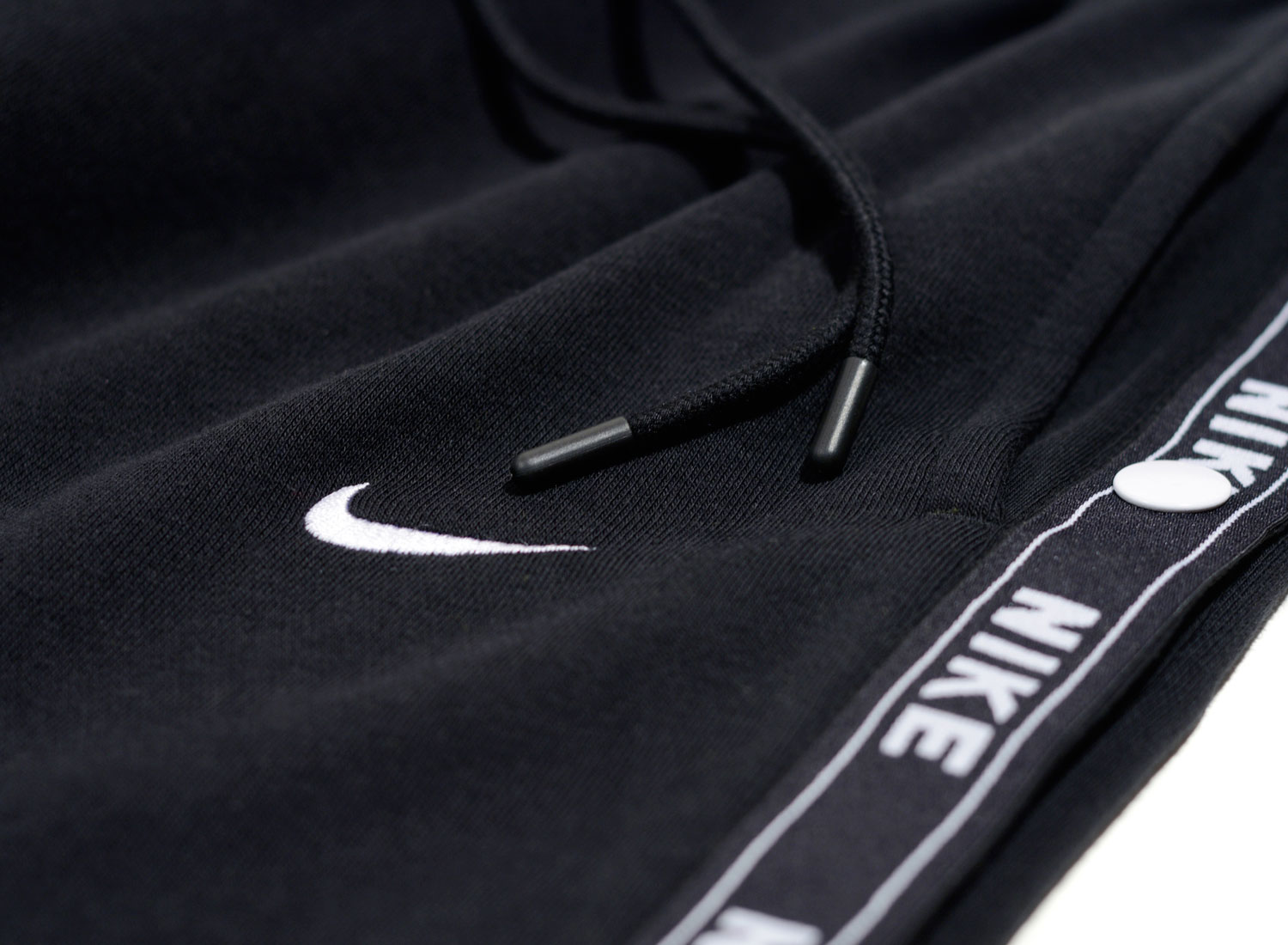 NIKE Wmns Tape Popper Pant Black AR9841-011. Jogg pants au look retro pour femme confectionné en molleton très doux 80% coton / 20% polyester. Coupe droite. Bandes côtés avec boutons pression. Poches côtés. Cordon de serrage à la taille.