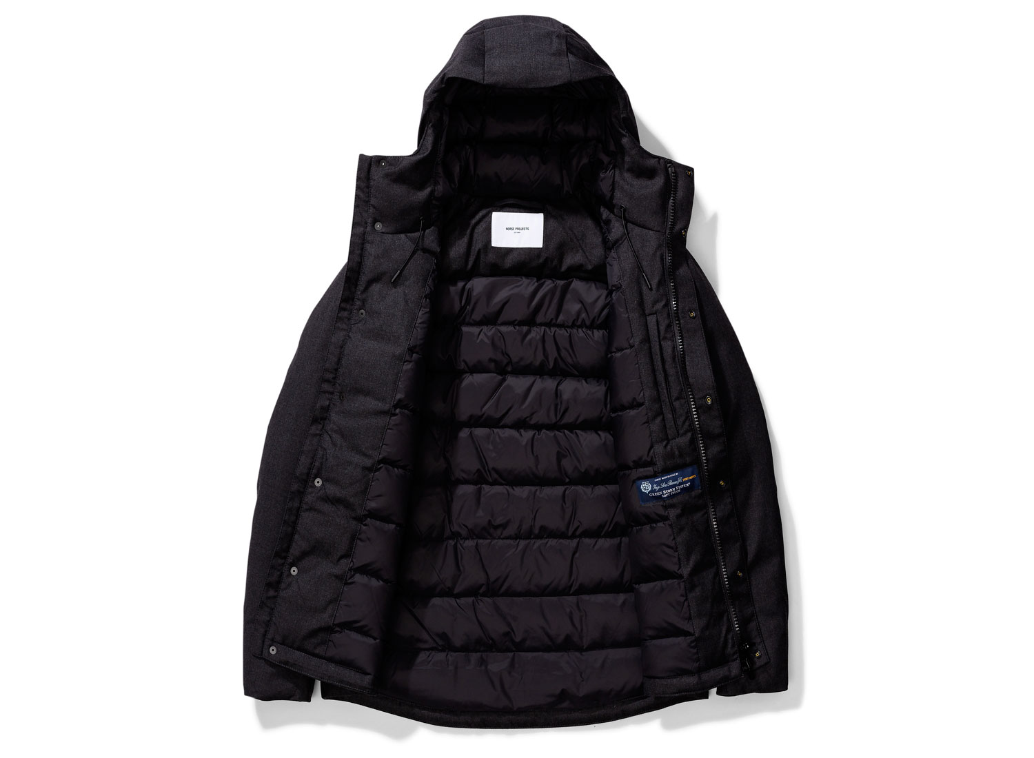 NORSE PROJECTS Fyn Technical Wool Charcoal Melange. Magnifique parka d'inspiration outdoor confectionnée en laine imperméable Loro Piana Storm System®. Tissu 100% laine de Nouvelle-Zélande tissé en Italie. Garnissage en duvet d'oie RDS 90/10. Doublure nylon. Coupe droite technique. Fermeture zippée avec rabat à pressions. Cordon de serrage sur la capuche et sur le bas. Poche passepoilée à l'intérieur. Poches zippées sur le bas. Bords-côtes aux poignets. Une des plus belle