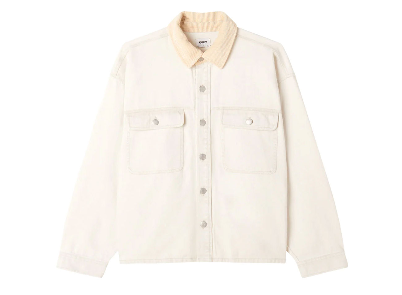 OBEY CLOTHING Idris Shirt Jacket Silver Grey. Veste en jean épaisse 100 % coton. Coupe droite. Col en velours côtelé. Fermeture à boutons. Patte de boutonnage aux poignets . Poches poitrine à rabats boutonnés. Poches passepoilées sur les cotés.