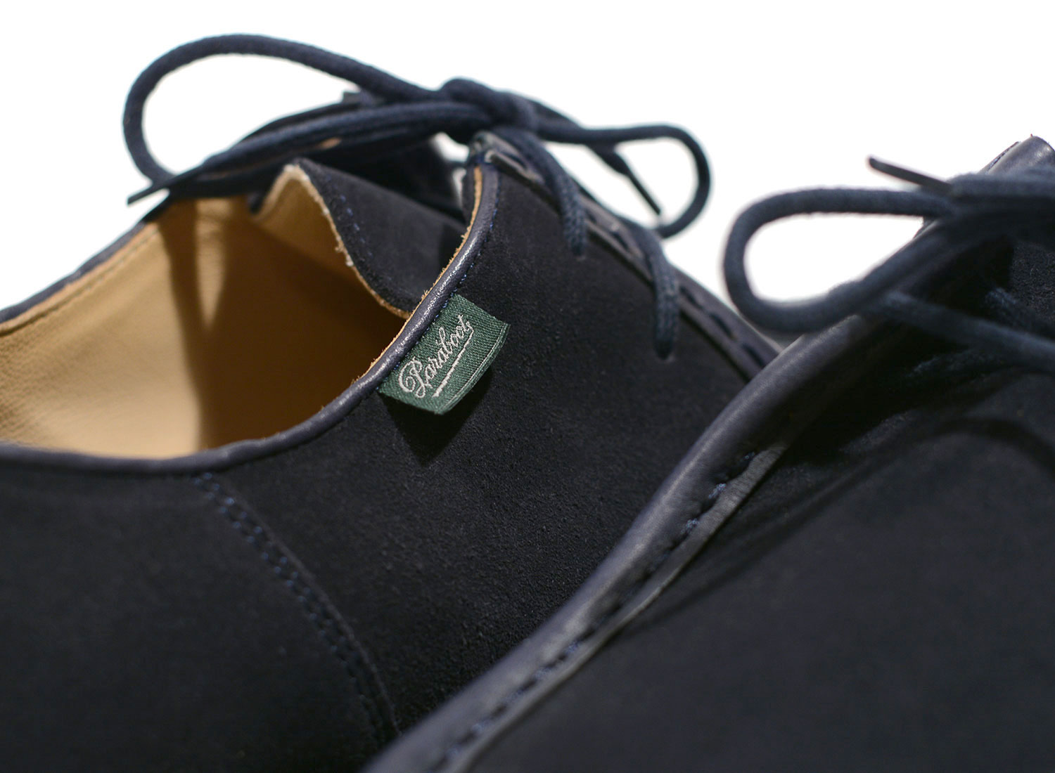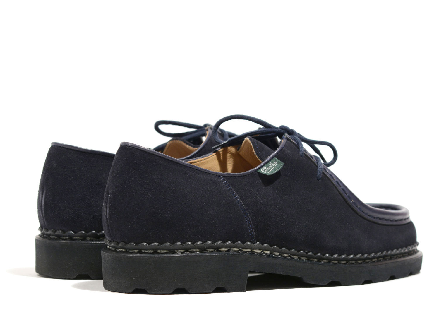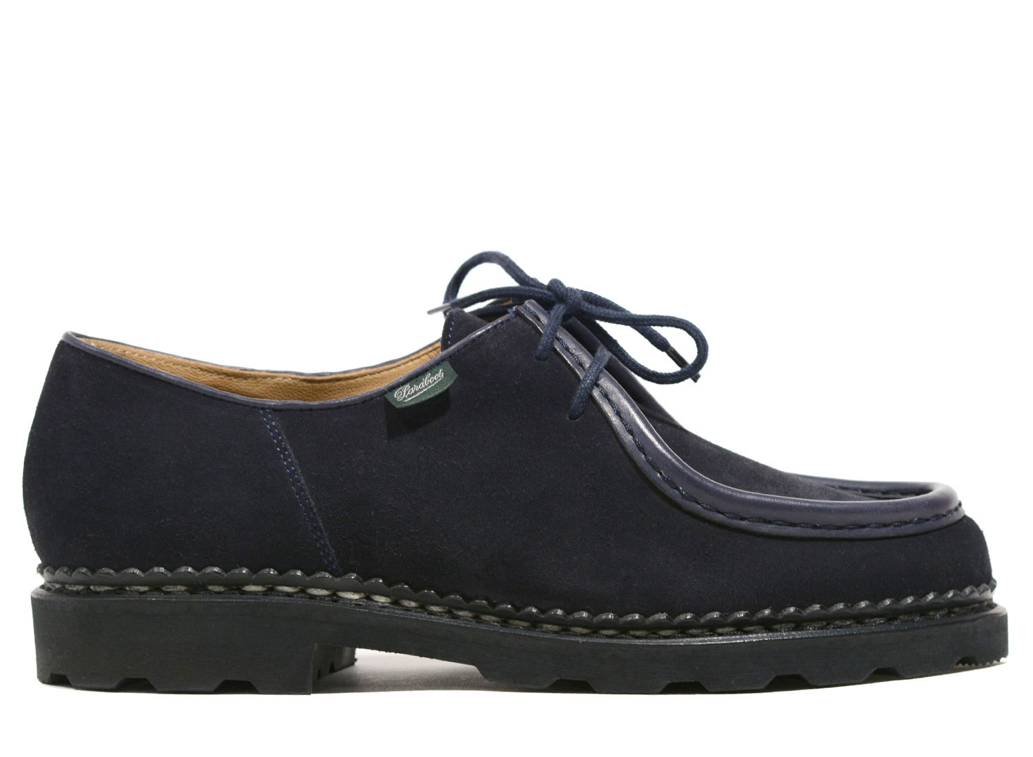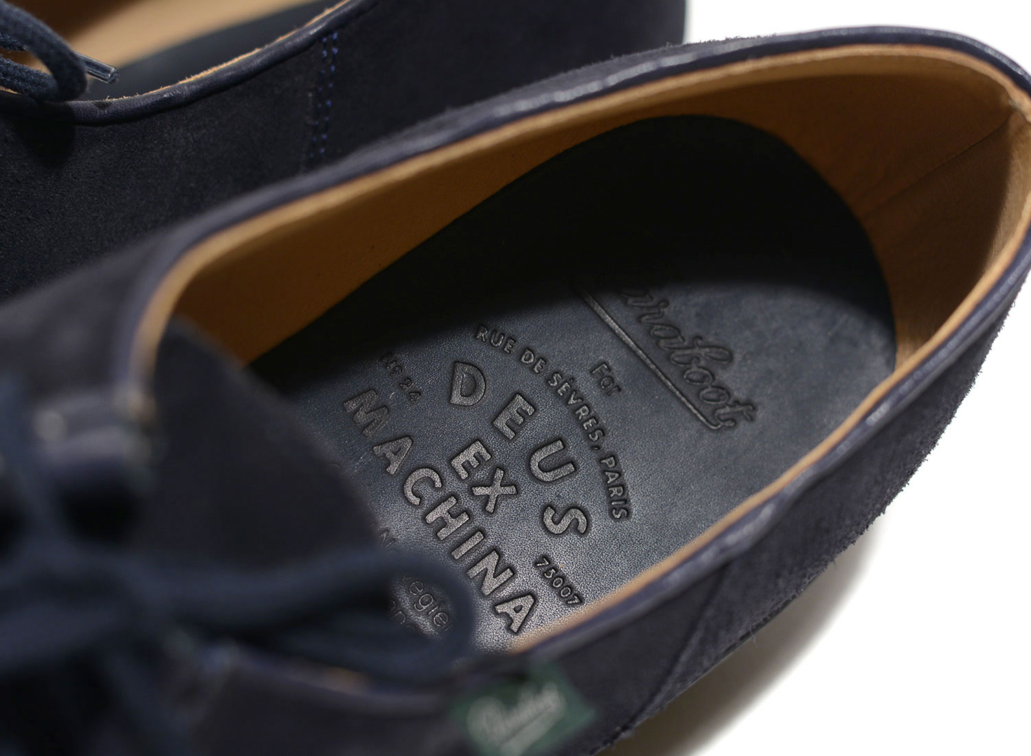 PARABOOT For x DEUS EX MACHINA Michael Marine. Modèle iconique de la collection PARABOOT réalisé en collaboration avec DEUS EX MACHINA. Derby plateau jointé bourrelet , 2 oeillets. Modèle doublé cuir, véritable cousu norvégien, sur semelle gomme naturelle. Semelle intérieure embossée. Fait à la main en France.