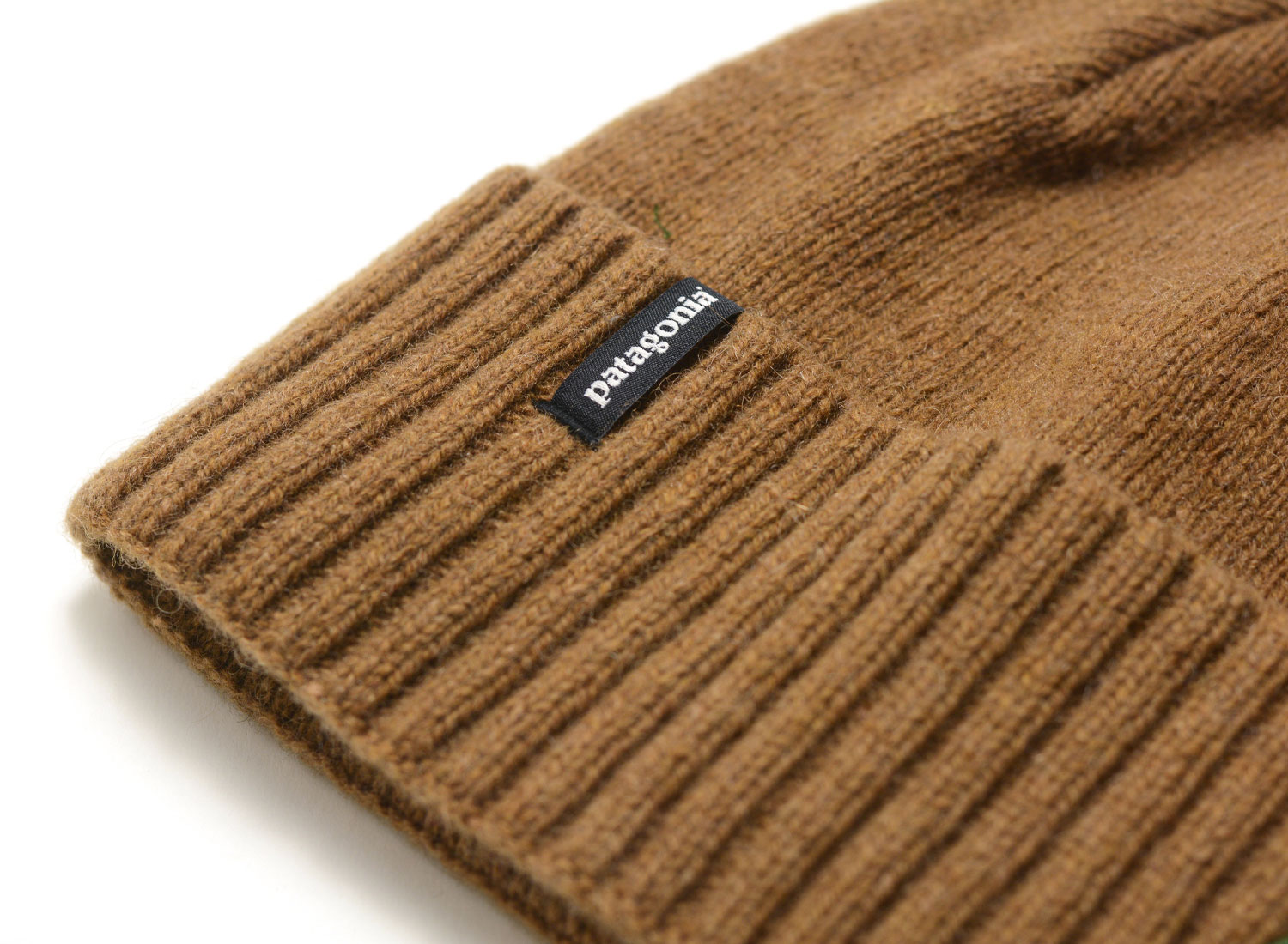 PATAGONIA Brodeo Beanie Shelter Brown. Bonnet à revers classique en laine et nylon recyclés. Confection Fair Trade Certified™. Patch cousu sur l'avant. 70% laine recyclée, 26% nylon recyclé et 4% élasthanne.