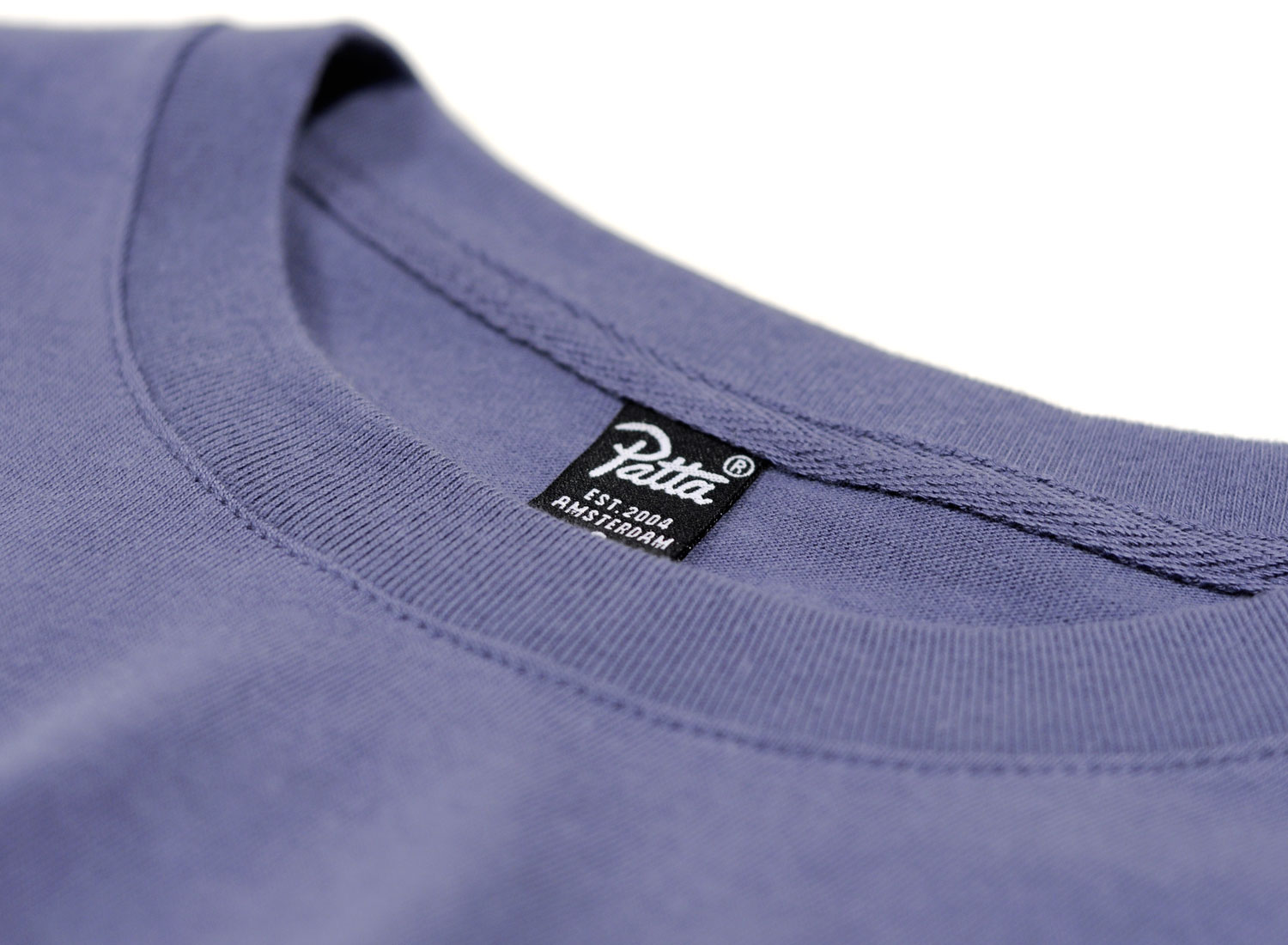 PATTA Athletic Logo Longsleeve Vintage Indigo. T-shirt manches longues confectionné en coton jersey épais. Impression réfléchissante 3M sur l'avant. Coupe droite. bords-côtes aux poignets et au col.