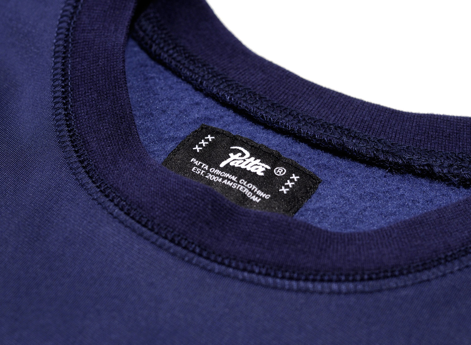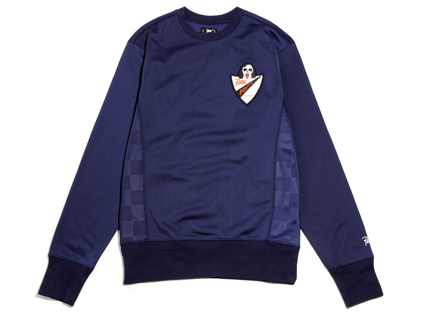 PATTA Positivity Warm Up Crewneck Sweater Black Iris. Sweatshirt col rond en molleton 100% Polyester. Coupe droite. Patch sur la poitrine. Damier ton sur ton sur les côtés.