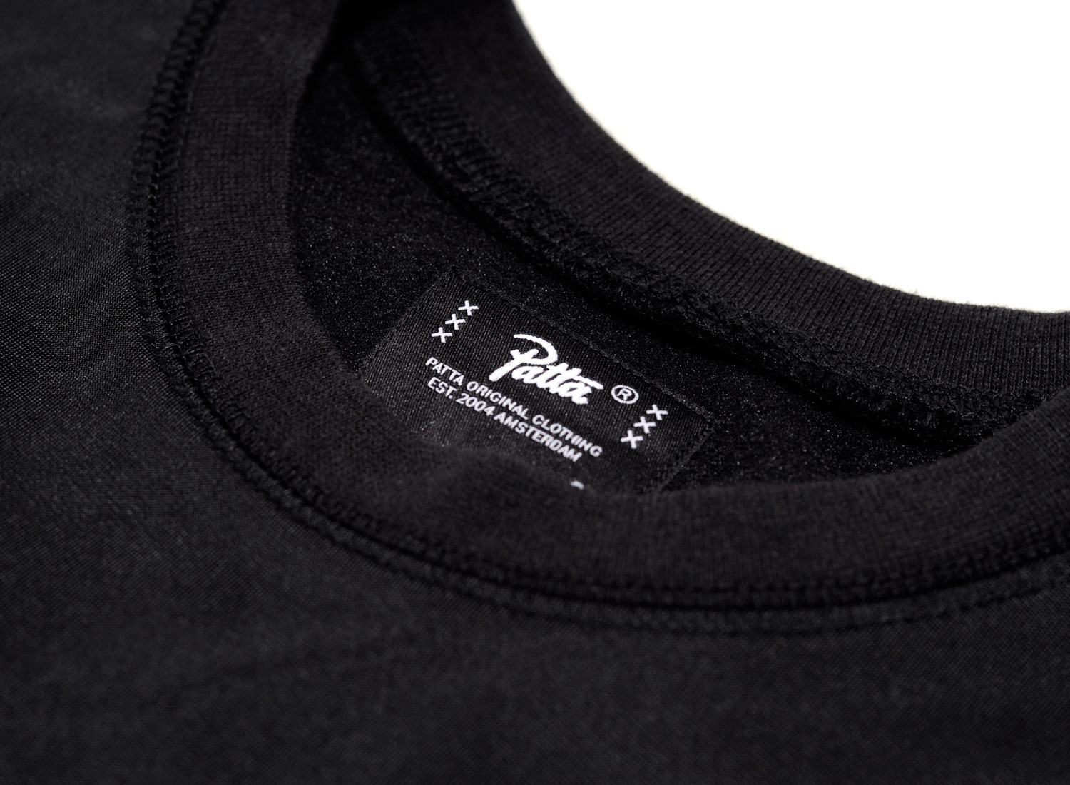 PATTA Positivity Warm Up Crewneck Sweater Black. Sweatshirt col rond en molleton 100% Polyester. Coupe droite. Patch sur la poitrine. Damier ton sur ton sur les côtés.