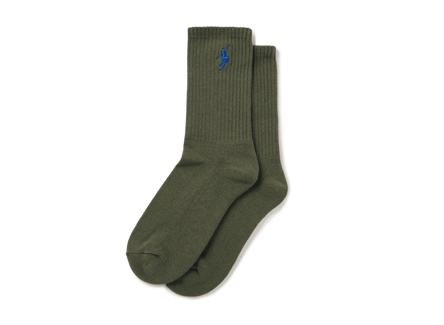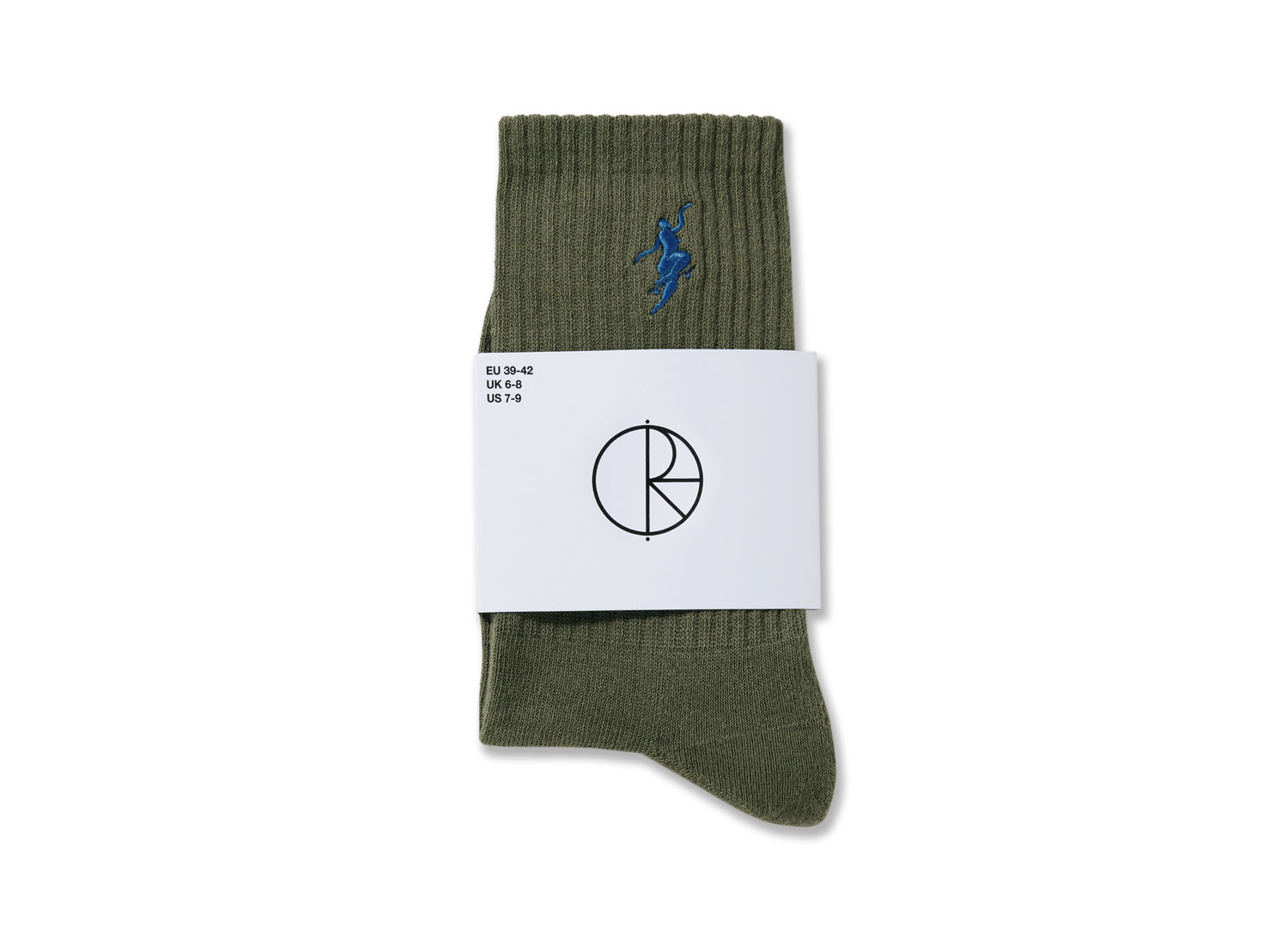 POLAR SKATE CO Rib Socks No Comply Dusty Olive / Blue. Chaussette 85% coton / 10% polyester / 5% spandex. Logo brodé sur le coté. Guide des tailles: M = 39/42 L = 43/46