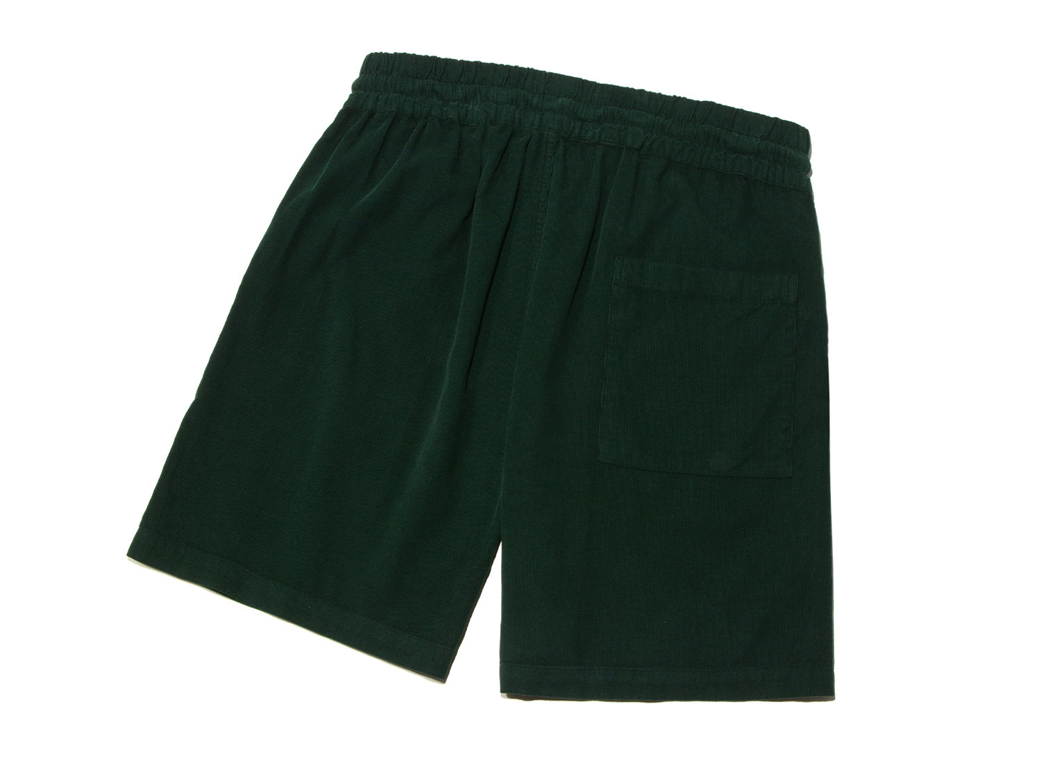 PORTUGUESE FLANNEL Cord Shorts Green. Short coupe regular confectionné dans un velours milleraies 100% coton. Longueur genoux. Ceinture élastique avec cordon de serrage. Poches côtés. Une poche plaquée au dos.
